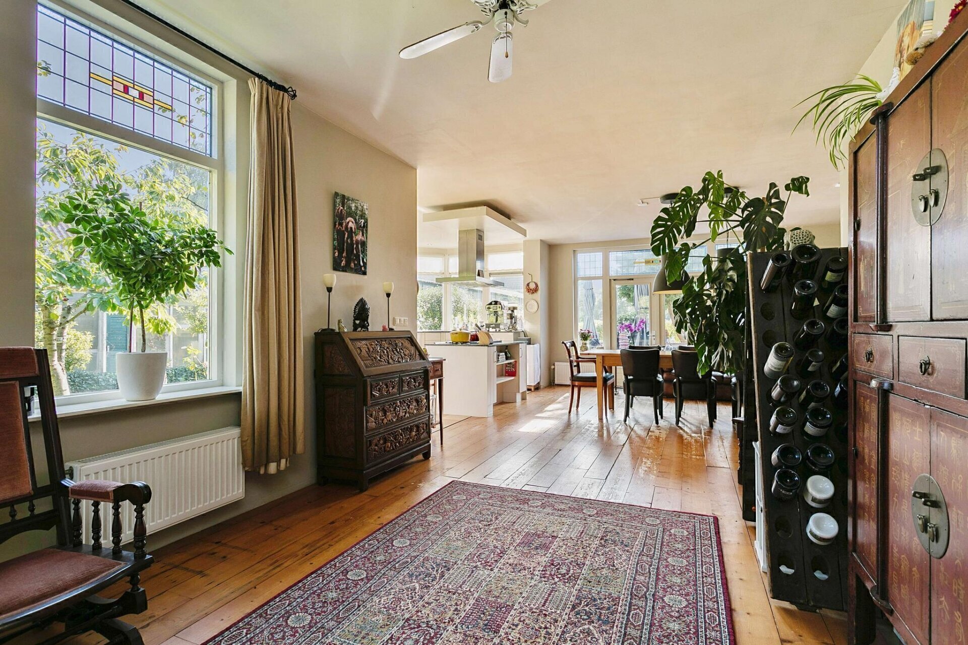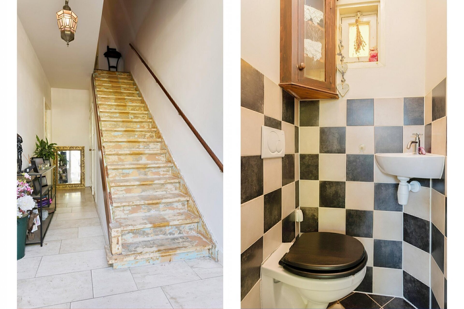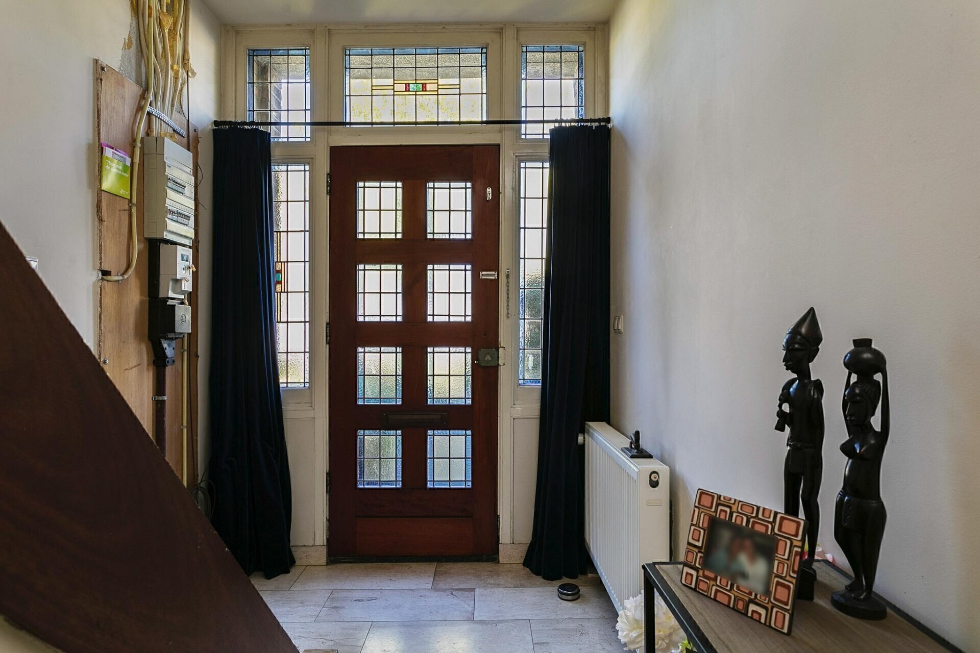 Imposante intreden met veel originele details zoals het “Melkmeisjes kozijn” met origineel glas in lood, het trappenhuis welk u toegang geeft nar de etage en tot de ruimtes op de begane grond. woning waaronder het toilet, de kelder en woonkamer.