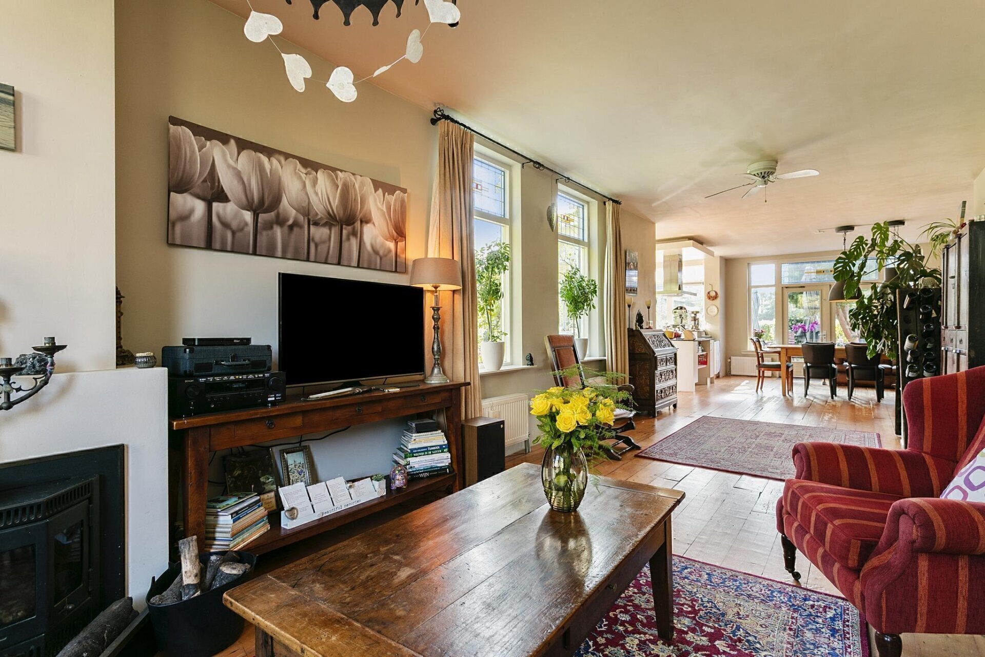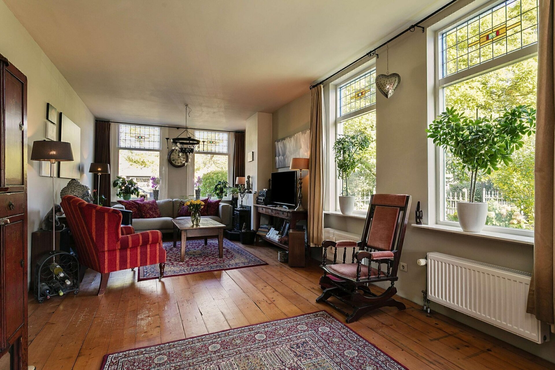 De royale woonkamer is voorzien van een houten afwerkvloer en een sfeervolle gezellige houtkachel. De raampartijen zijn grotendeels voorzien van dubbel glas en glas- in lood facetten. De ruimte wordt verwarmd door middel van radiatoren en vloerverwarming.