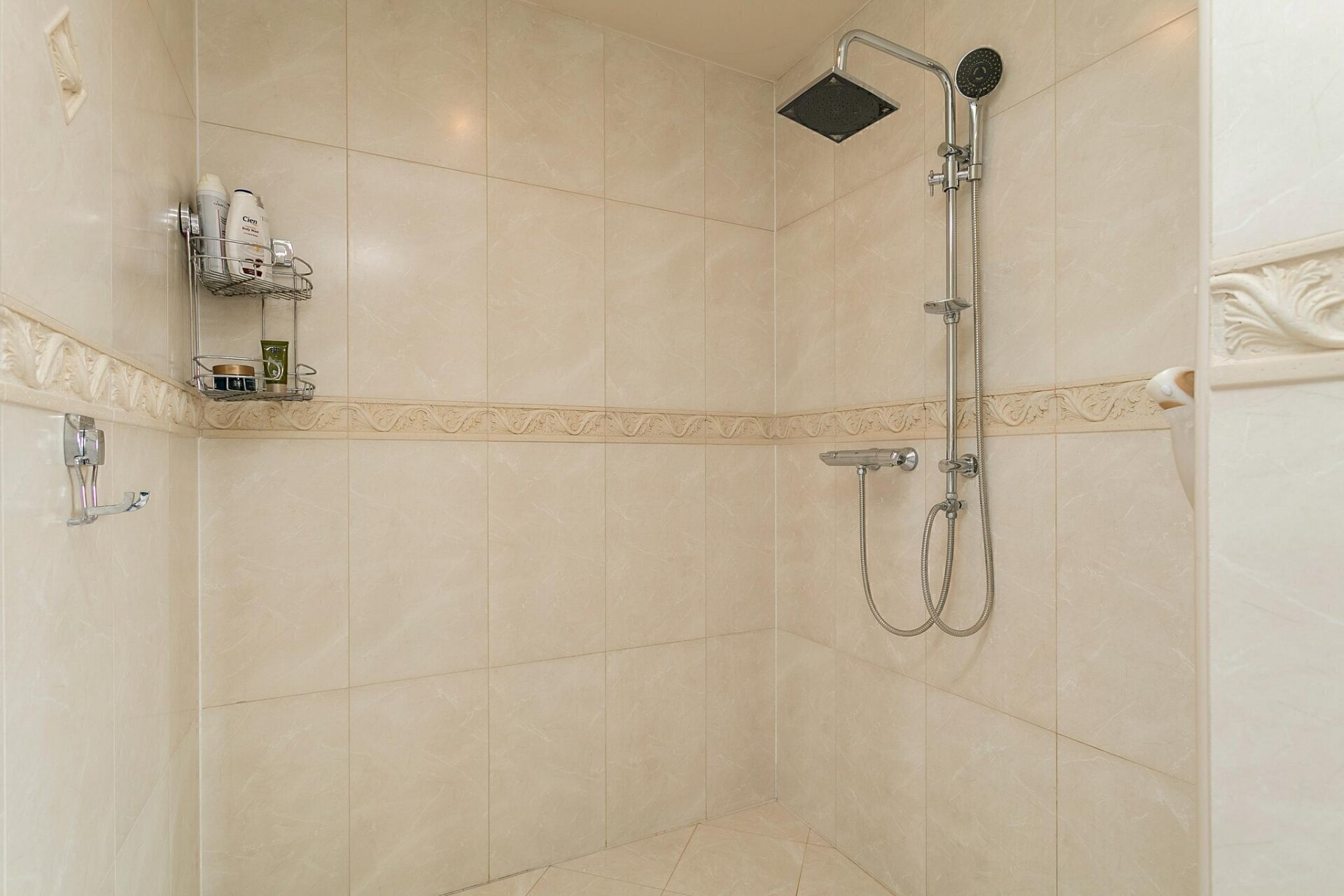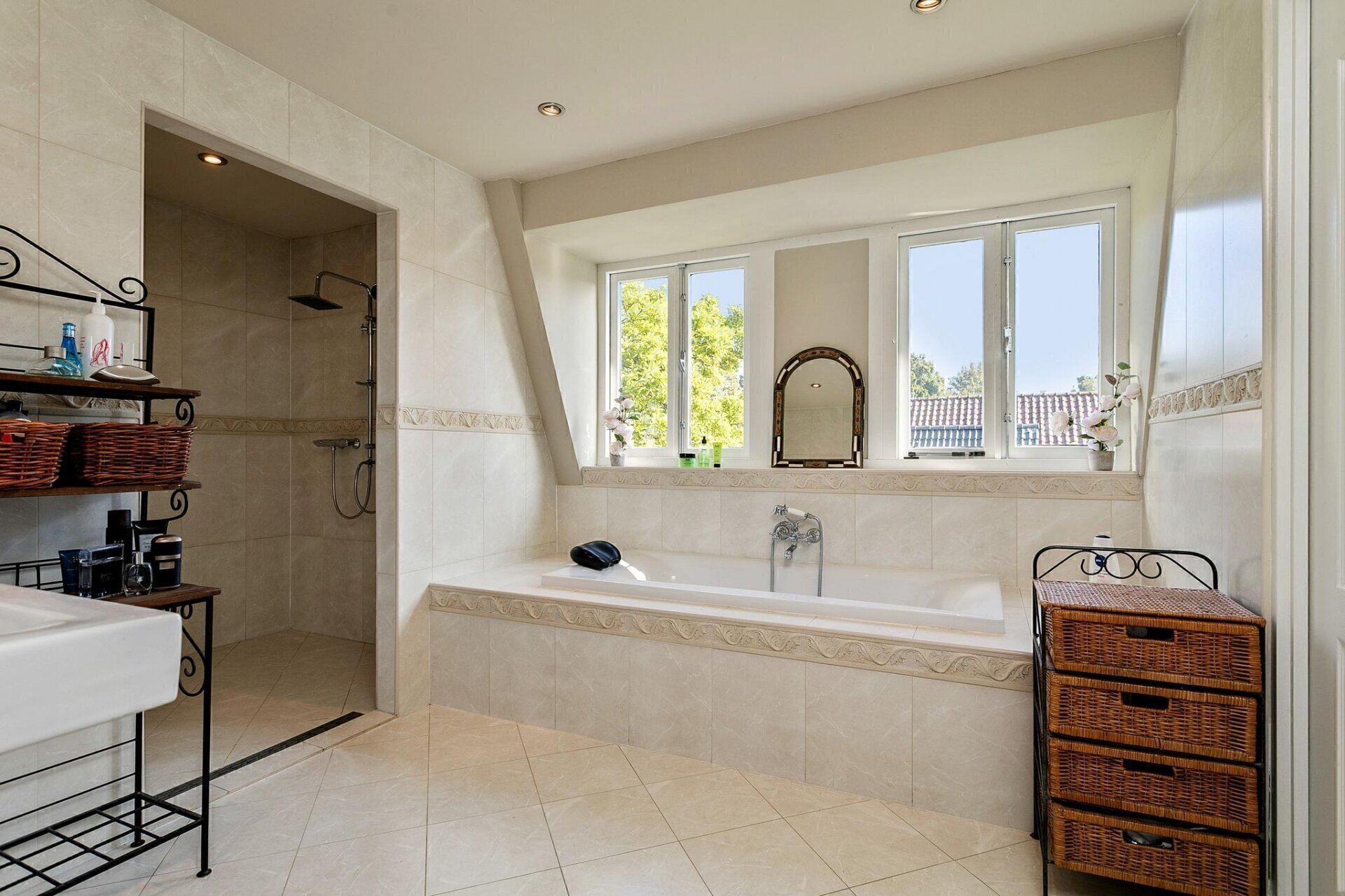 De badkamer is zowel via de hoofdslaapkamer als via de overloop toegankelijk. Het in 2007 geplaatste dakkapel zorgt voor veel licht inval. De badkamer is geheel betegeld, heeft een grote inloopdouche, ruim ligbad, dubbele wasbak en wordt verwarmd door middel van vloerverwarming en een design radiator.