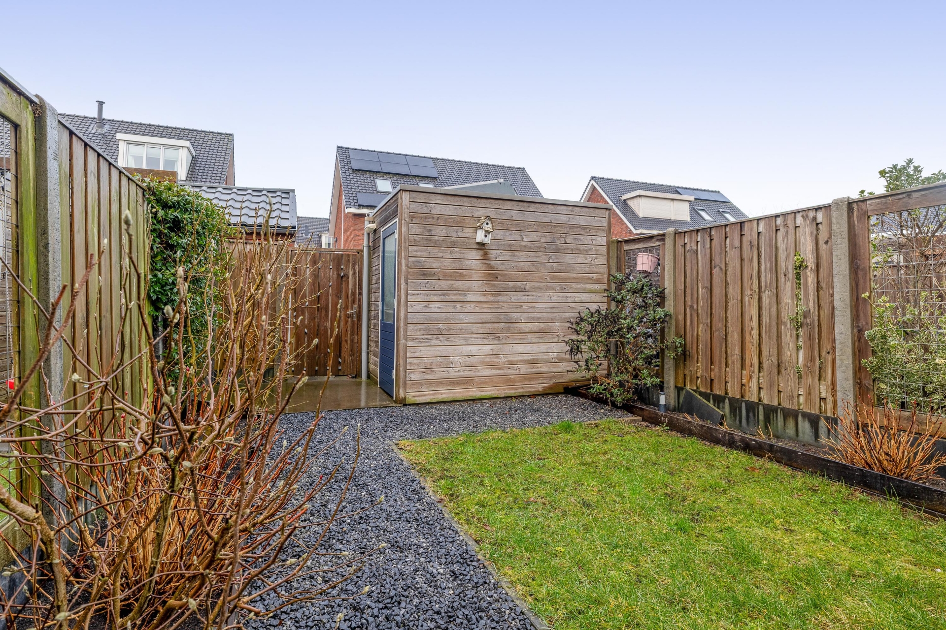De achtertuin is een fijne verlenging van de woonkamer. Gelegen op het westen geniet je hier van de middag- en avondzon. De tuin is verzorgd aangelegd en beschikt over twee onderheide terrassen. Het grootste terras, direct bij de schuifpui, biedt bovendien mogelijkheden voor een toekomstige uitbouw, wat deze woning extra interessant maakt voor wie nog verder wil vergroten. De tuin biedt voldoende ruimte voor een loungehoek én een eettafel. Achterin staat een vrijstaande berging, ideaal voor fietsen en tuingereedschap. Via de achterom is de tuin ook praktisch bereikbaar.