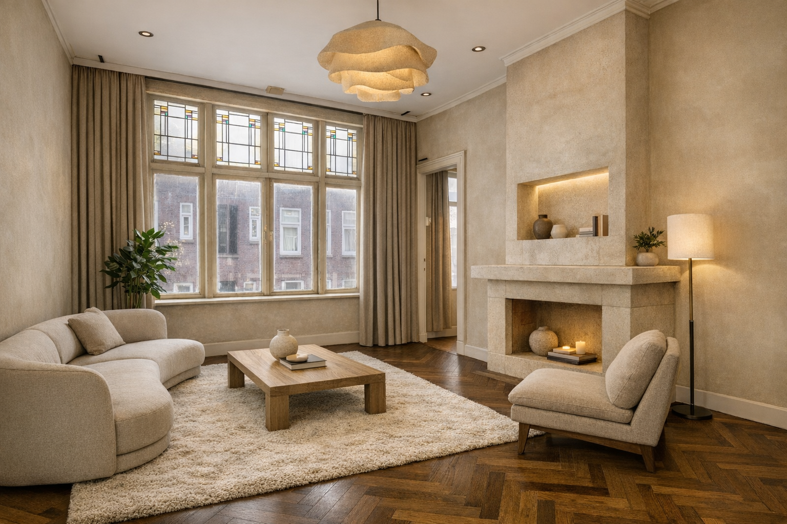 - Grote woonkamer met schuifpui en glas-in-lood details;