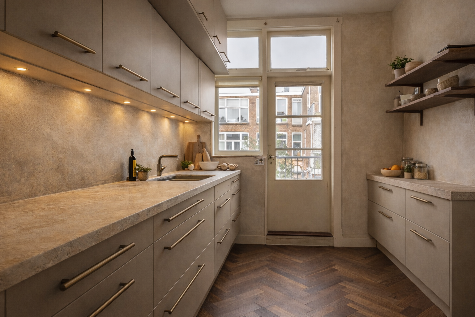 Naast de bijkeuken ligt de keuken, voorzien van een vaste inbouwkast. Deze ruimte biedt extra mogelijkheden, bijvoorbeeld voor het creëren van een grotere badkamer of nog een extra slaapkamer.