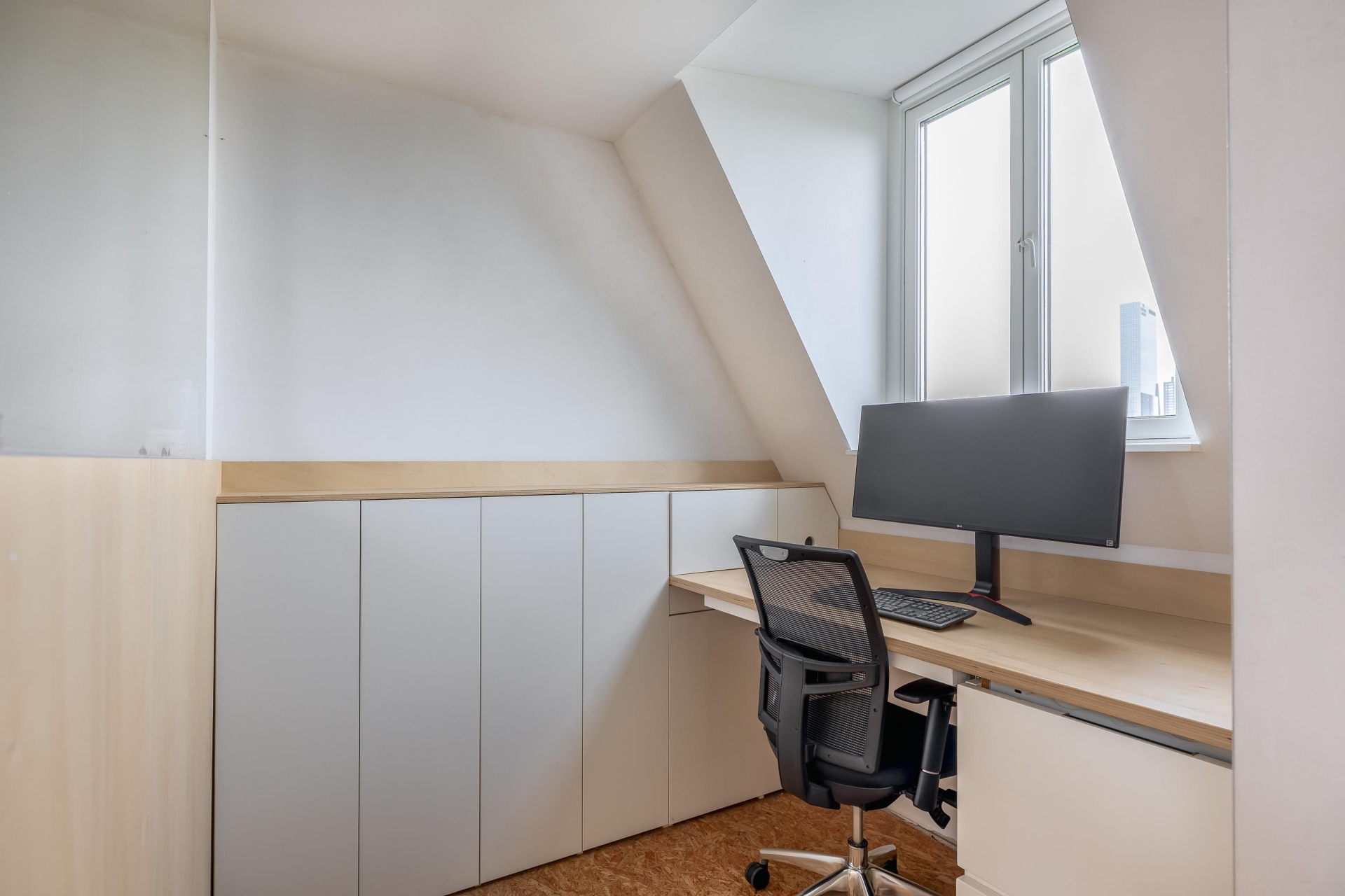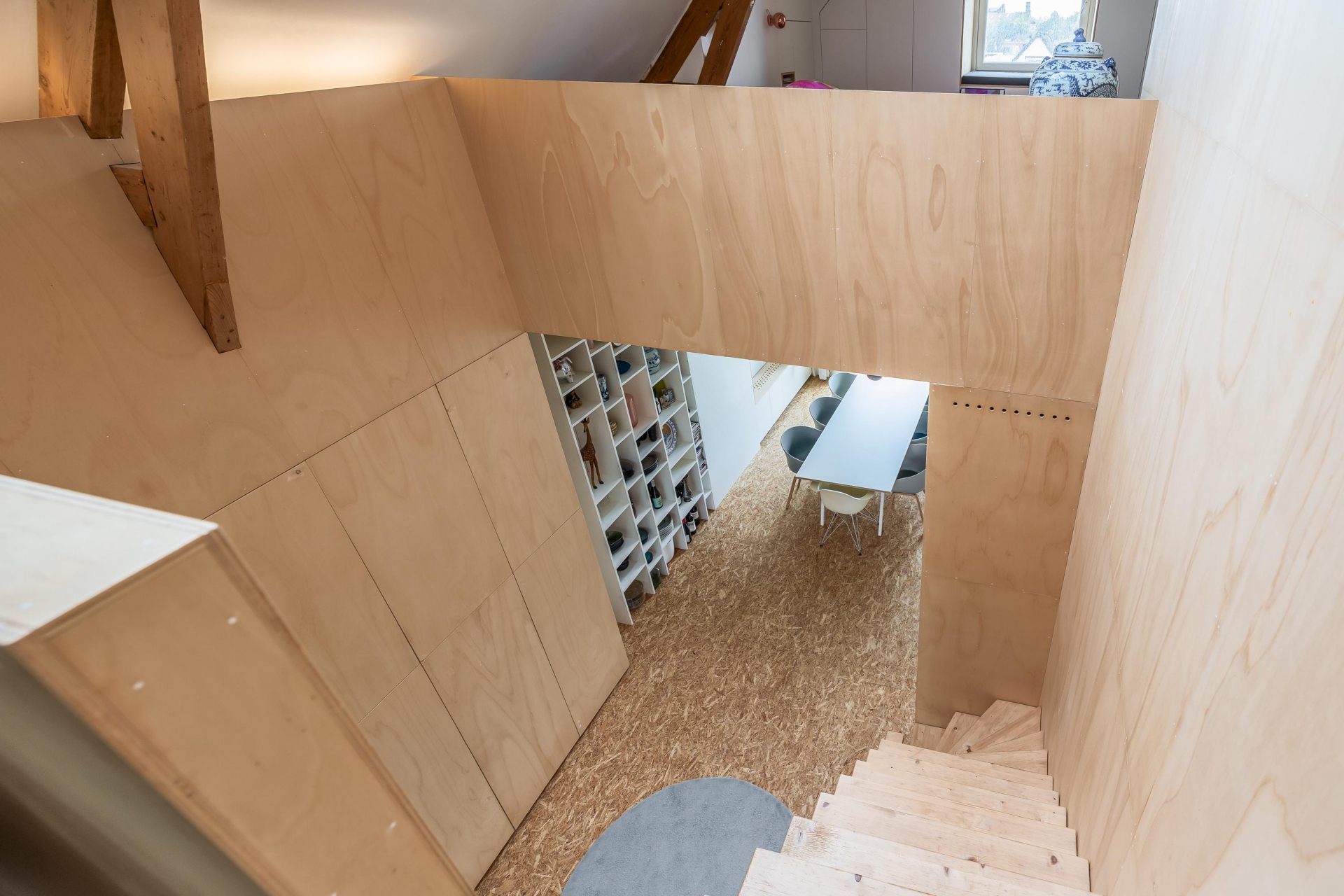 De derde verdieping is één grote open leefruimte met een moderne keuken aan de voorzijde en een sfeervolle woonkamer aan de achterzijde, waar de schuifpui je leidt naar het terras. De houten trap en vide zorgen voor een indrukwekkend ruimtelijk effect. Dankzij de open verbinding met de vierde verdieping valt het daglicht vanuit meerdere kanten binnen en ontstaat er een fijn gevoel van contact tussen de verdiepingen.