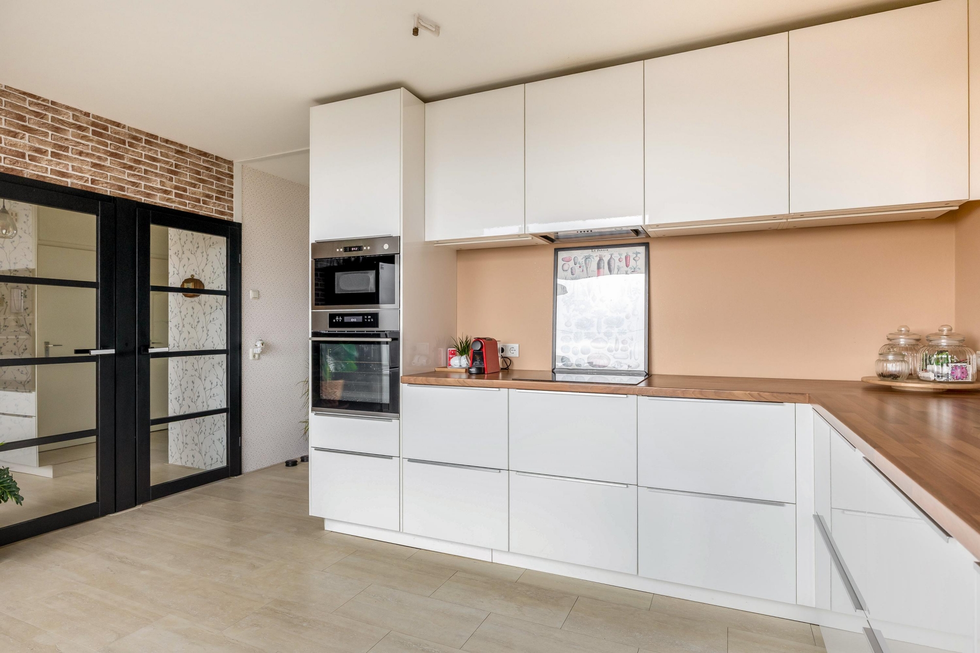 Wat direct opvalt wanneer je binnenkomt in de woonkamer door de prachtige deuren, is de ruime en lichte woonkamer. Dankzij de grote raampartijen valt het daglicht rijkelijk naar binnen. De woonkamer biedt meer dan genoeg plek voor een royale zithoek én een aparte eethoek.