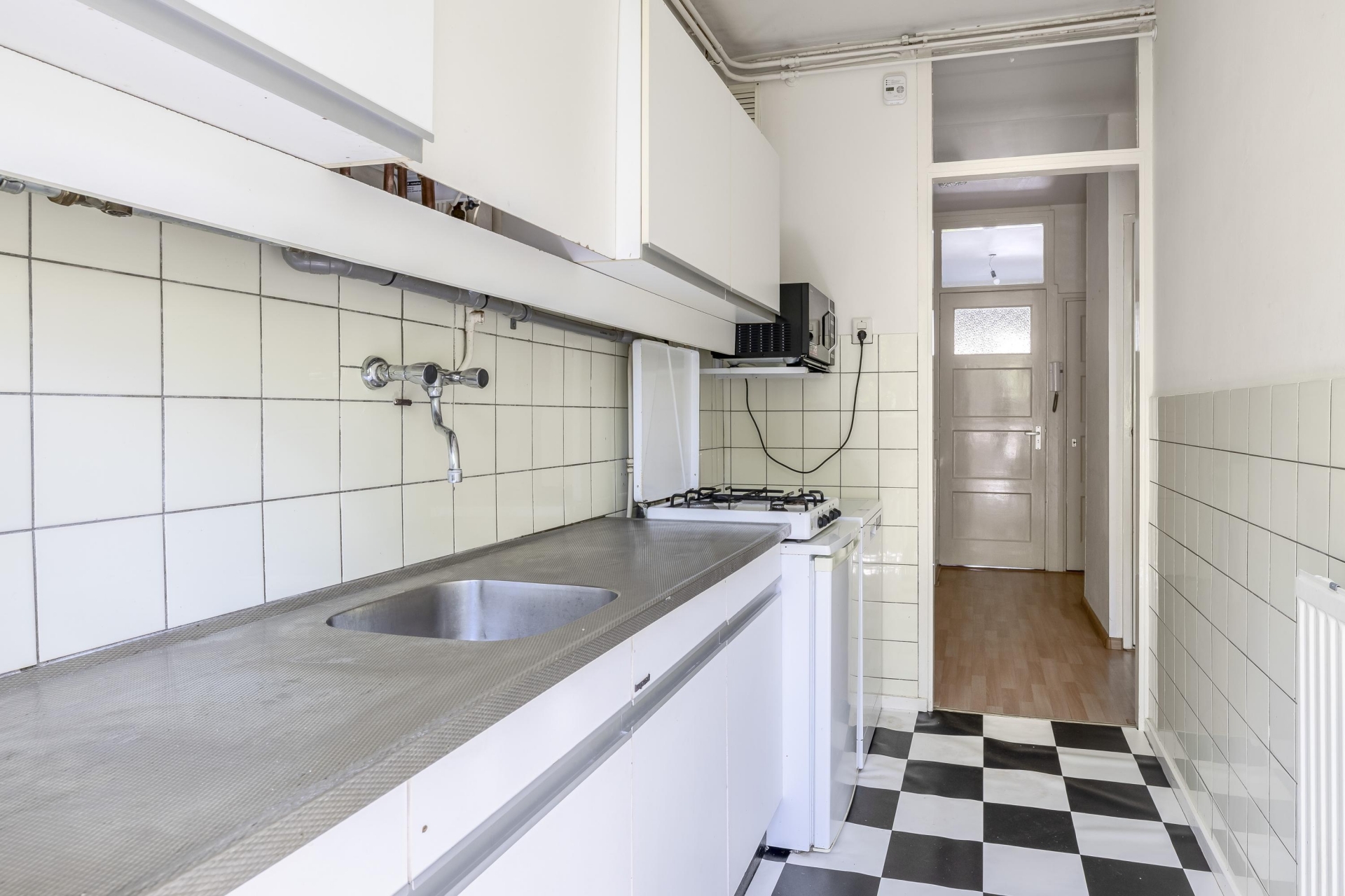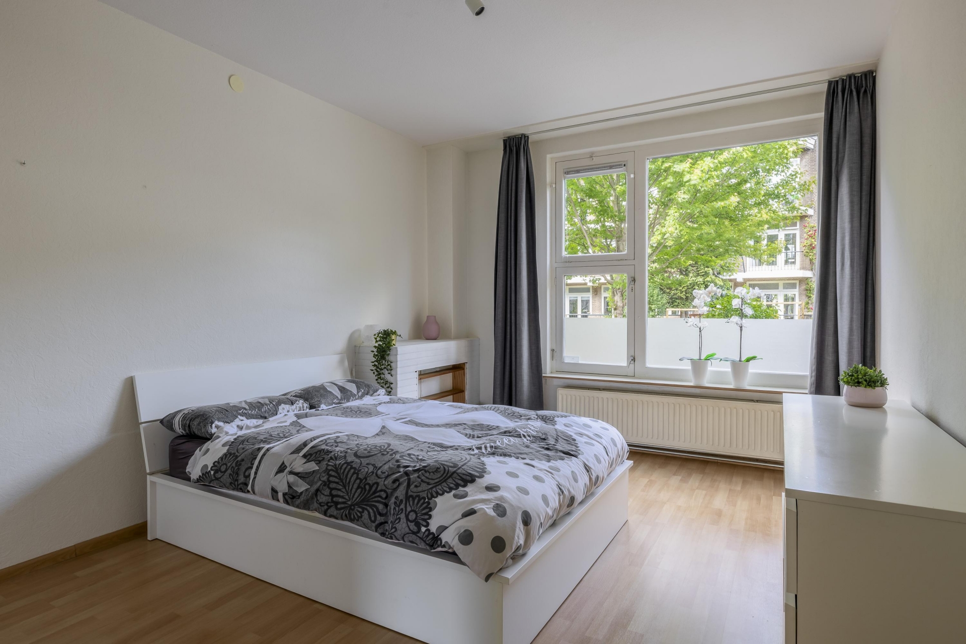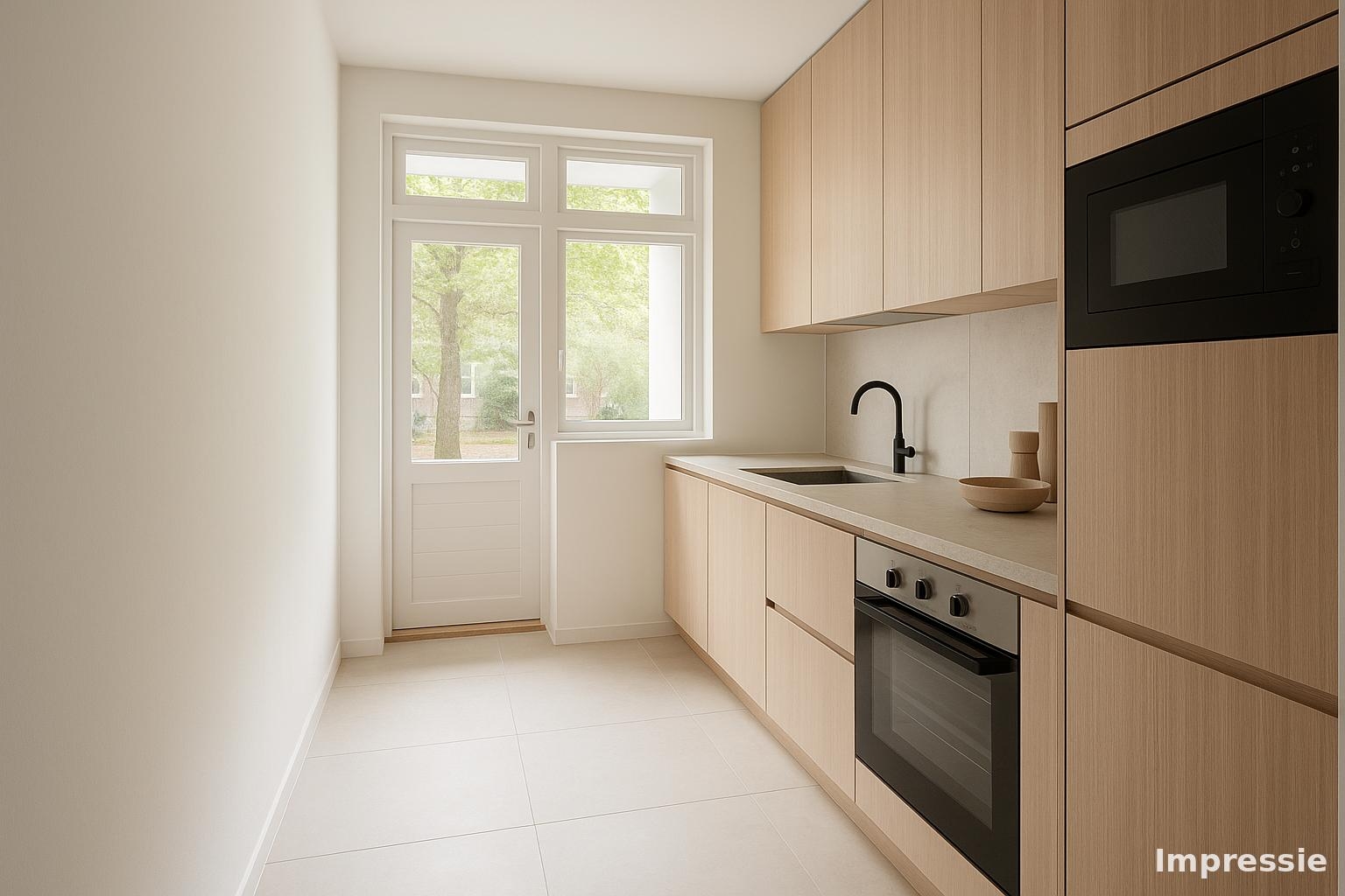 De ruime woonkamer ligt aan de rustige achterzijde en profiteert van een mooie plafondhoogte van 2.77 meter. De grote ramen zorgen voor een fijne lichtinval. De aparte keuken is praktisch ingedeeld, heeft toegang tot het balkon én is voorzien van een keukenblok met RVS werkblad. Hier kook je met plezier, met uitzicht op het groen. Extra fijn: ook de woonkamer en slaapkamer 2 geven toegang tot het balkon. En er is glasvezel aanwezig.