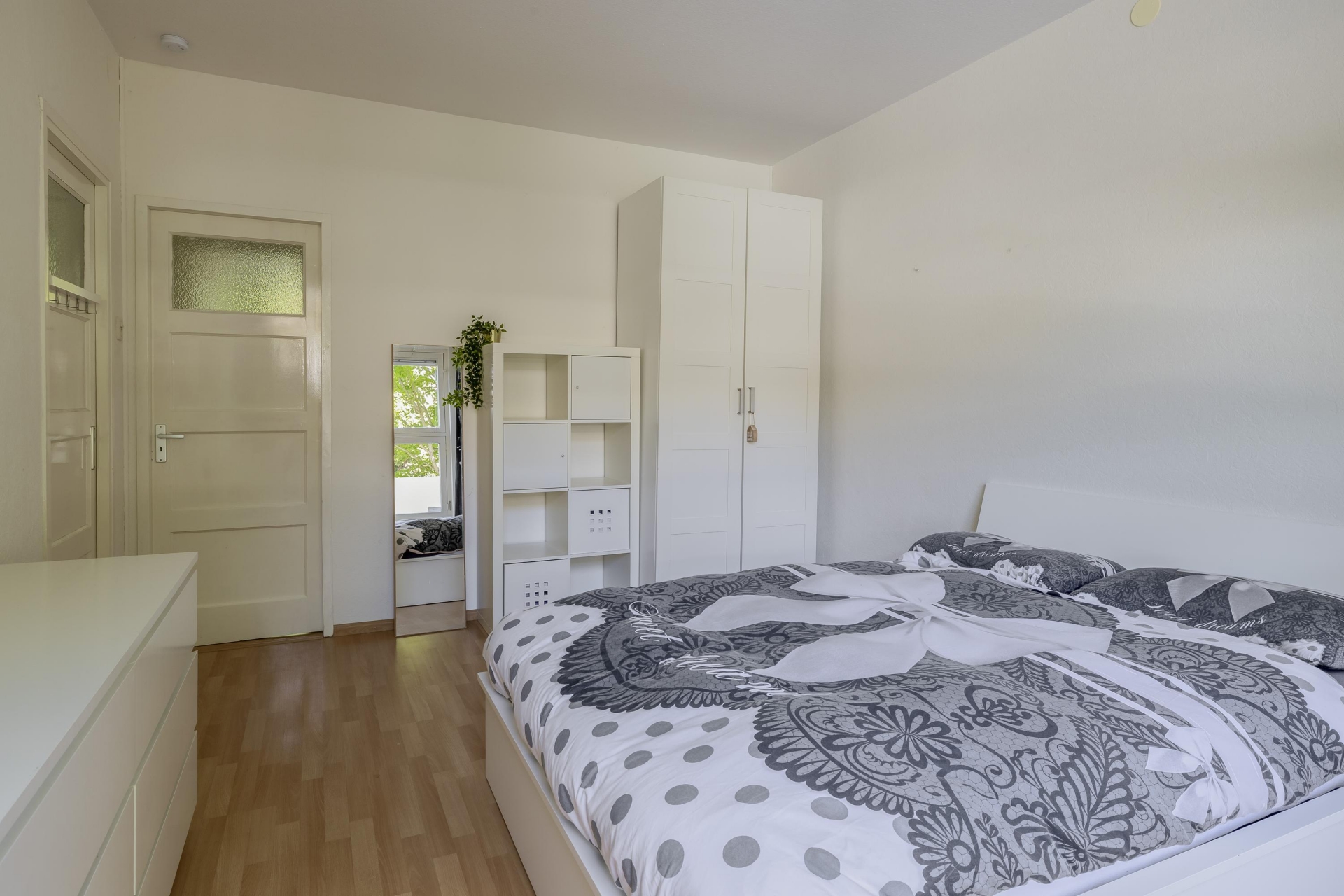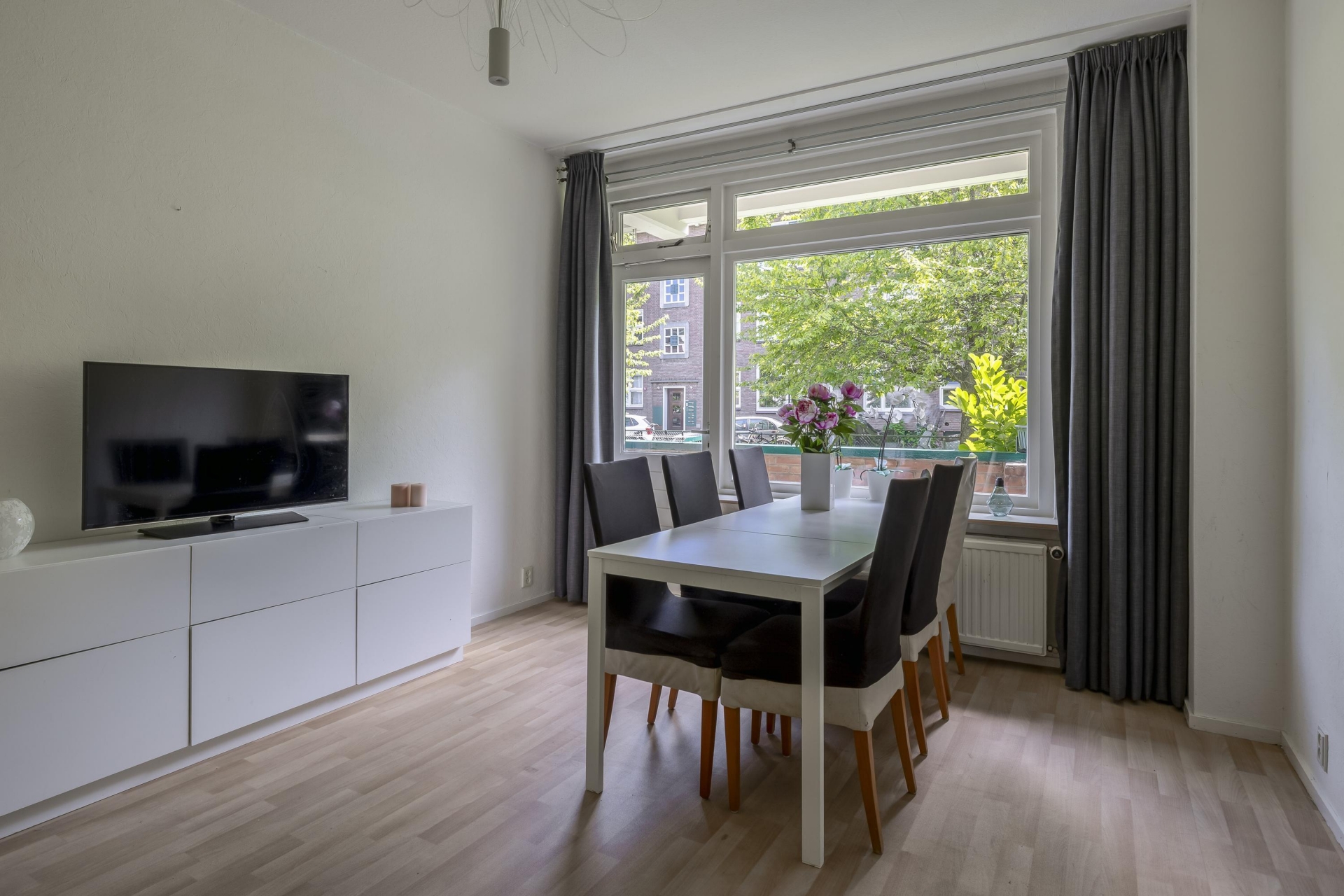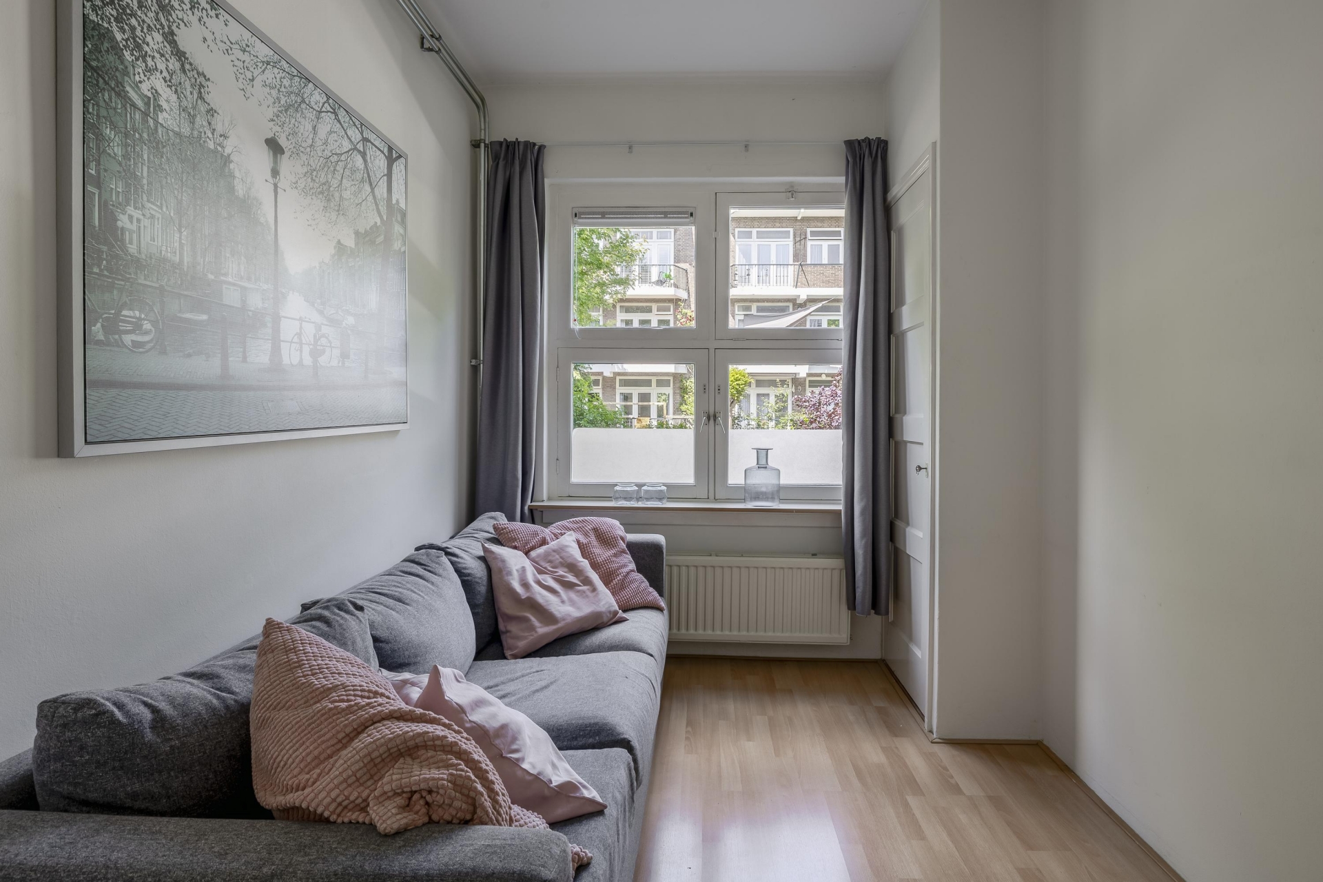 De ruime woonkamer ligt aan de rustige achterzijde en profiteert van een mooie plafondhoogte van 2.77 meter. De grote ramen zorgen voor een fijne lichtinval. De aparte keuken is praktisch ingedeeld, heeft toegang tot het balkon én is voorzien van een keukenblok met RVS werkblad. Hier kook je met plezier, met uitzicht op het groen. Extra fijn: ook de woonkamer en slaapkamer 2 geven toegang tot het balkon. En er is glasvezel aanwezig.