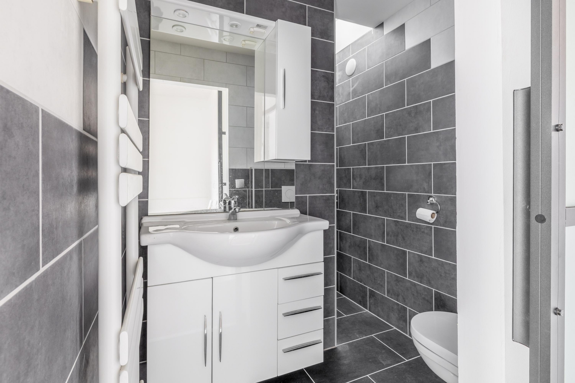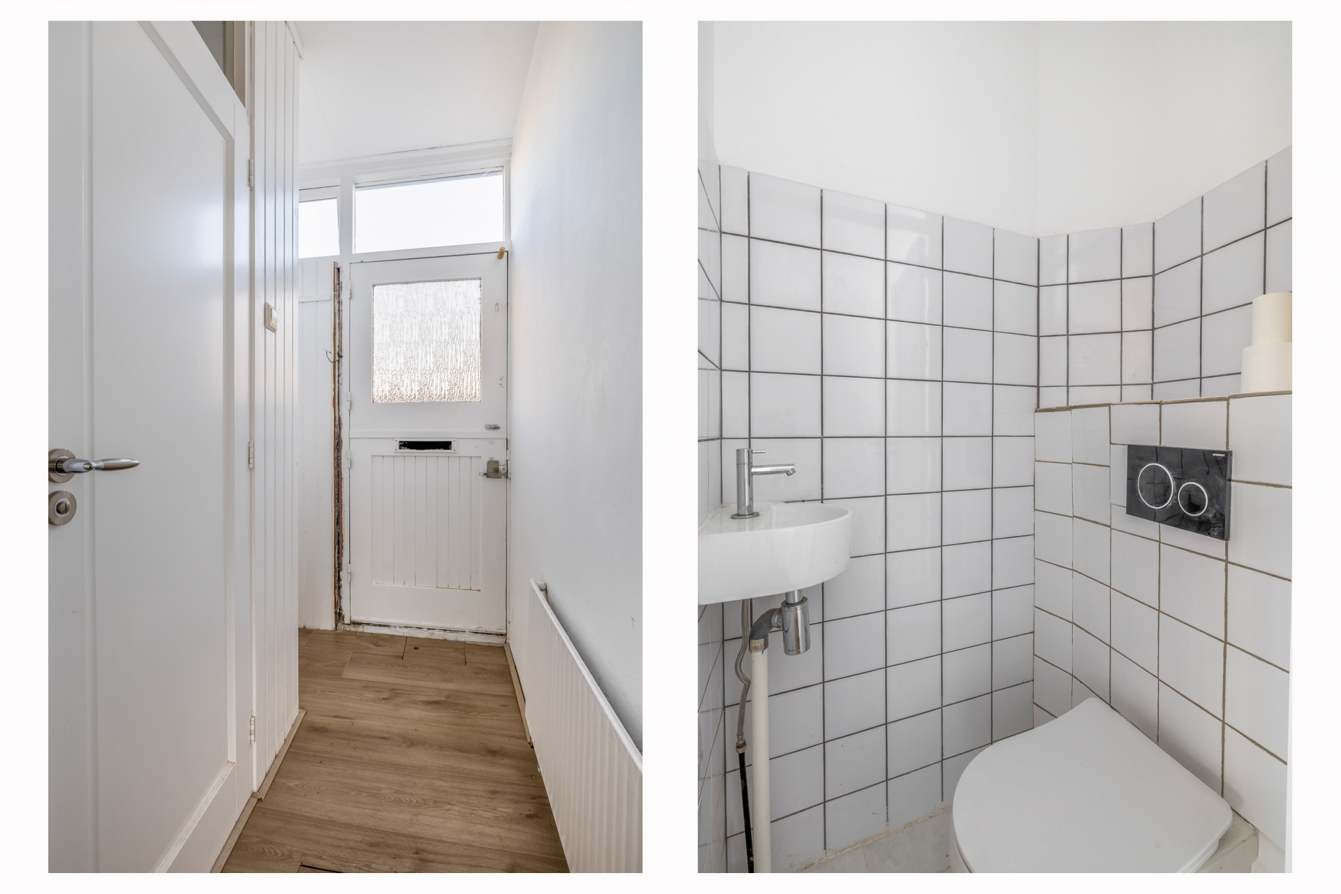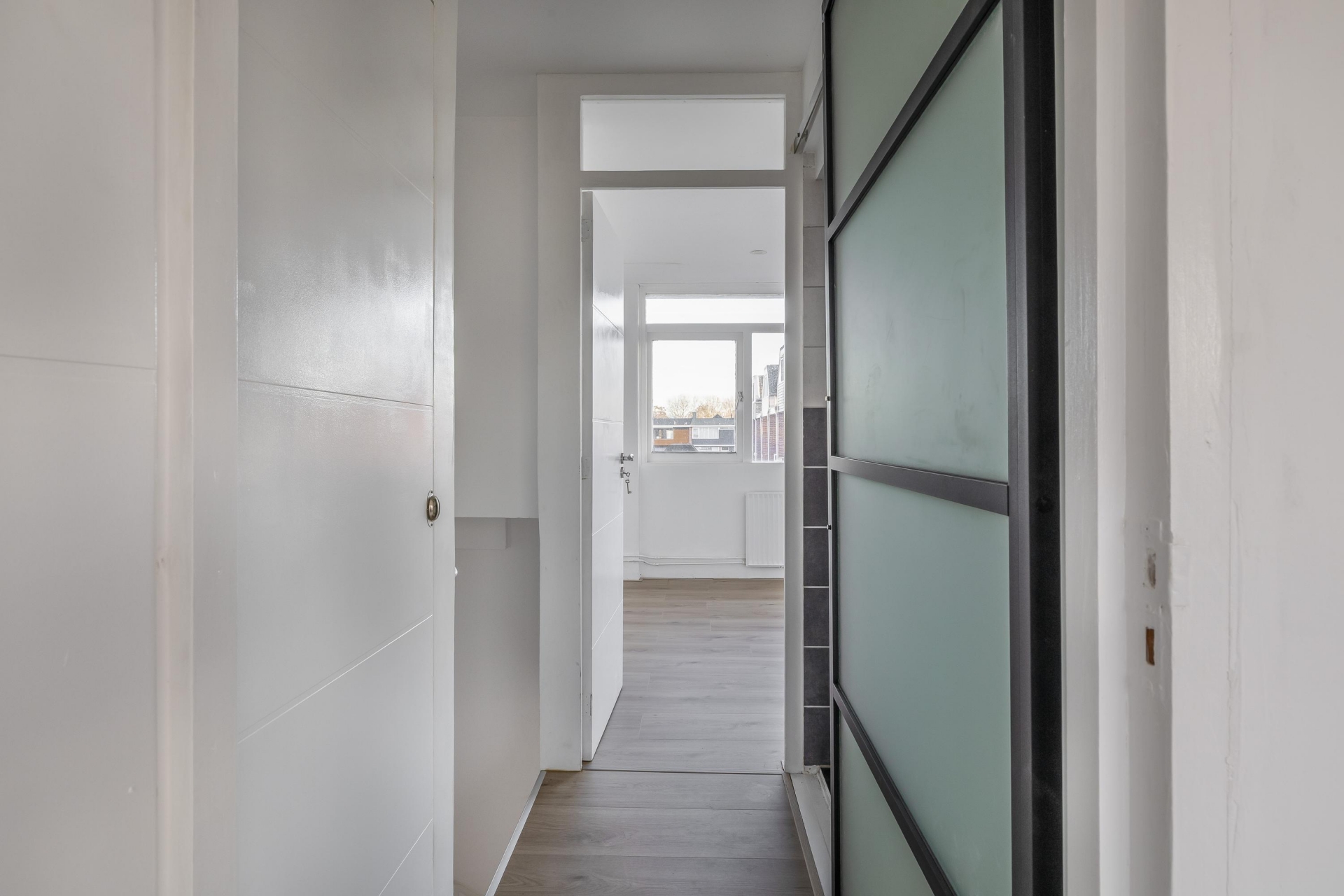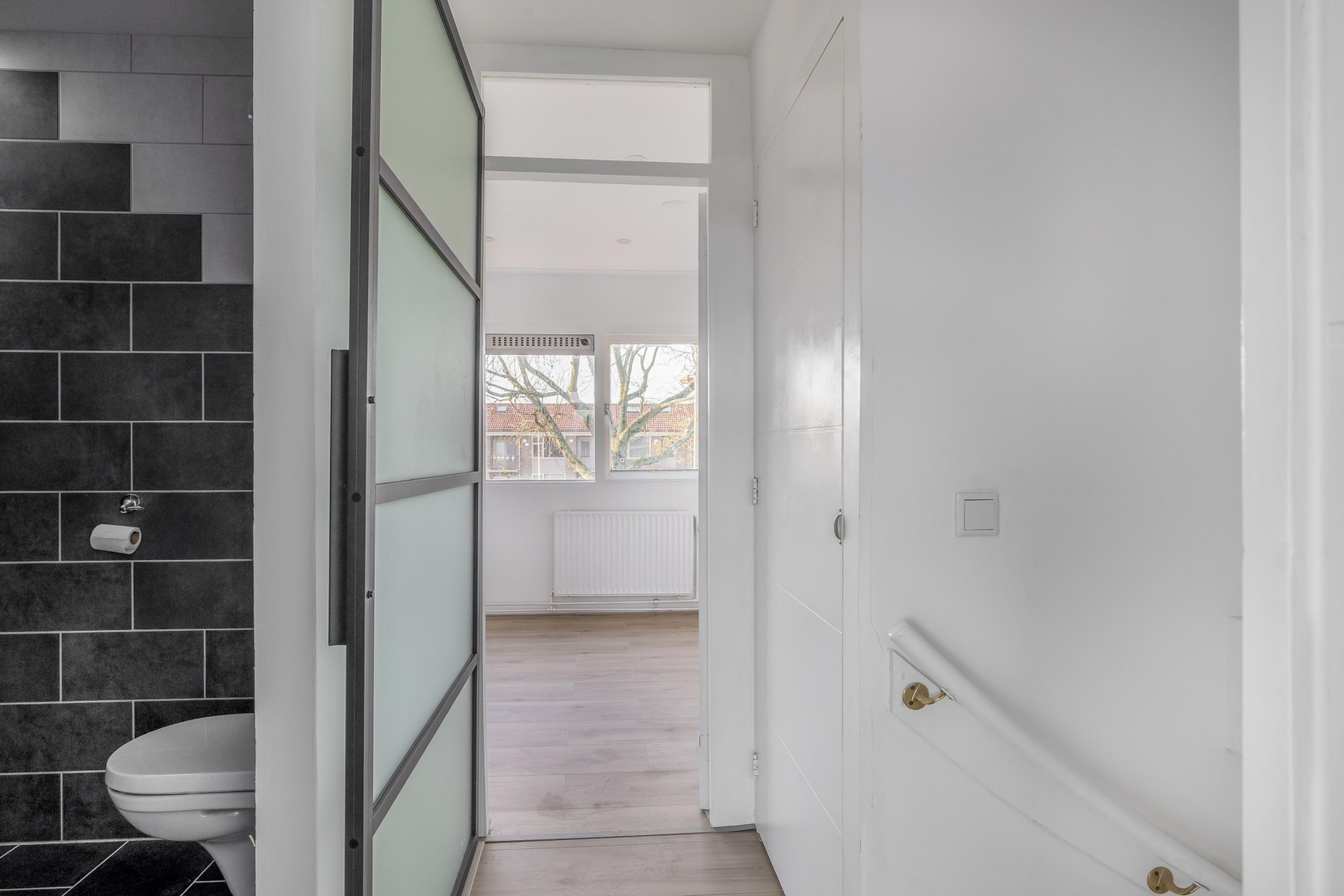 Op de eerste verdieping bevinden zich twee goed bemeten slaapkamers. De grootste ligt aan de voorzijde van het huis en biedt meer dan genoeg ruimte voor een tweepersoonsbed en kledingkast. De tweede slaapkamer aan de achterzijde is ook volwaardig, en ideaal als logeer-, werk- of kinderkamer. De badkamer is een prettig extraatje in dit huis: deze is namelijk vergroot, waardoor er nu ruimte is voor een douche, wastafel en toilet – strak afgewerkt en klaar voor gebruik.