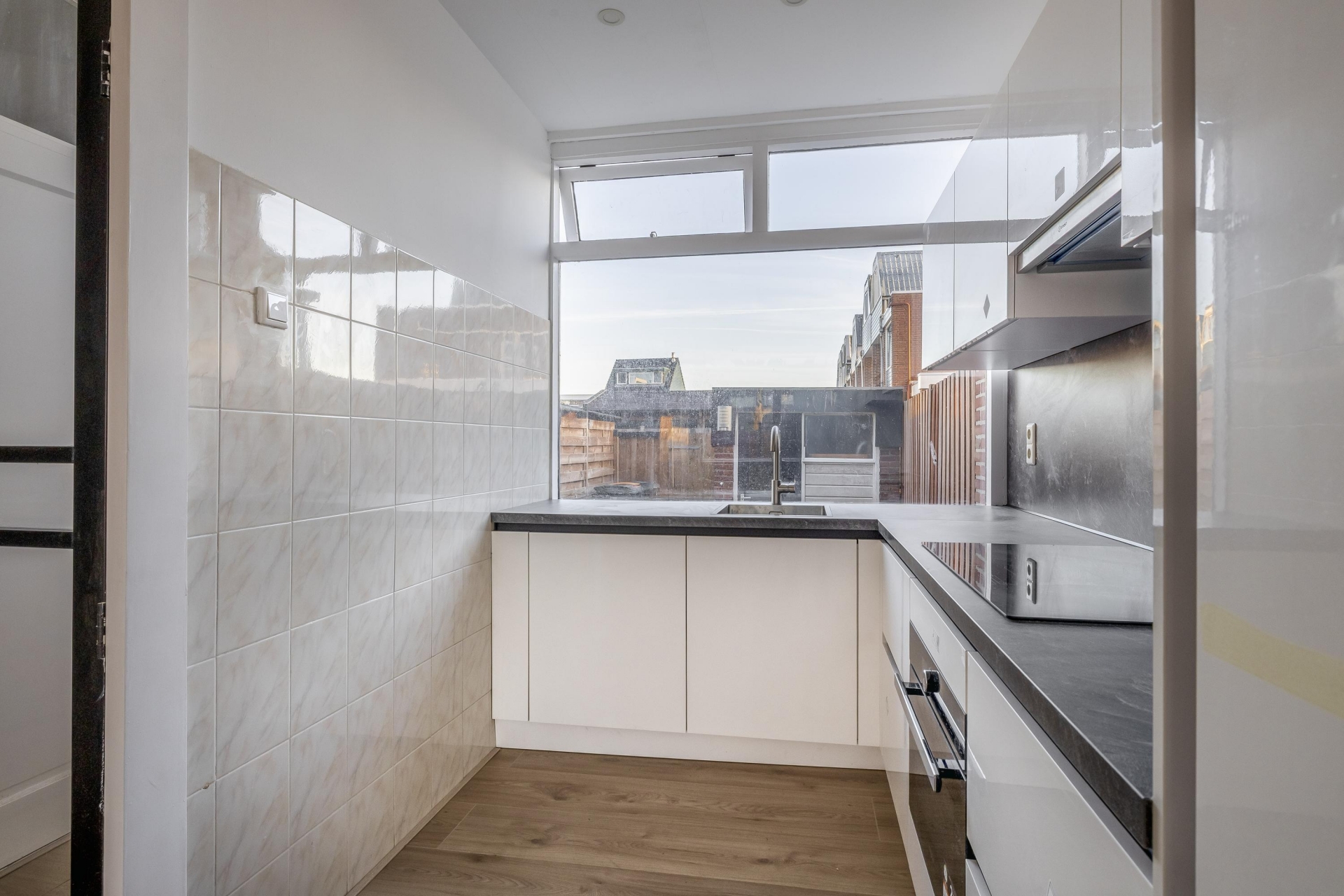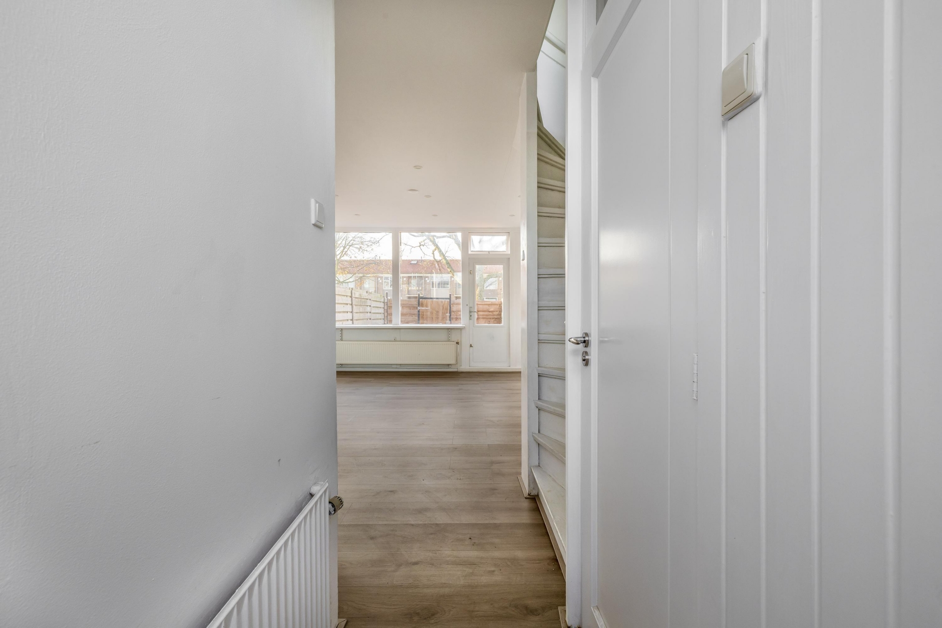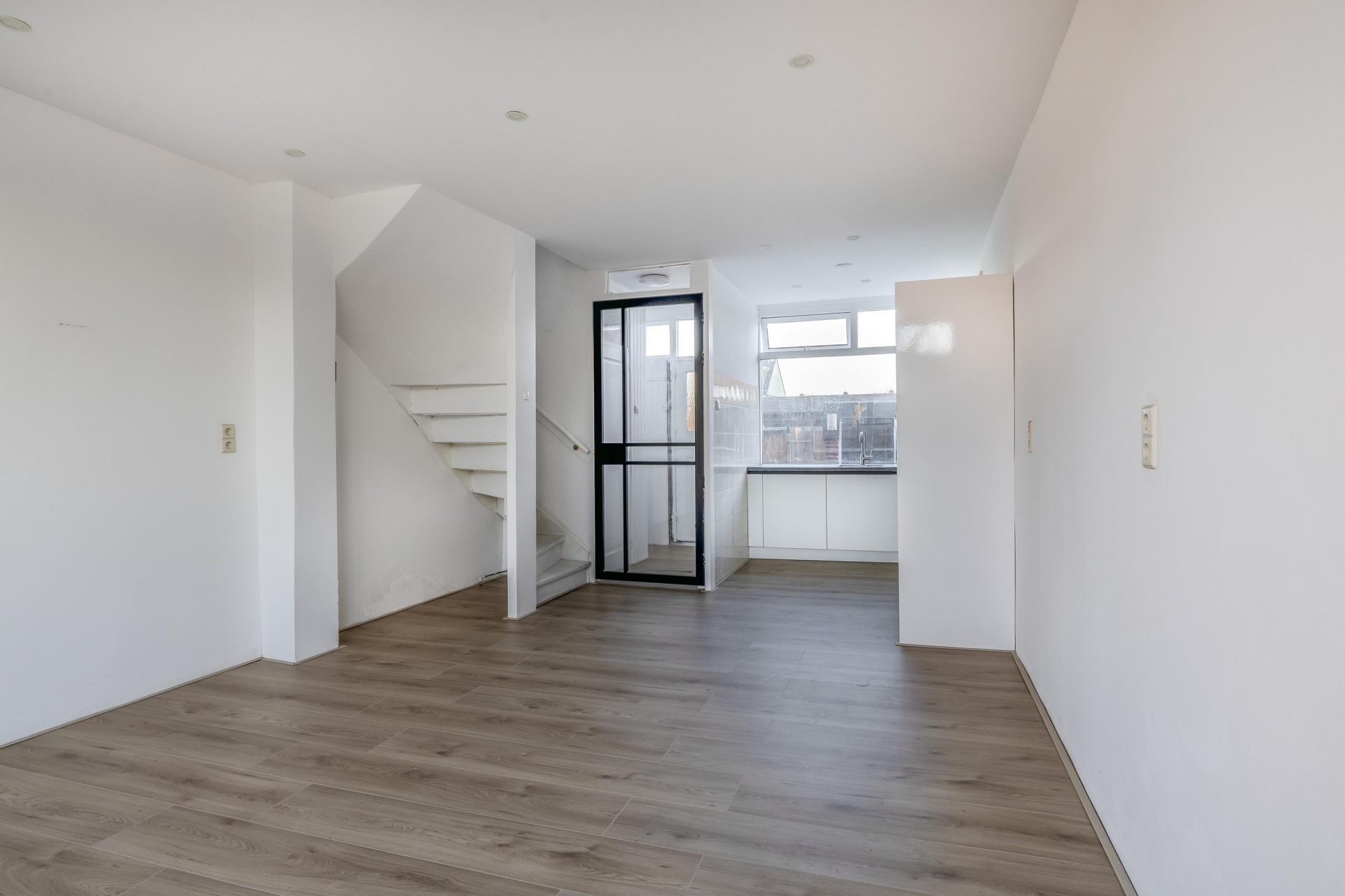 Zodra je binnenkomt valt de open indeling direct op. De woonkamer is lekker licht dankzij de grote raampartijen aan de voor- en achterzijde, en biedt genoeg plek voor een zithoek en een eettafel. De moderne keuken aan de voorzijde is recent vernieuwd en voorzien van een strak, greeploos ontwerp met veel opbergruimte en inbouwapparatuur. Dankzij het grote raam kijk je uit op de achtertuin en stap je via een deur zo je achtertuin in.