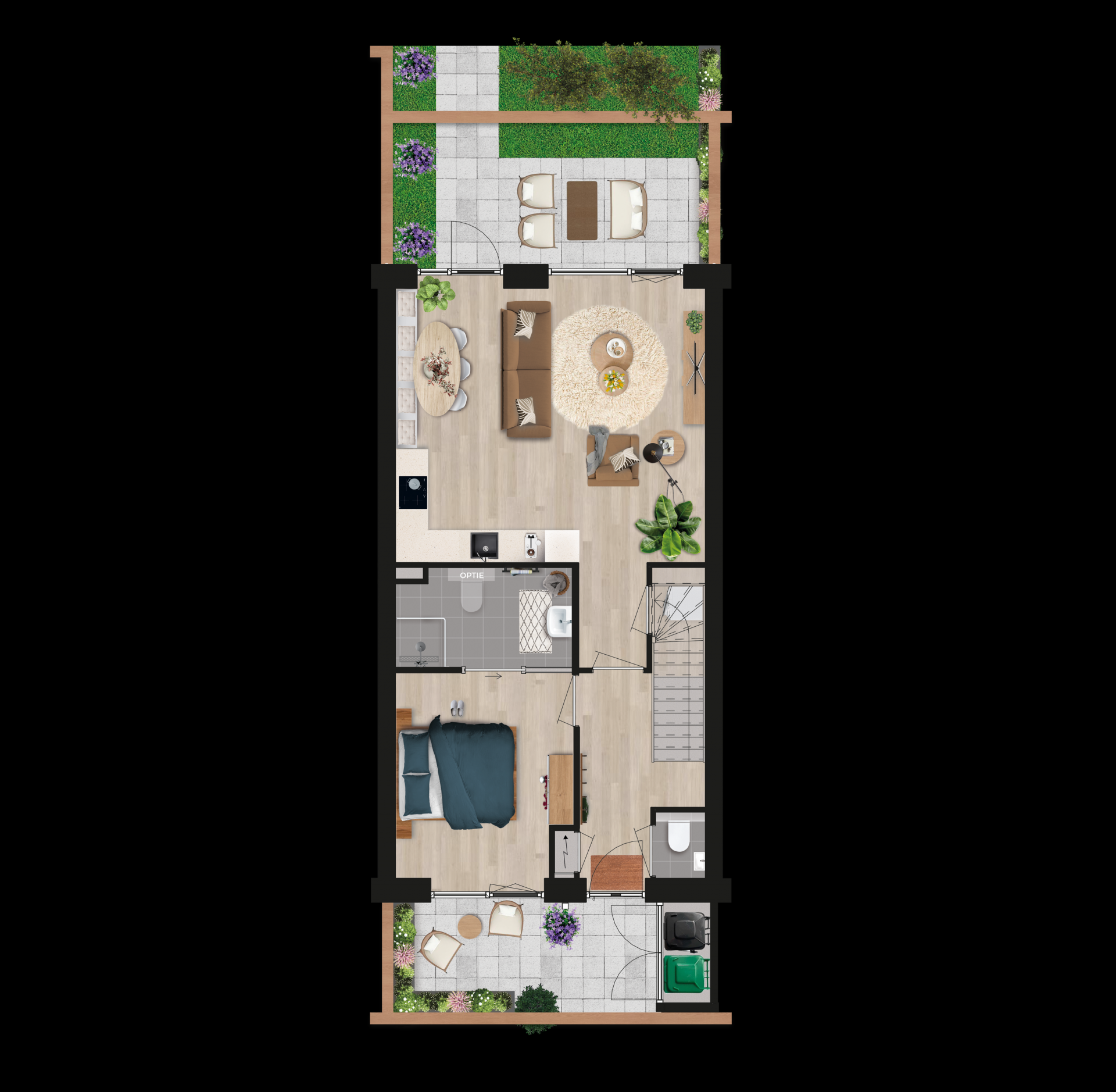 - Collectieve hof aan de voorzijde én uw eigen privé terras aan de achterzijde