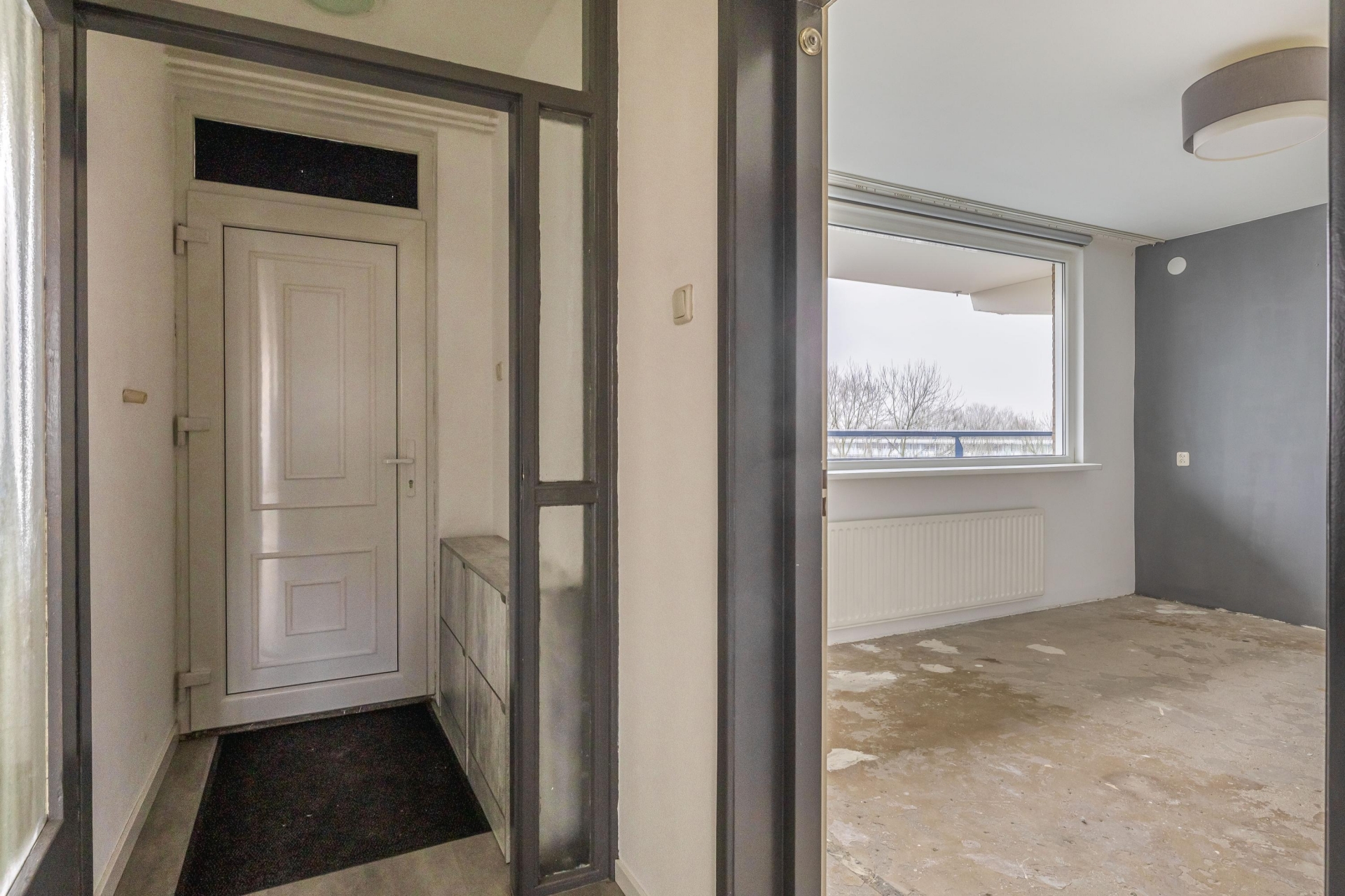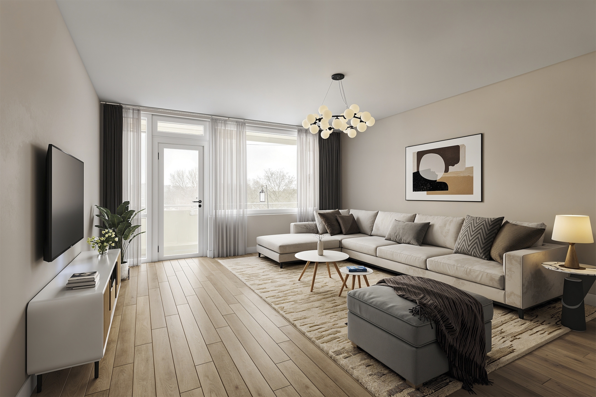 De ruime woonkamer ligt aan de achterzijde en is dankzij de grote raampartij op het zuidwesten heerlijk licht. Vanuit hier heb je een vrij uitzicht en stap je direct het balkon op: een fijne verlenging van de leefruimte.