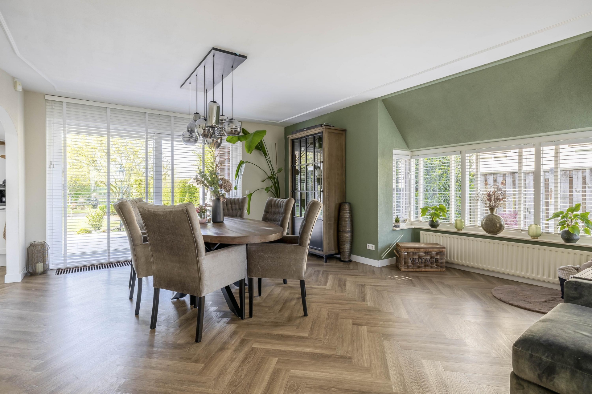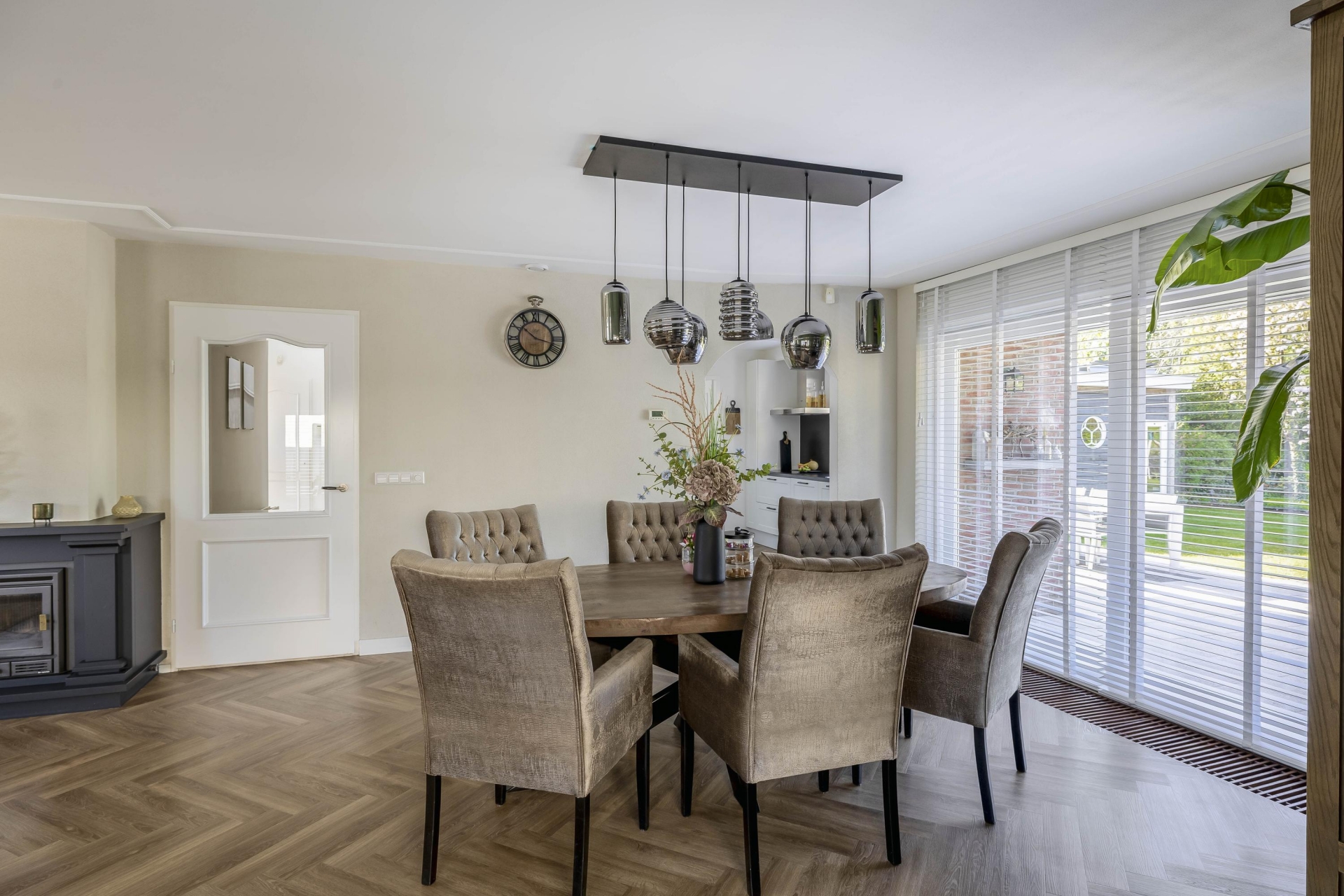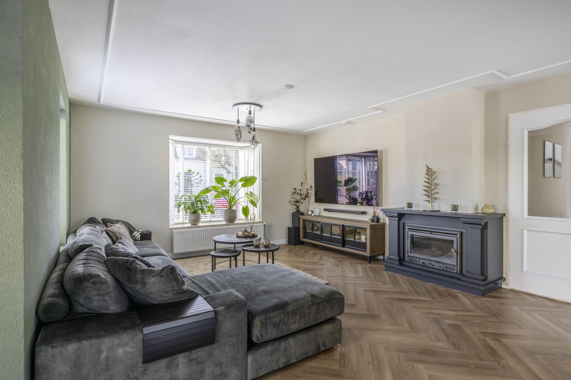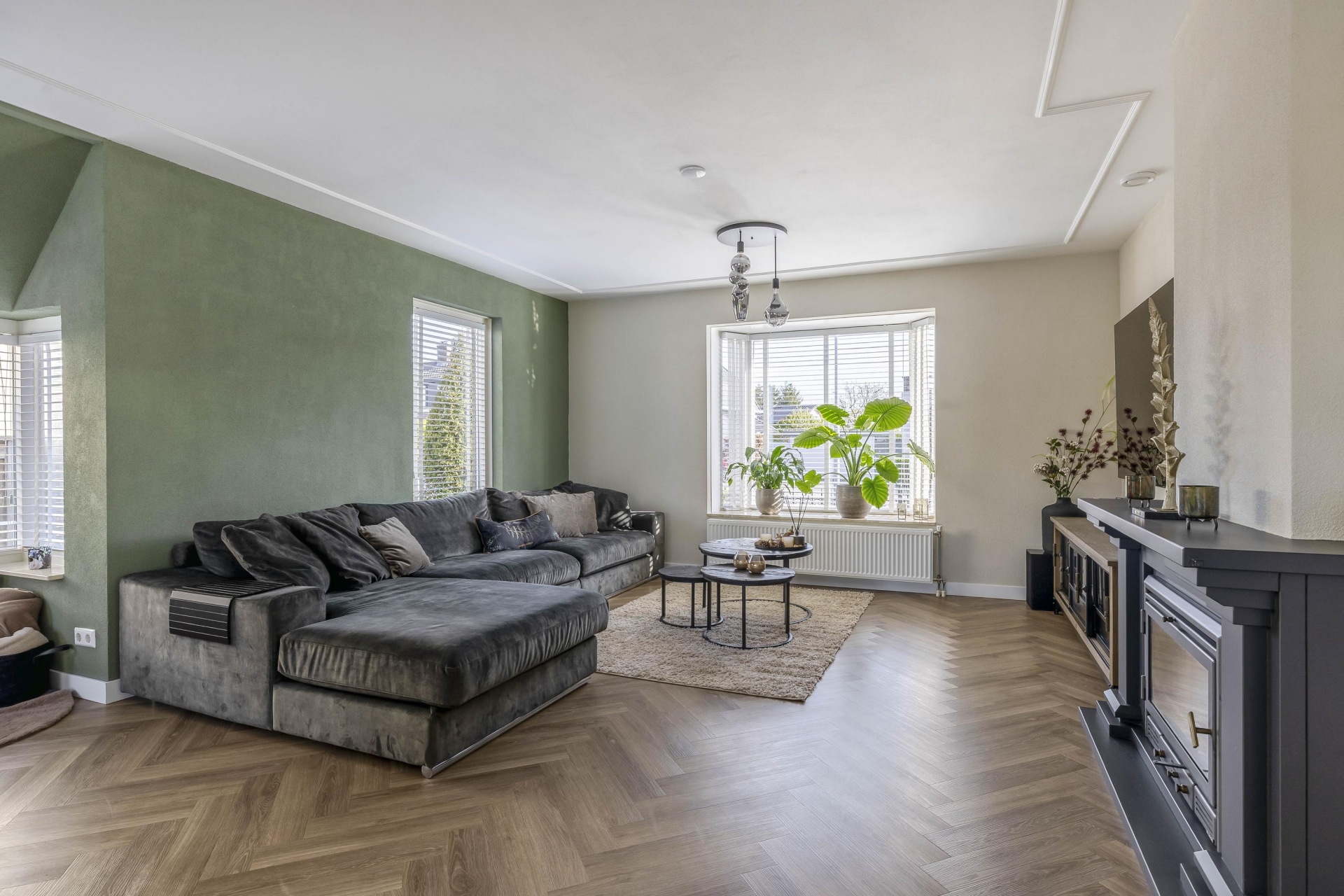 - Royale living met visgraat vloer en haard;