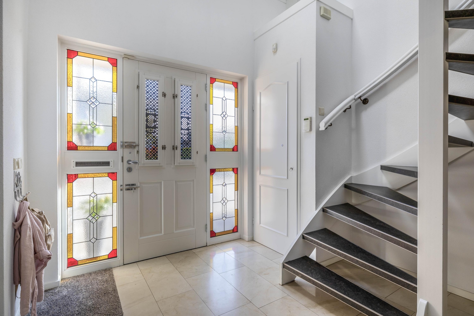 Bij binnenkomst komt u in de lichte en sfeervolle entree met vide en glas-in-loodramen welke toegang geeft tot de slaapkamer en badkamer op de begane grond, de woonkamer, een separaat toilet en tot de trapopgang naar de eerste verdieping.