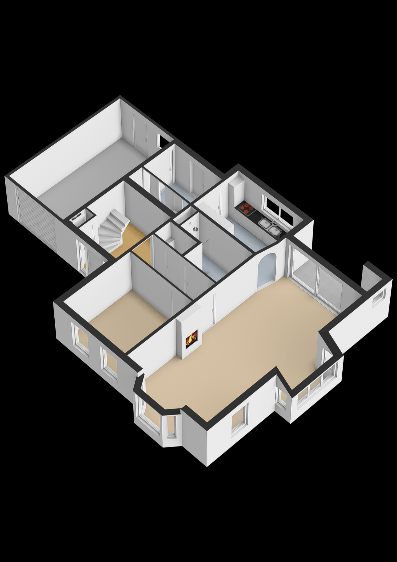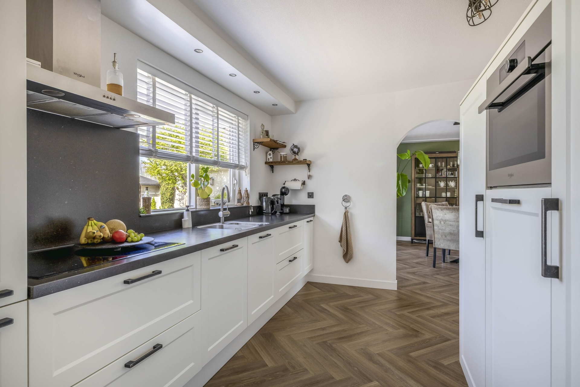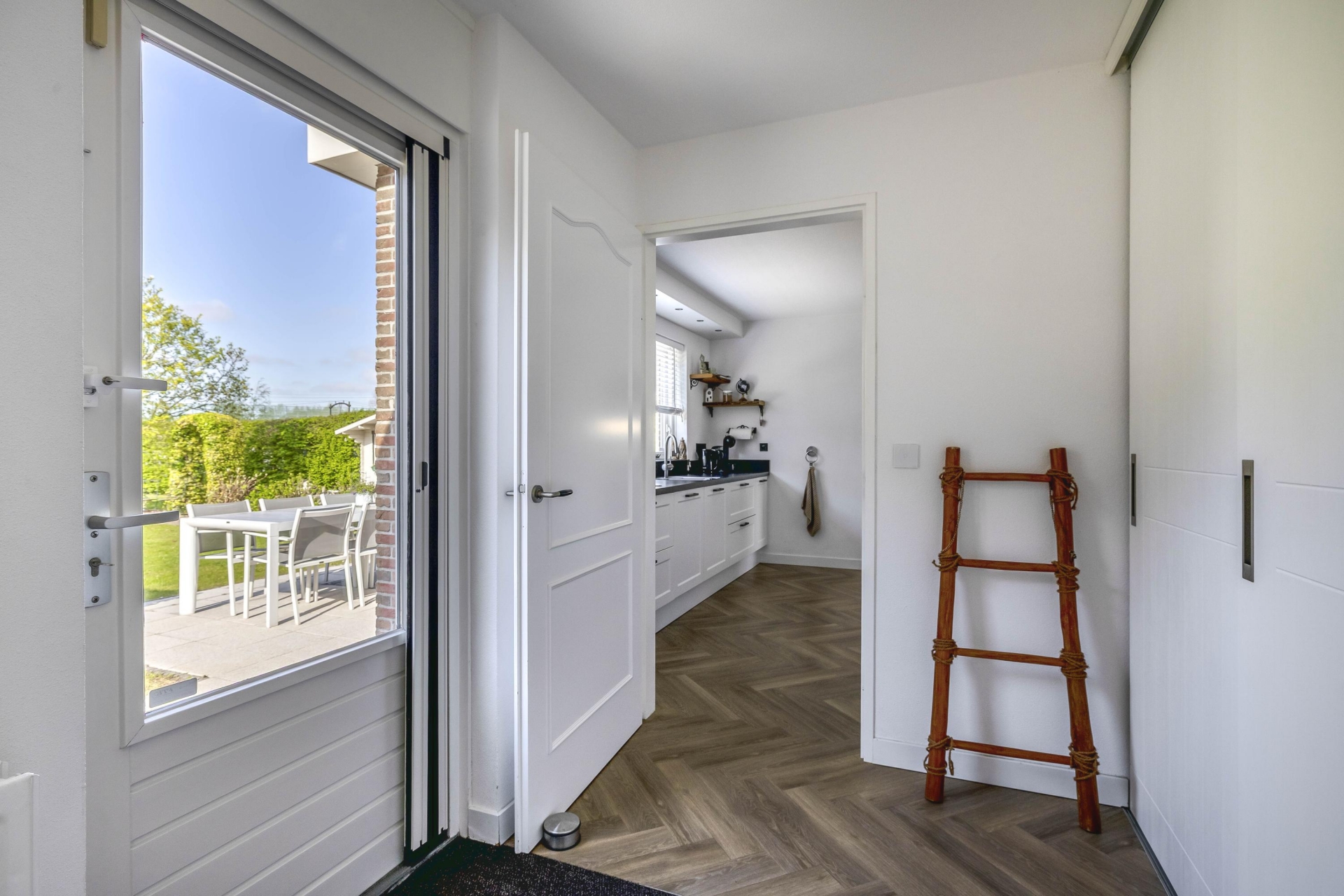 Aansluitend treft u de bijkeuken met aansluitingen voor wasmachine en droger, extra opbergruimte en toegang tot de garage en de achtertuin.