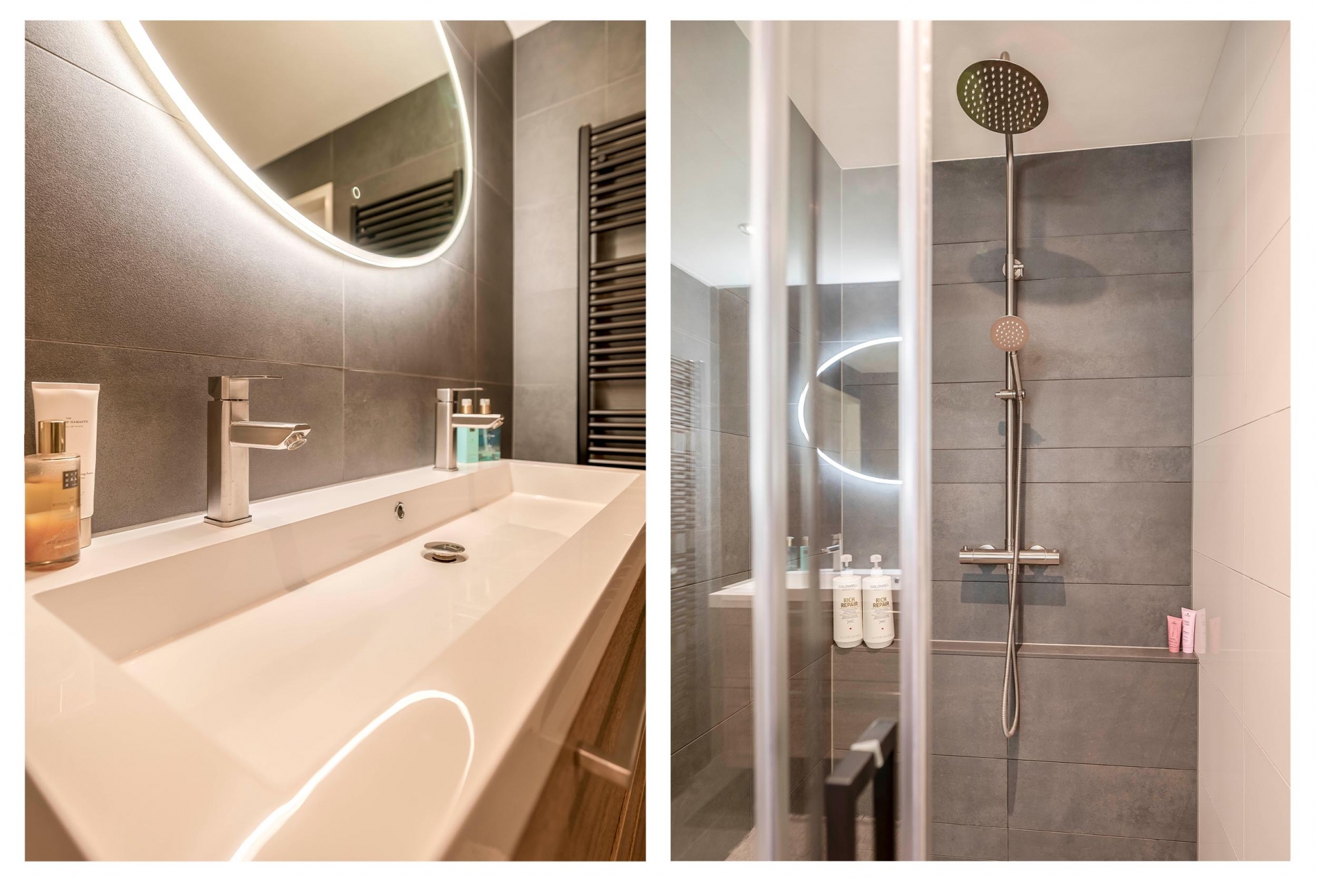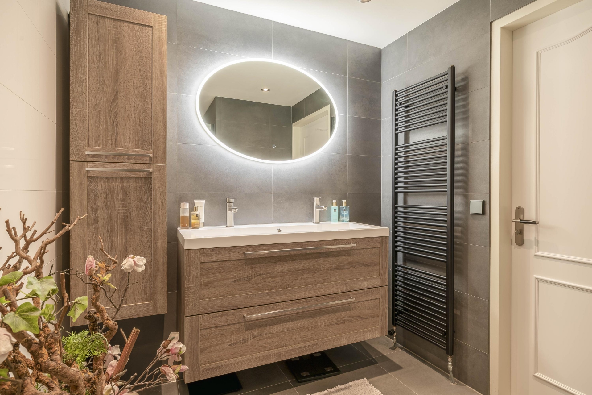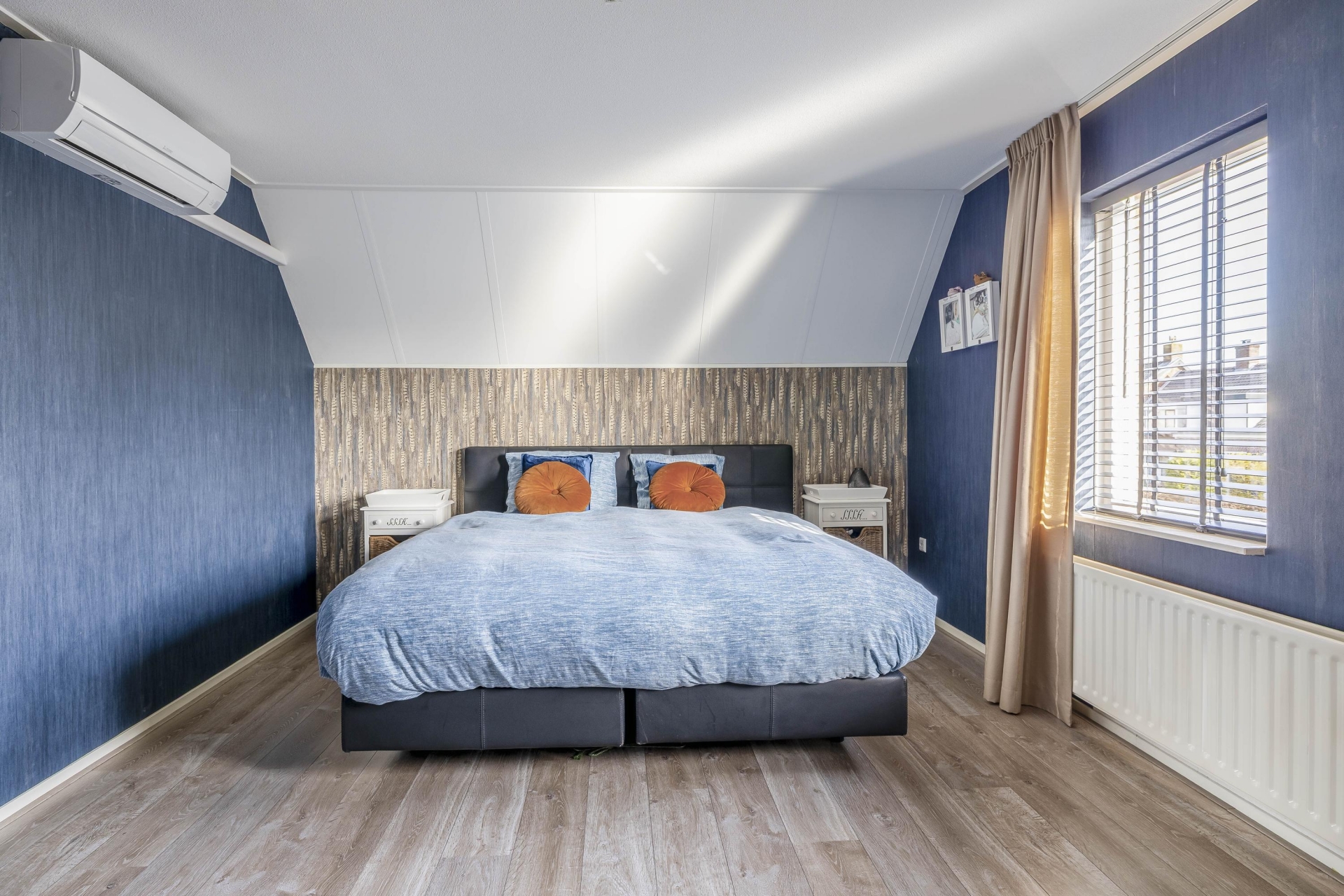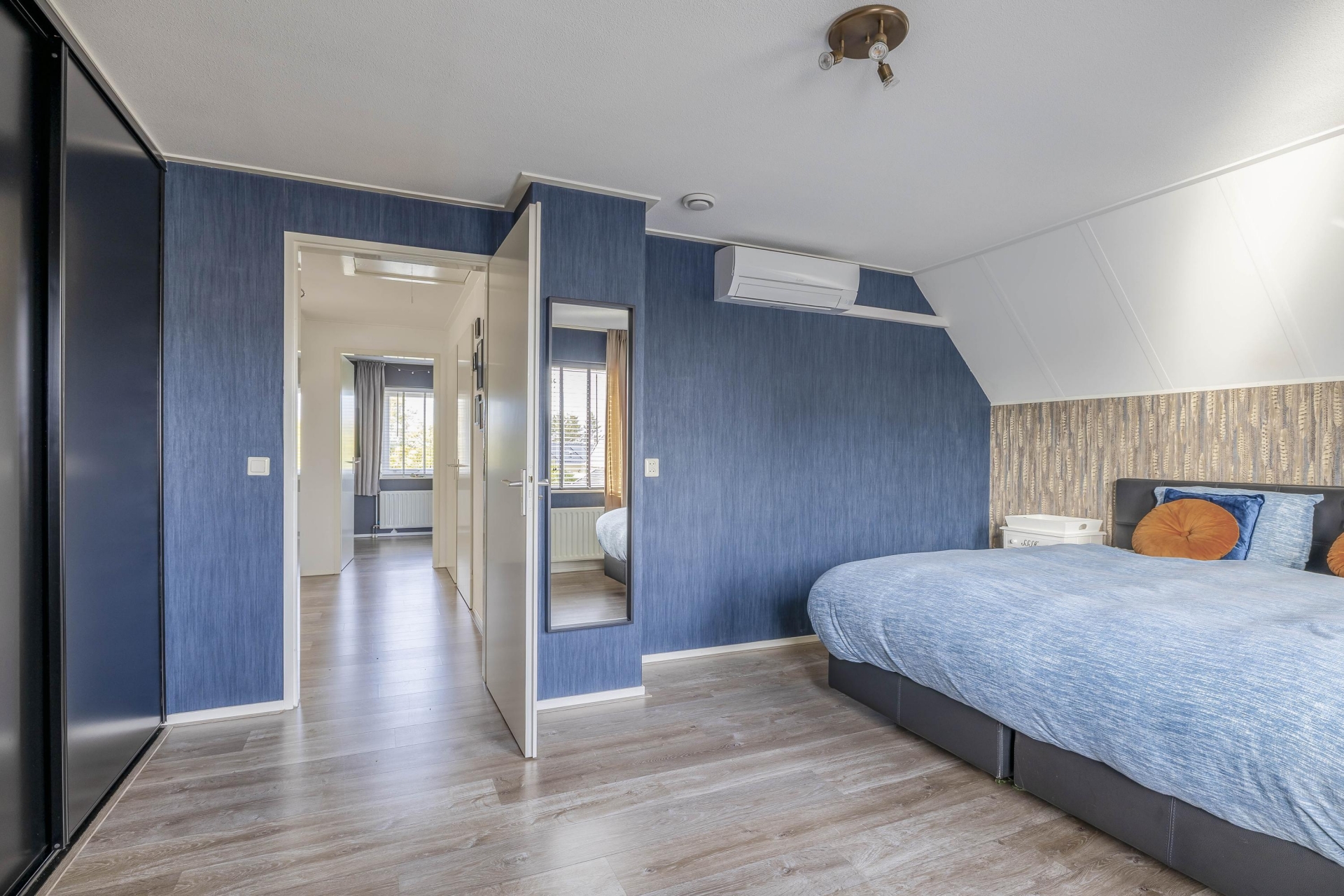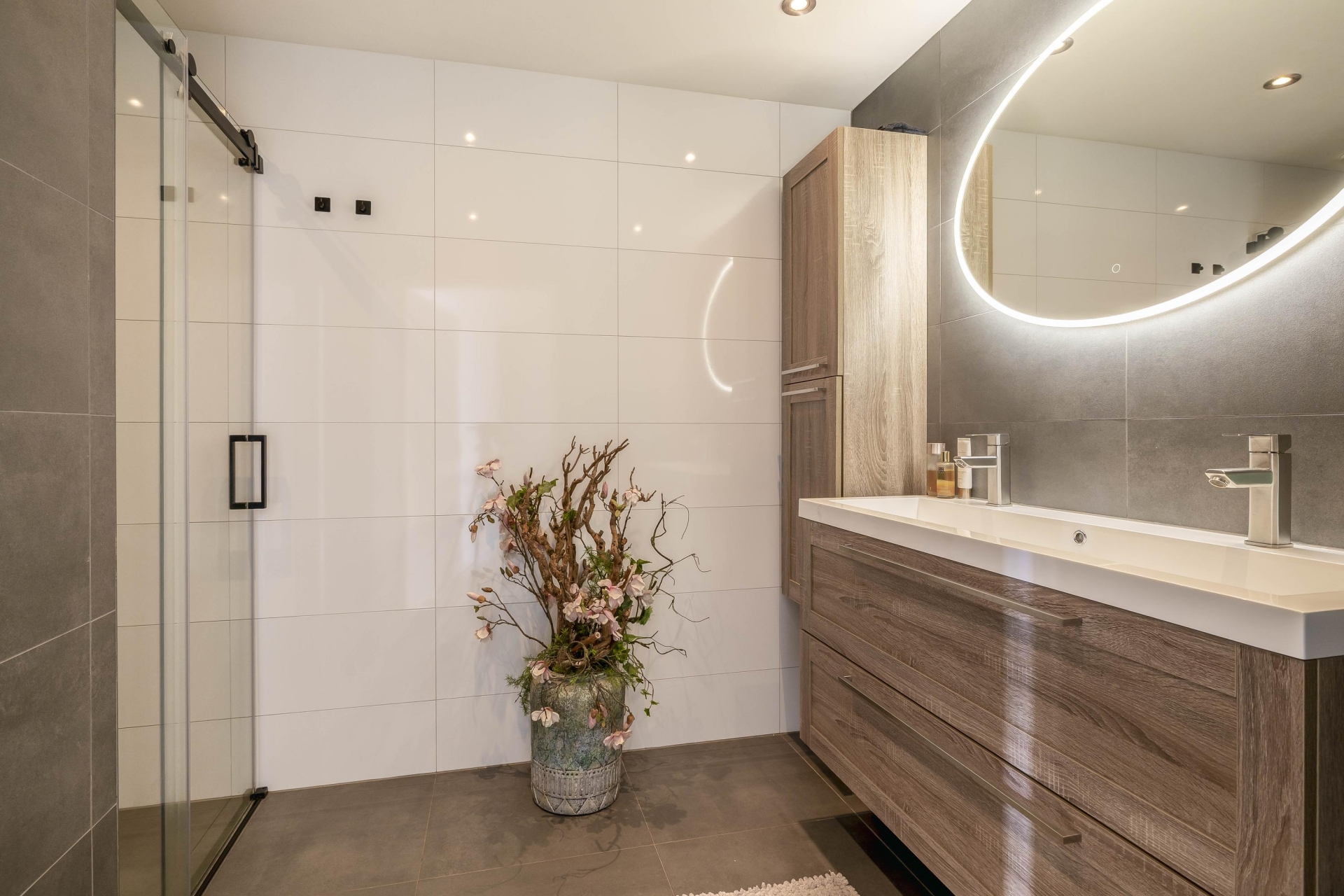 De slaapkamer op de begane grond is ook ideaal in te richten als werkkamer of atelier. De naastgelegen moderne badkamer is voorzien van een ruime inloopdouche, dubbel wastafelmeubel, verlichte spiegel en een algeheel strakke afwerking.