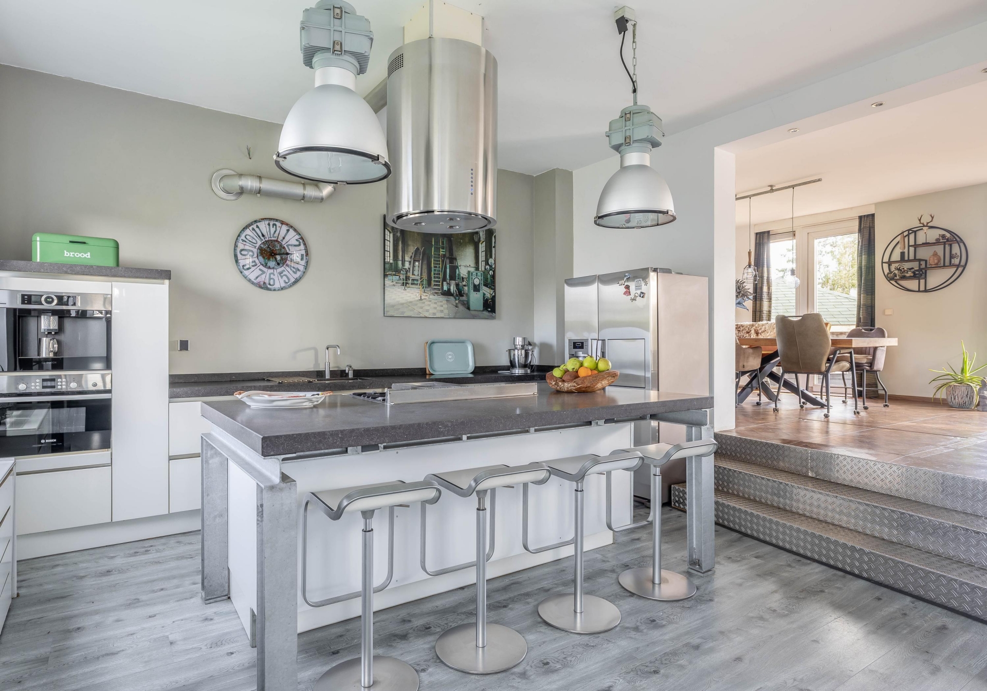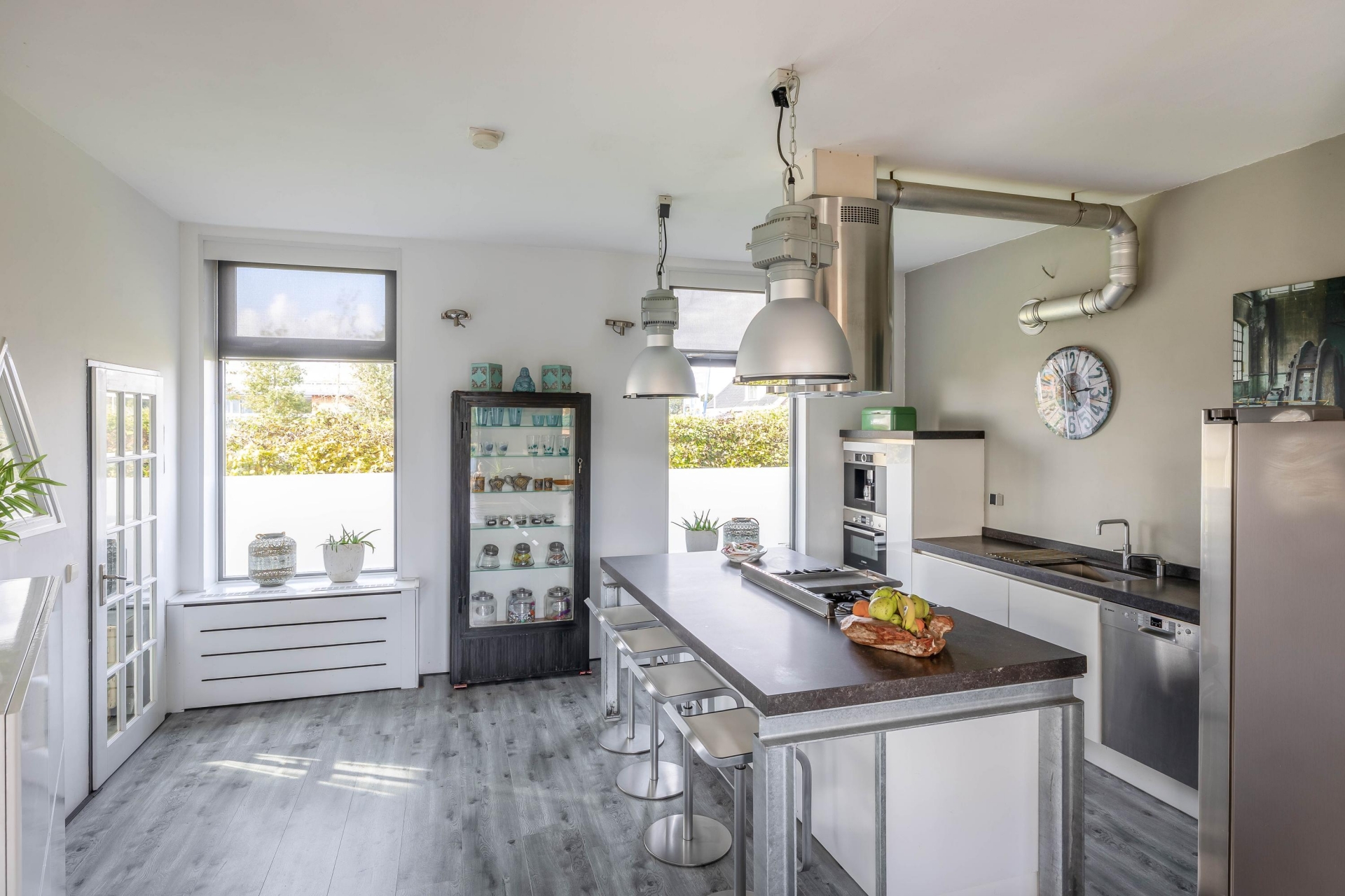 De keuken is opgesteld in een moderne open indeling met centraal een eetbar en royaal kookeiland welke direct in het oog springt. Deze keuken is volledig uitgerust met hoogwaardige inbouwapparatuur, waaronder een oven, ingebouwd koffiezetapparaat, magnetron, Amerikaanse koelkast, Quooker-kraan, vaatwasser en een 5-pits gaskookplaat met stijlvolle afzuigschouw. De ruimte is perfect geschikt voor kookliefhebbers en vormt een gezellige plek om samen te komen.