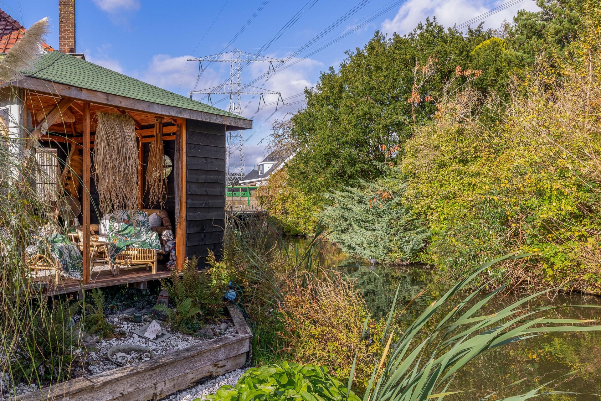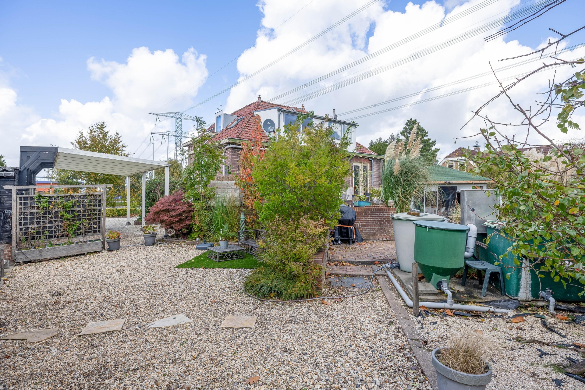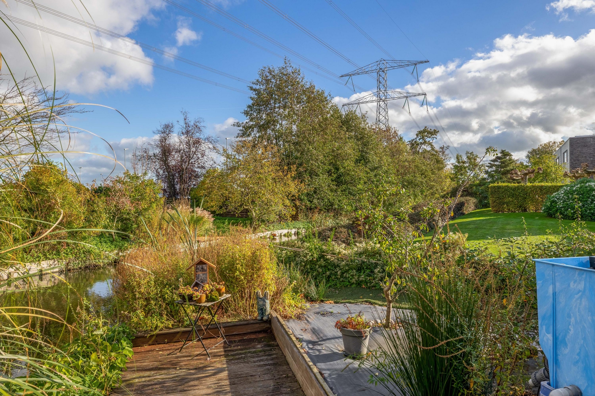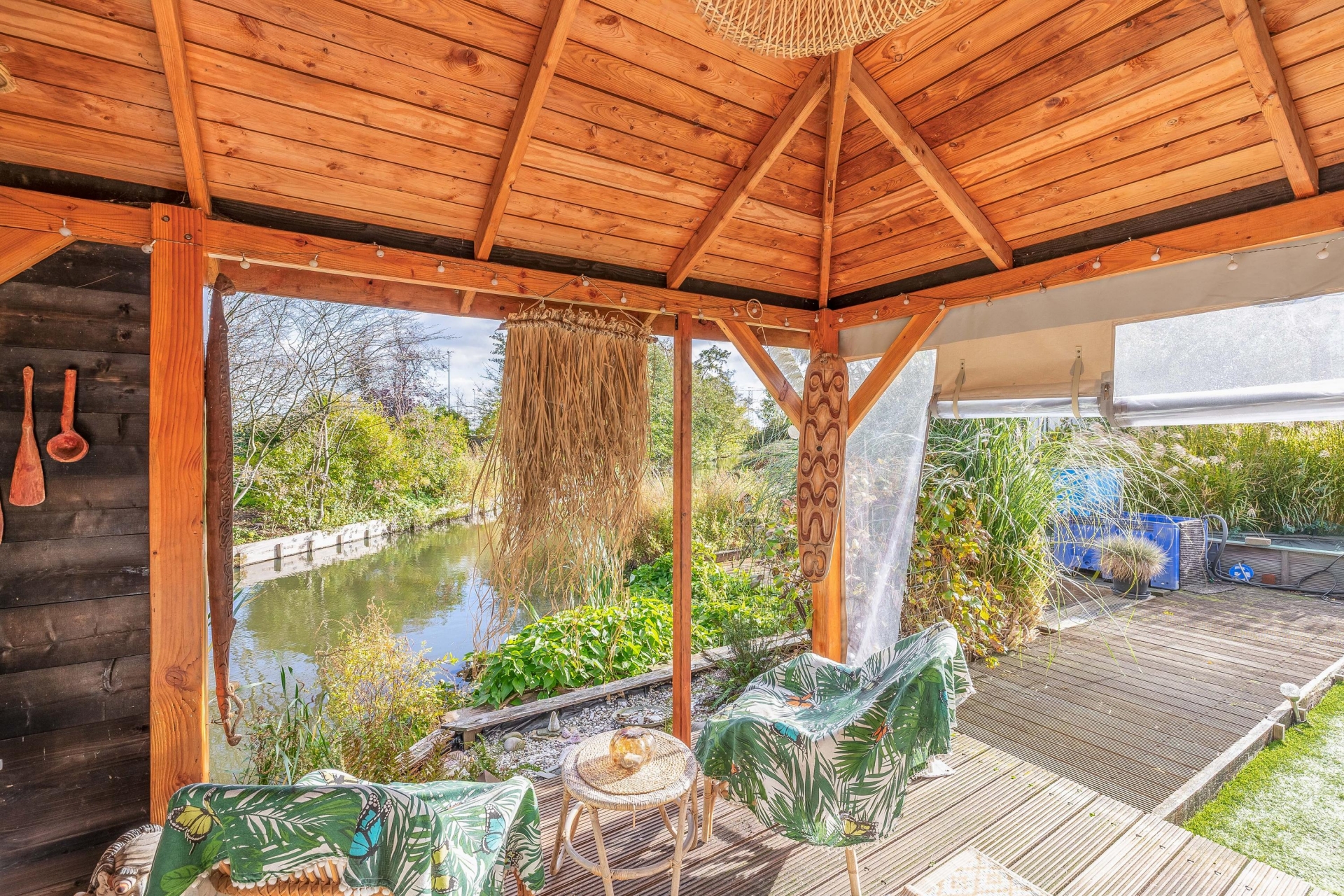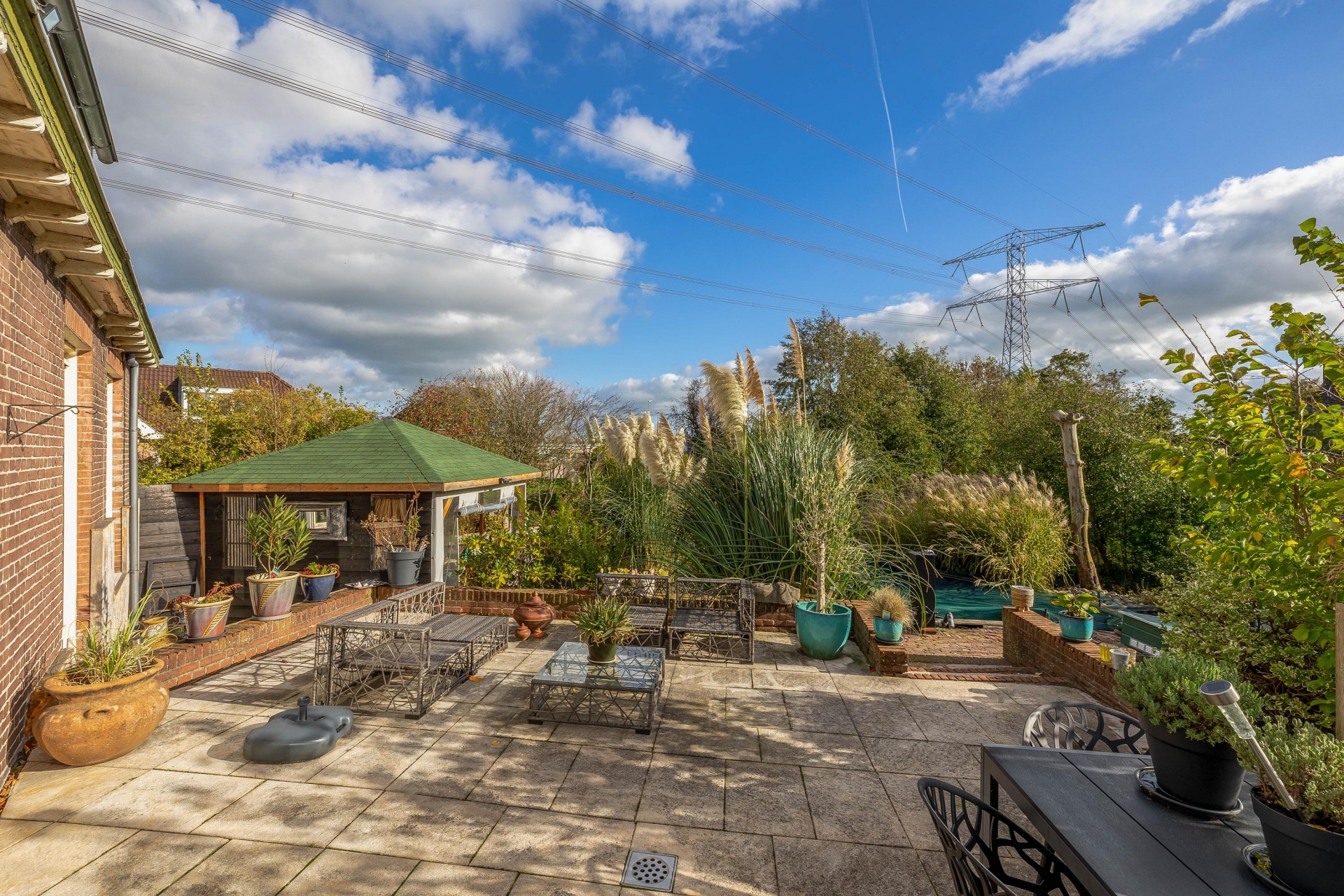 (13 m2) grotendeels (afsluitbaar) gerealiseerd, een heerlijke plek om te ontspannen en te genieten van het uitzicht. Er bevinden zich een aantal fruitbomen (druiven, (hand/stoof) peren, appels, pruimen, rode bessen) er is ook een koi vijver aanwezig met een zuivering.