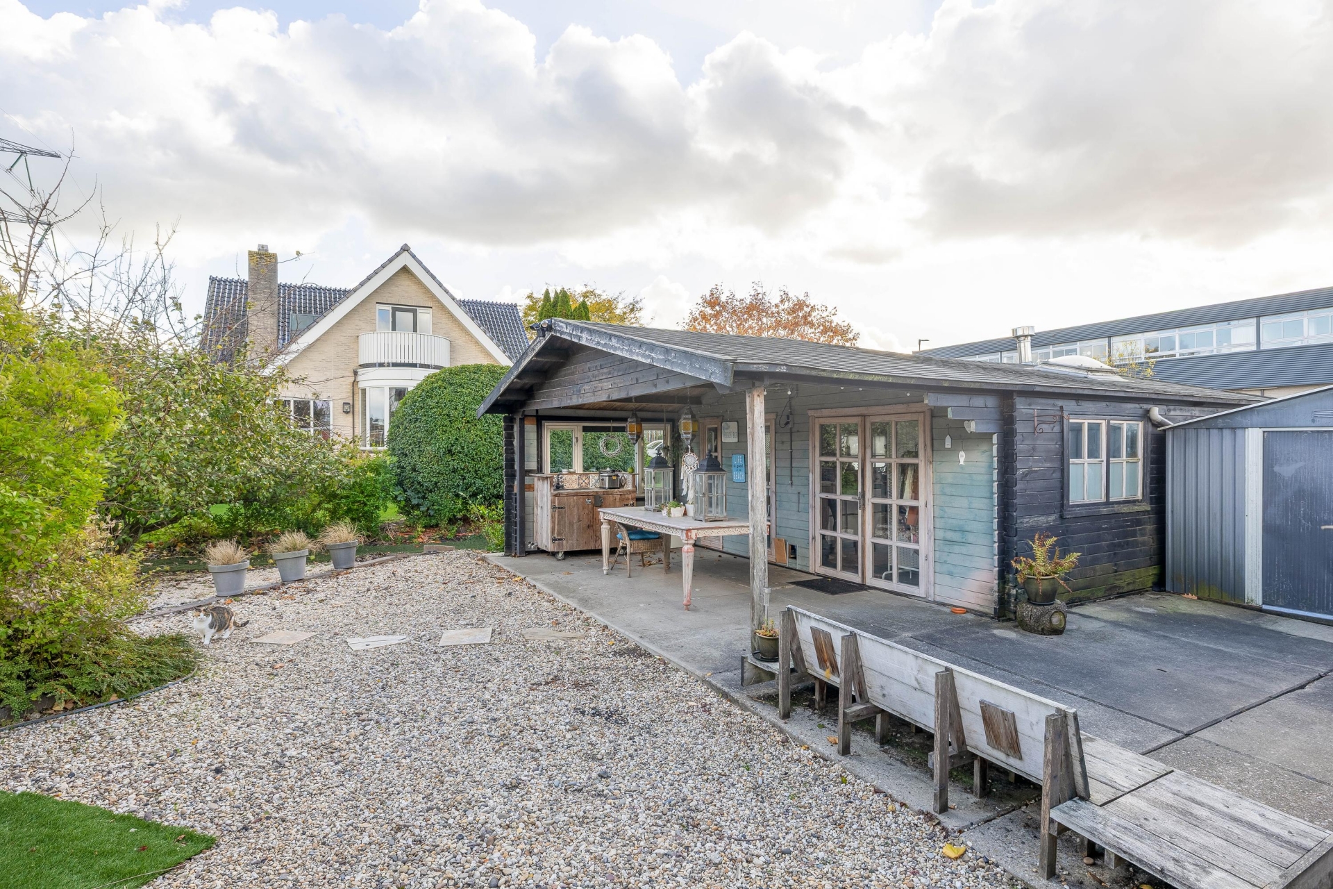 De tuin is rondom de woning gelegen en biedt een verzorgde, groene uitstraling met diverse sfeervolle zitplekken. Naast de woning bevindt zich een garage met een praktische berging (84 m2) met een carport, ideaal voor het overdekt parkeren van een auto. Blokhut met luifel (54 m²) te gebruiken als bedrijfsruimte of kantoor. Direct aan de Schollevaar is een gezellig prieel