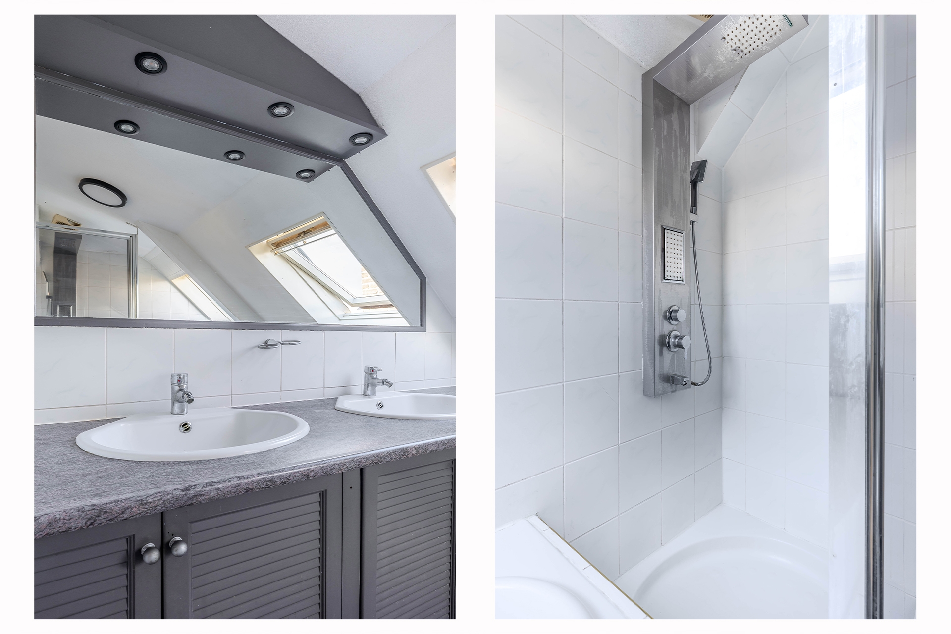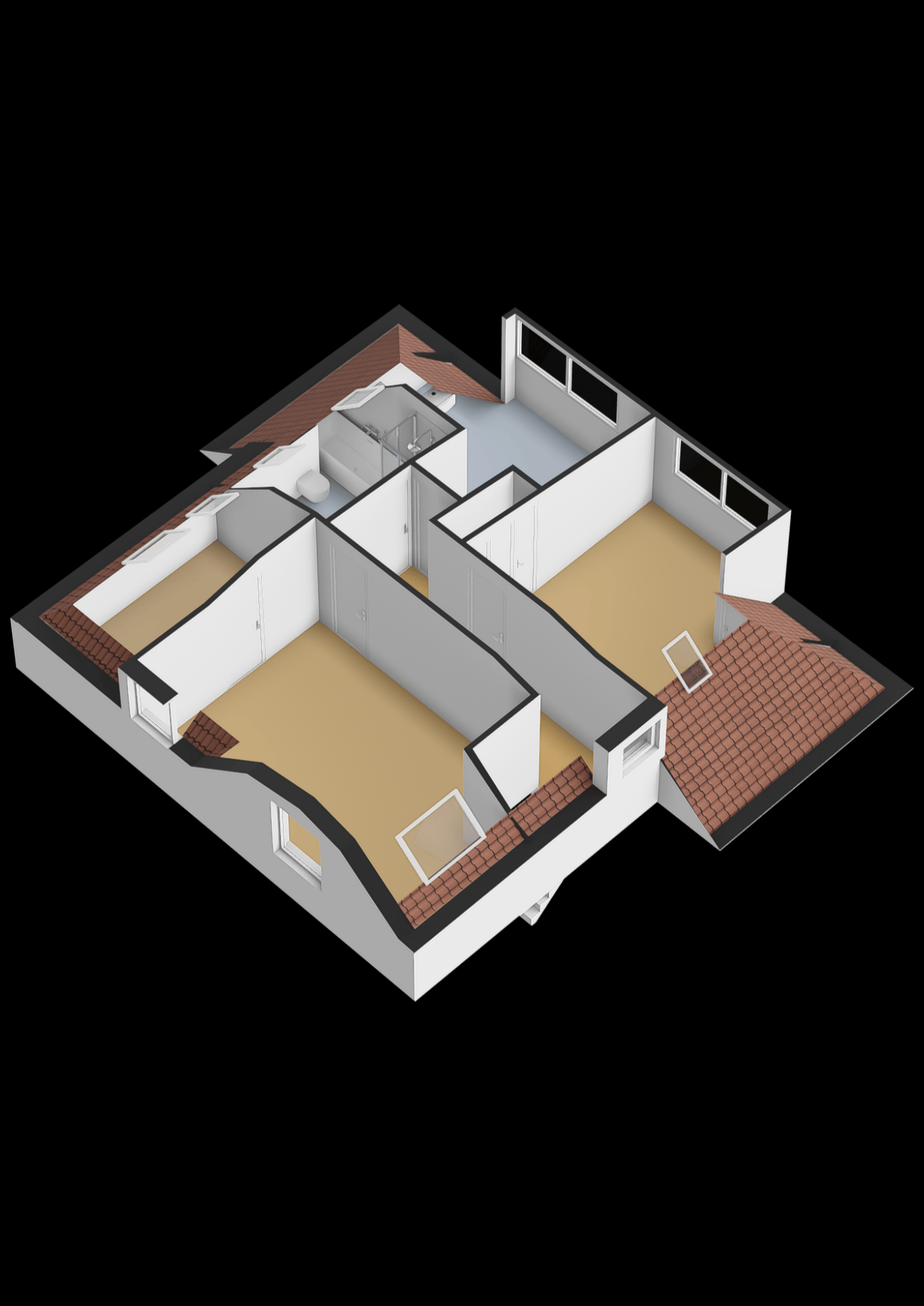 De badkamer (ca. 6 m²) is compleet uitgevoerd en voorzien van een inloopdouche, een ligbad, een toilet en een dubbel wastafelmeubel. De combinatie van comfort, ruimte en praktische indeling maakt deze verdieping uitermate functioneel én aangenaam om in te verblijven.