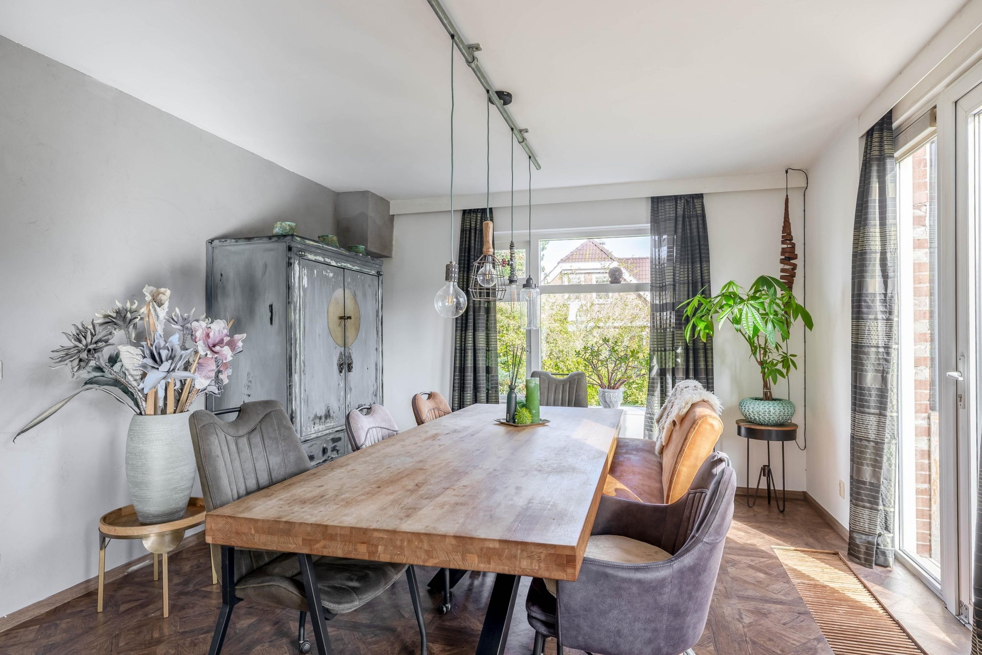 Een brede 3 trede trap vanuit de keuken leidt naar de woonkamer, wat zorgt voor een speelse en open indeling. De woonkamer is onderverdeeld in een eetgedeelte en een zitgedeelte, die samen een riant oppervlak van circa 38 m² beslaan. Dankzij de royale afmetingen is er volop ruimte voor een grote eettafel en een comfortabele zithoek. De grote ramen op het zuiden zorgen bovendien voor veel natuurlijk licht, wat de ruimte een warme en uitnodigende sfeer geeft. In deze ruimte zit een luik die toegang verschaft via een wenteltrap aan de kelderkamer (12 m2) met een groot raam naar de achtertuin.