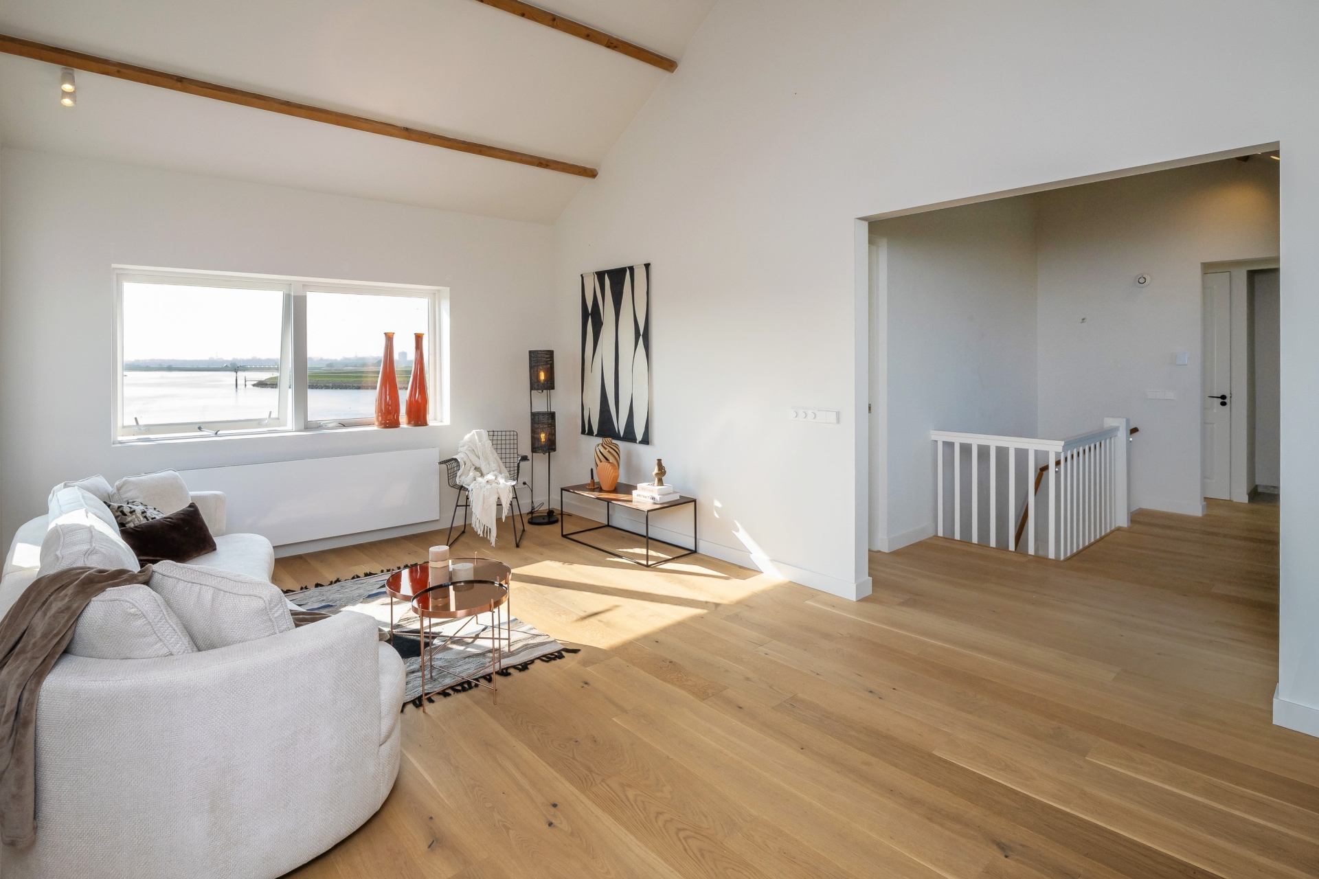 De woonkamer is strak afgewerkt met gestucte wanden en is op te delen in een zit- en eetgedeelte. Aan de voorzijde kijk je uit over de IJssel en aan de achterzijde heb je zicht op het polderlandschap.