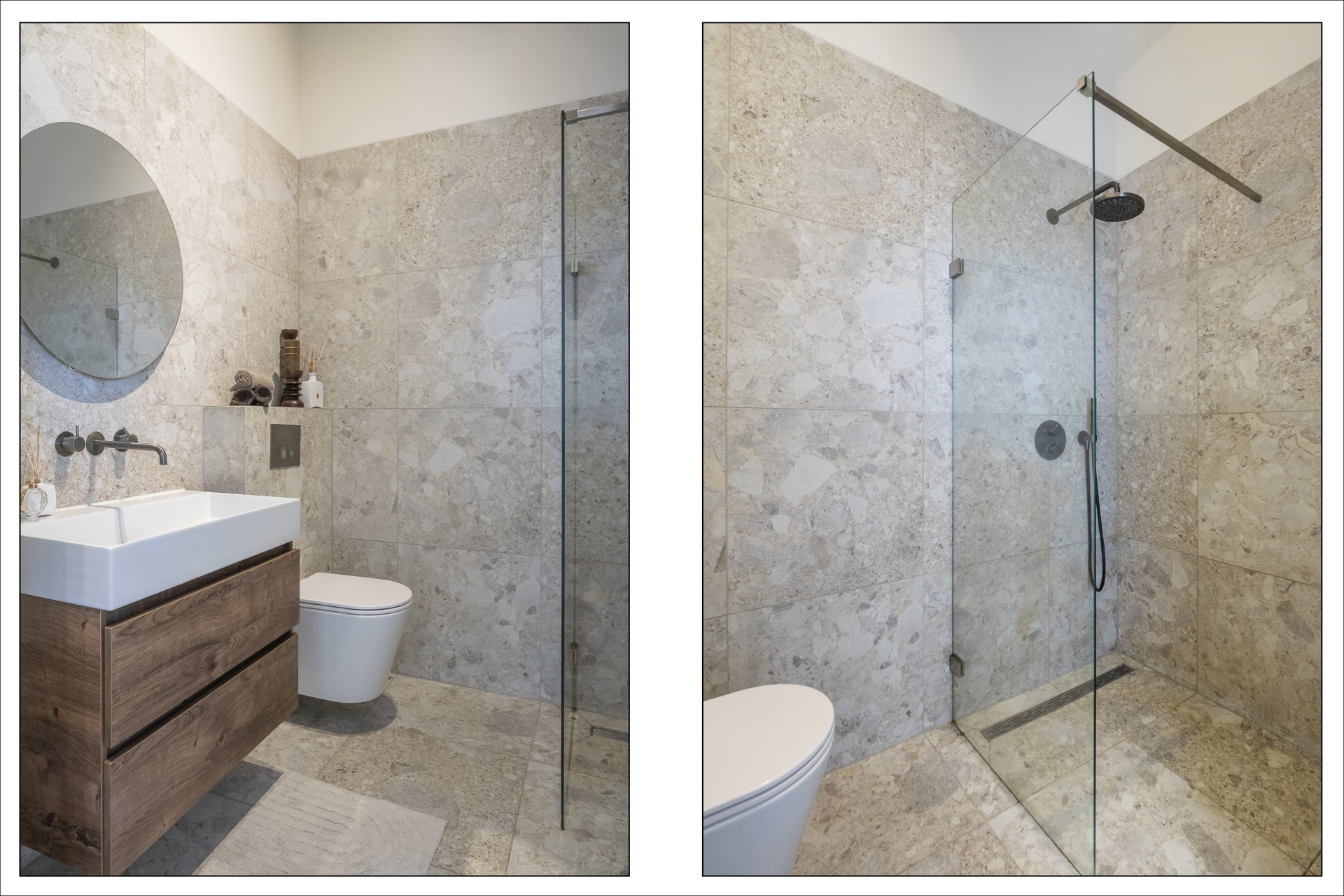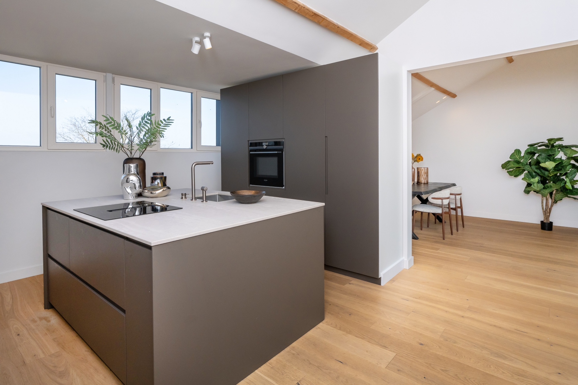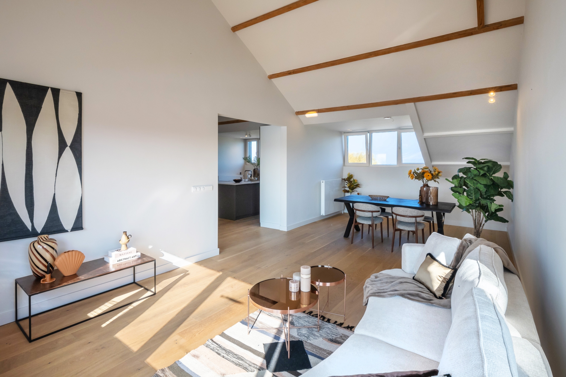 Via de ingang bovendijks kom je kom je in de gemeenschappelijke hal met meterkast. Vanuit de hal loop je door naar de trapopgang met separaat toilet. Via de trap kom je uit op de overloop met toegang tot alle ruimtes. Hier vallen meteen de prachtig hoge planfonds op. De woonkeuken beschikt over een kookeiland en alle benodigde inbouwapparatuur, zoals een inductiekookplaat met geïntegreerde afzuigkap, vaatwasser, combi-oven, koelkast, vriezer en voldoende opbergruimte.