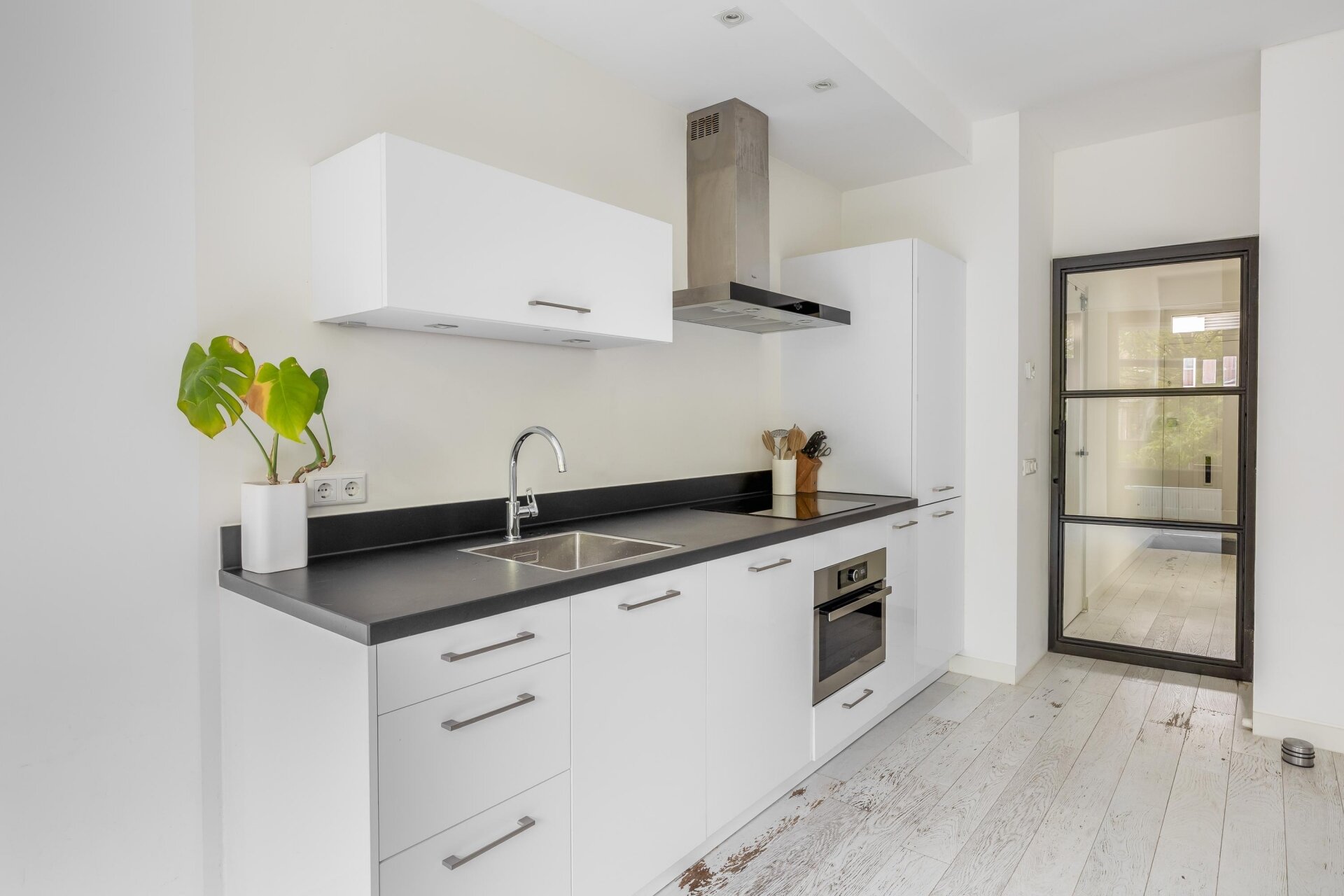 De open keuken is strak afgewerkt en uitgerust met diverse inbouwapparatuur, waaronder een 4-pits gasfornuis, vaatwasser, magnetron en afzuigkap. Vanuit de woonkamer geven de openslaande deuren toegang tot de diepe, rustig gelegen tuin op het westen – een heerlijke plek om van de middag- en avondzon te genieten.