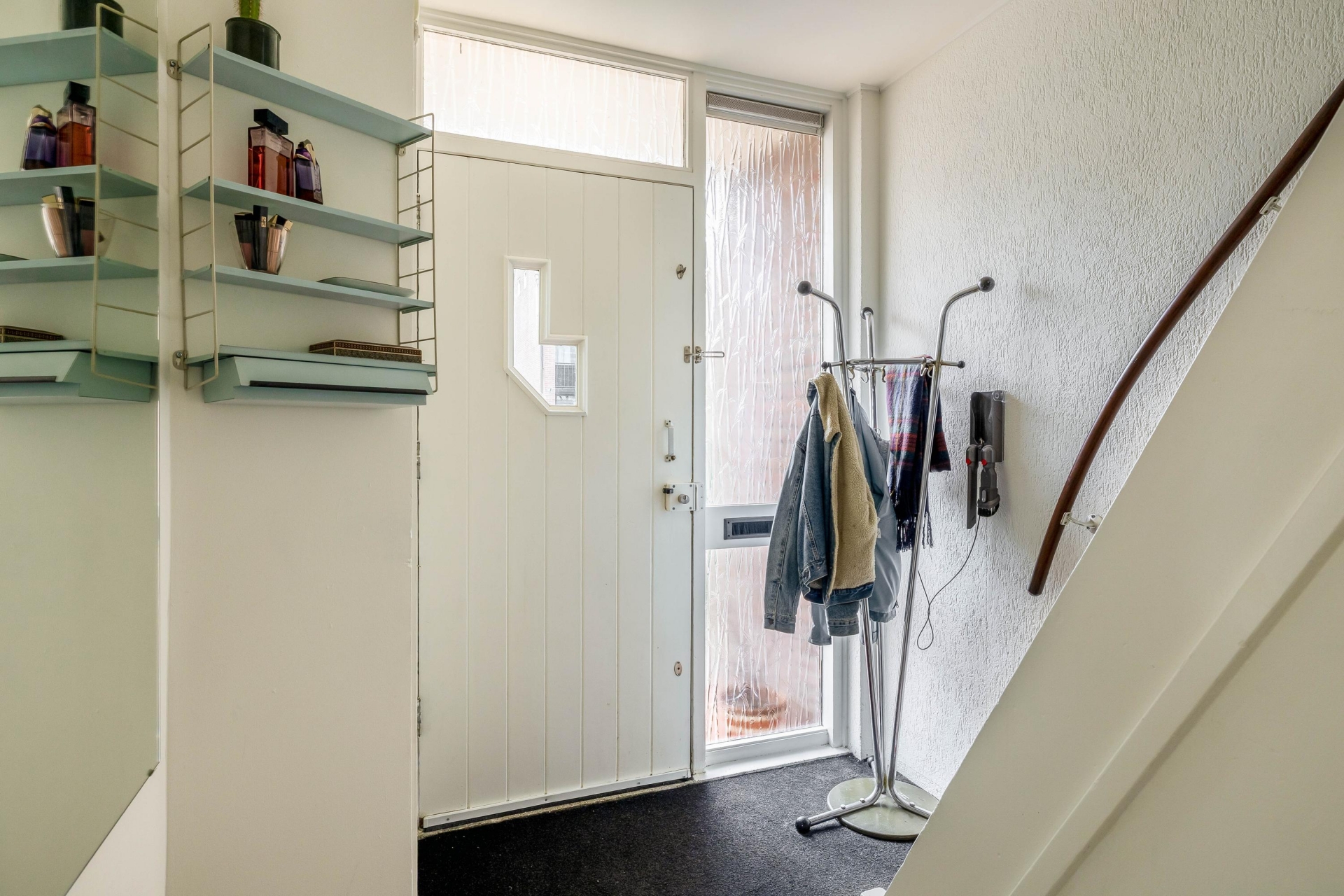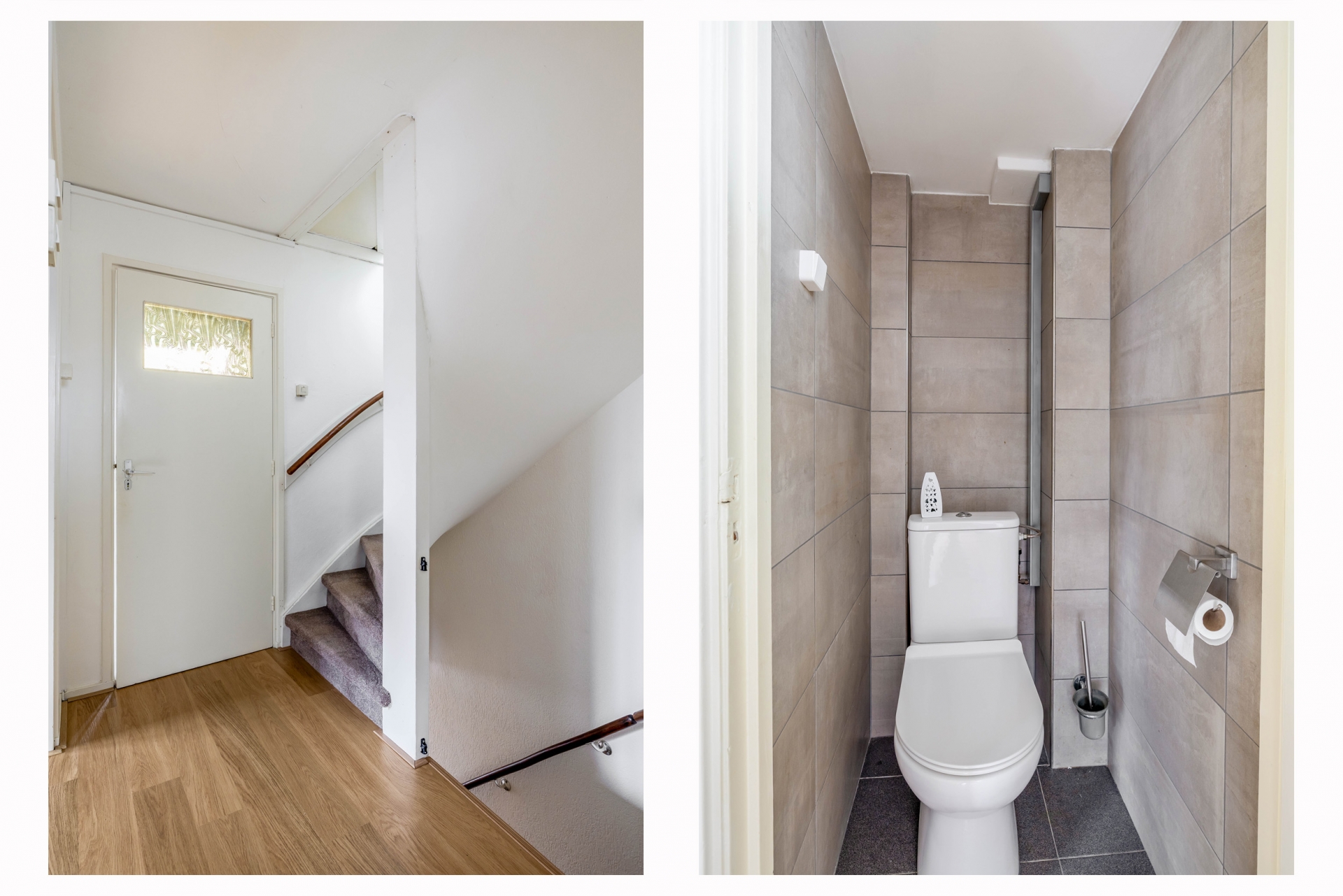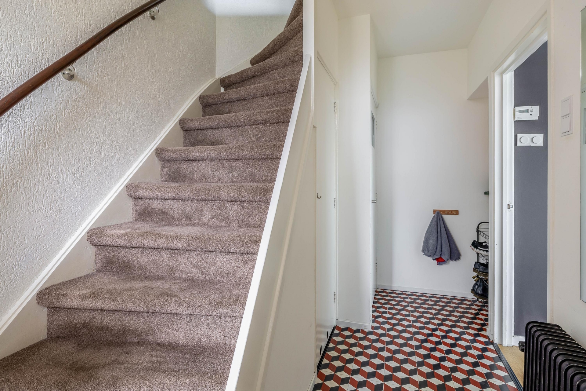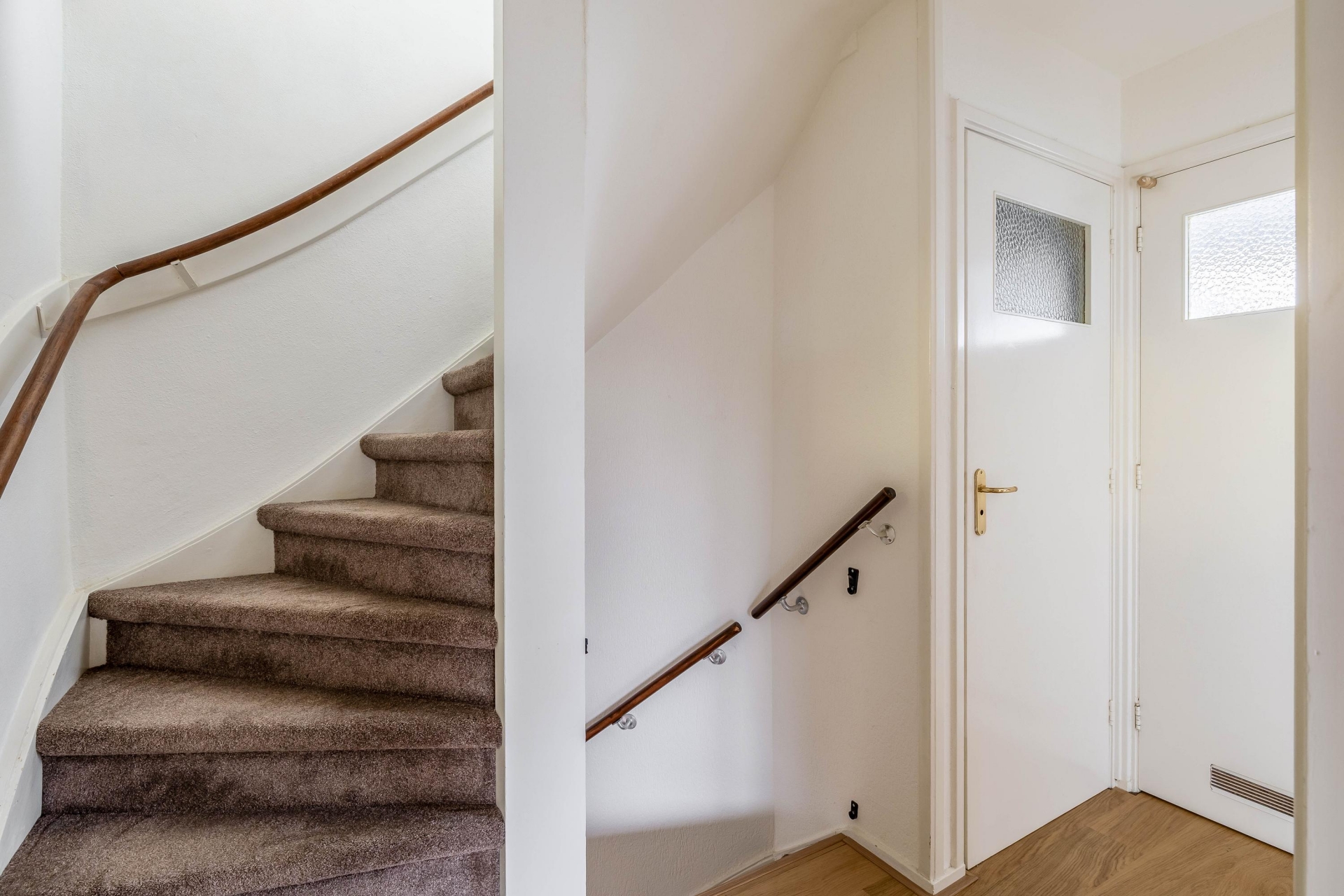 Entree/hal met vernieuwde meterkast, toilet, trapopgang naar de eerste verdieping en een trapkast.