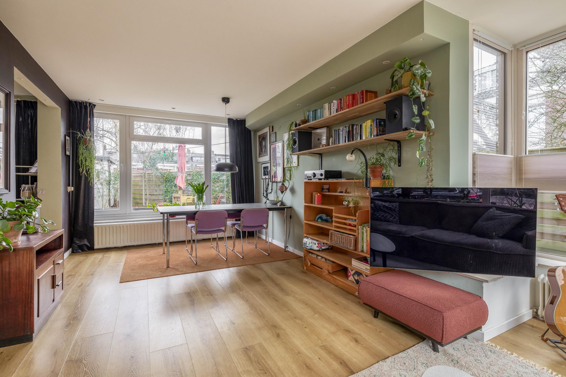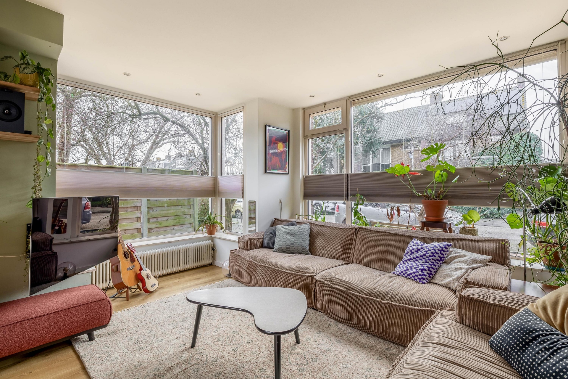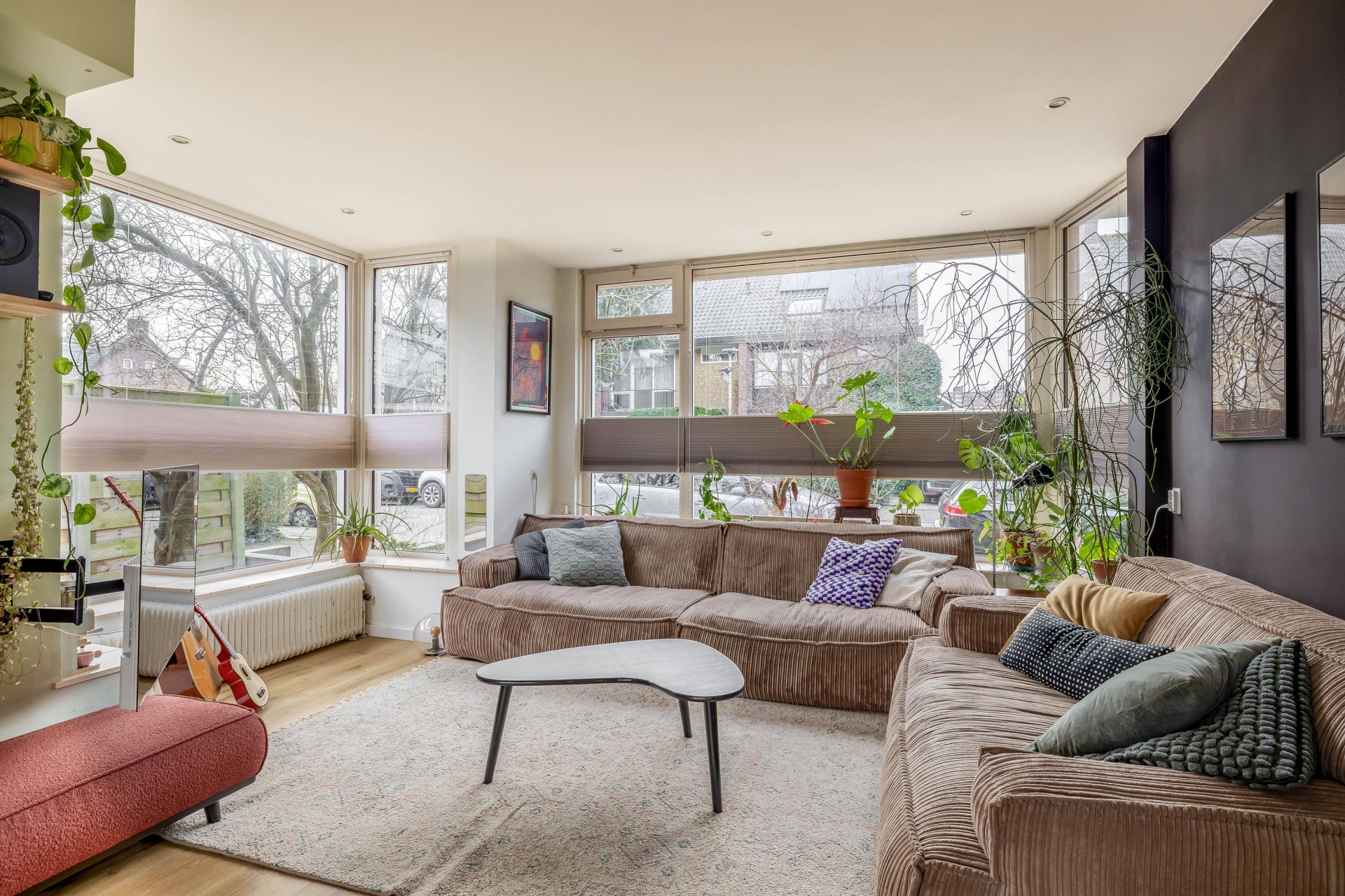 De woonkamer heeft een zeer goede lichtinval, mede dankzij de erker aan de zijkant, en biedt een mooi zicht over de tuin en op de straat.