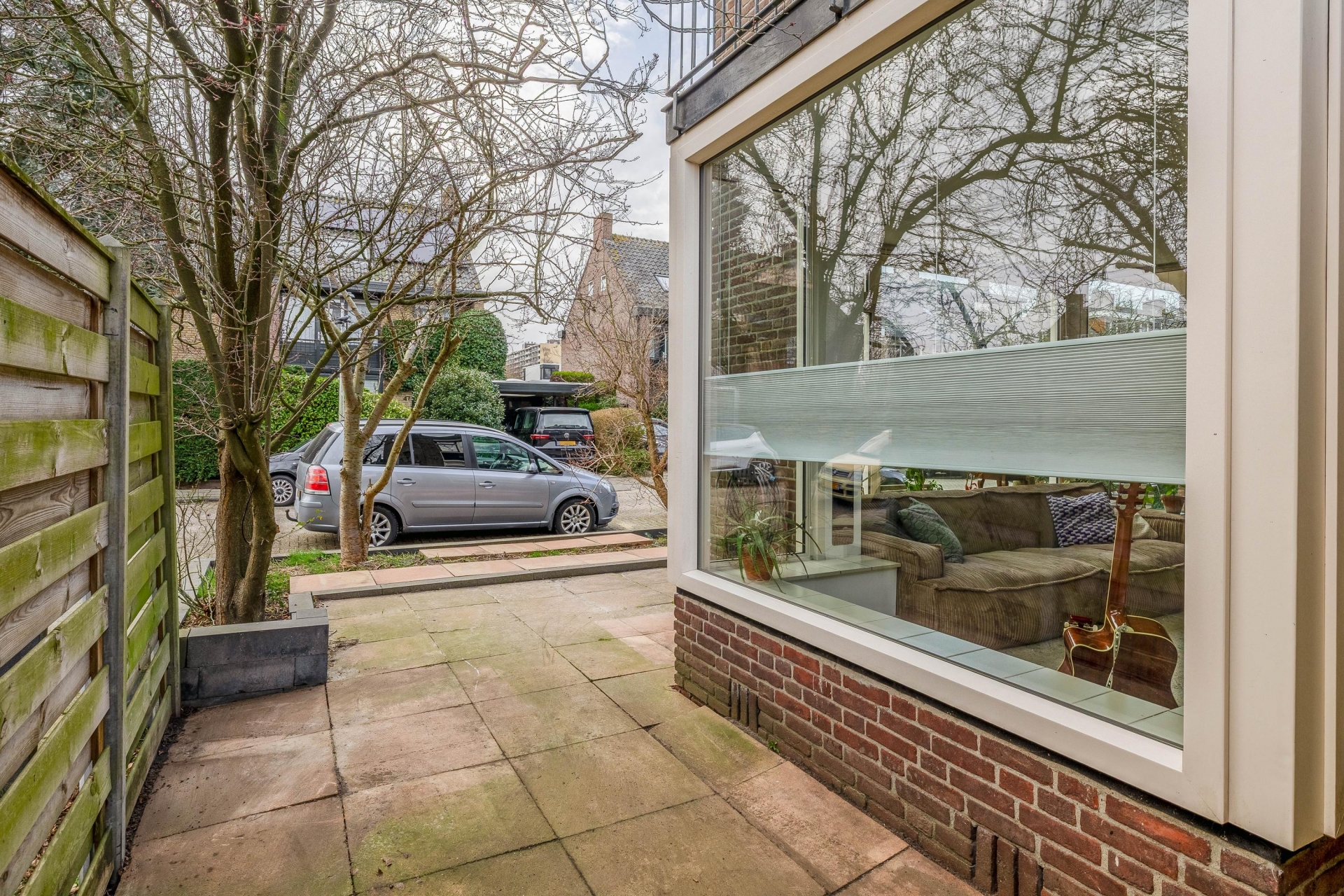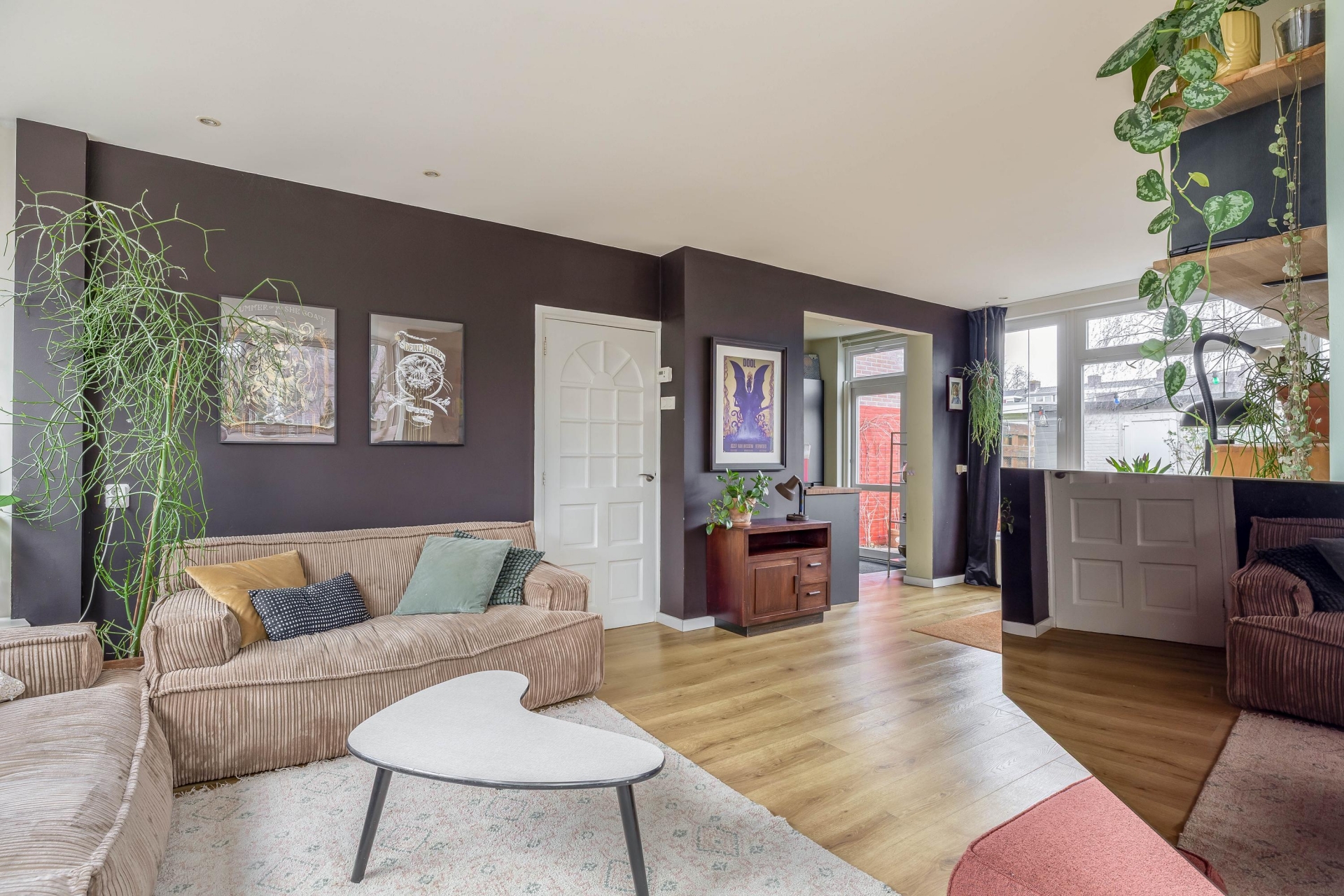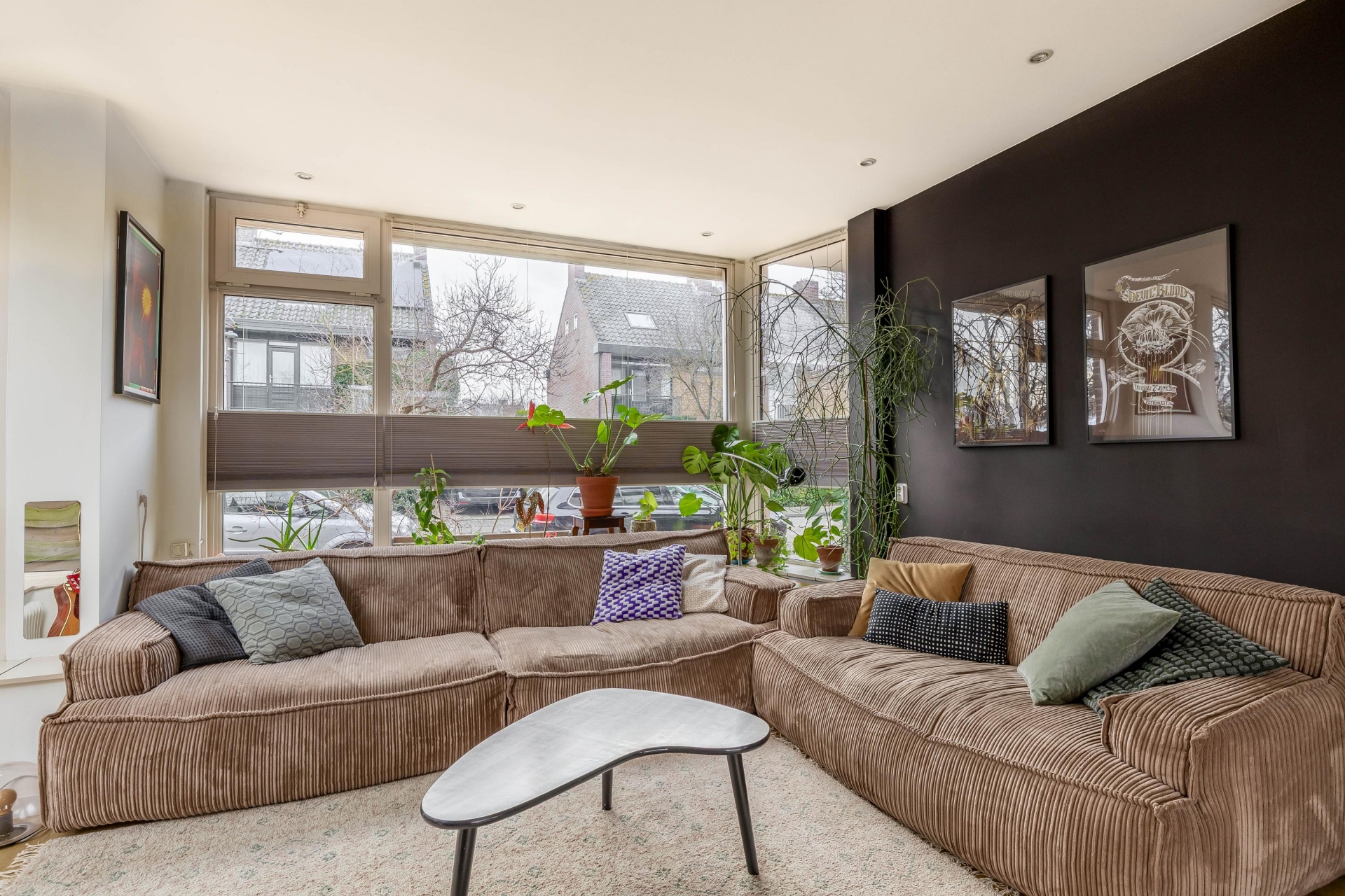 De woonkamer heeft een zeer goede lichtinval, mede dankzij de erker aan de zijkant, en biedt een mooi zicht over de tuin en op de straat.