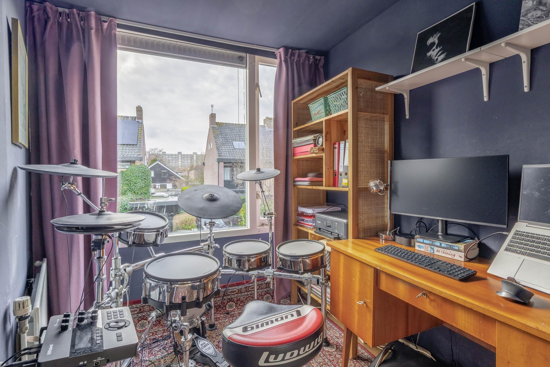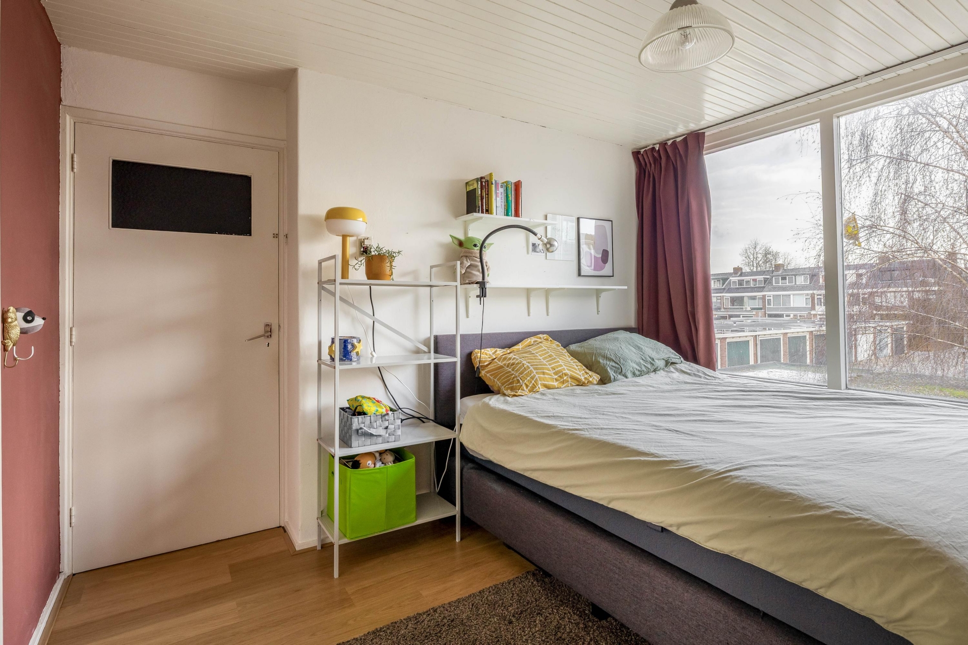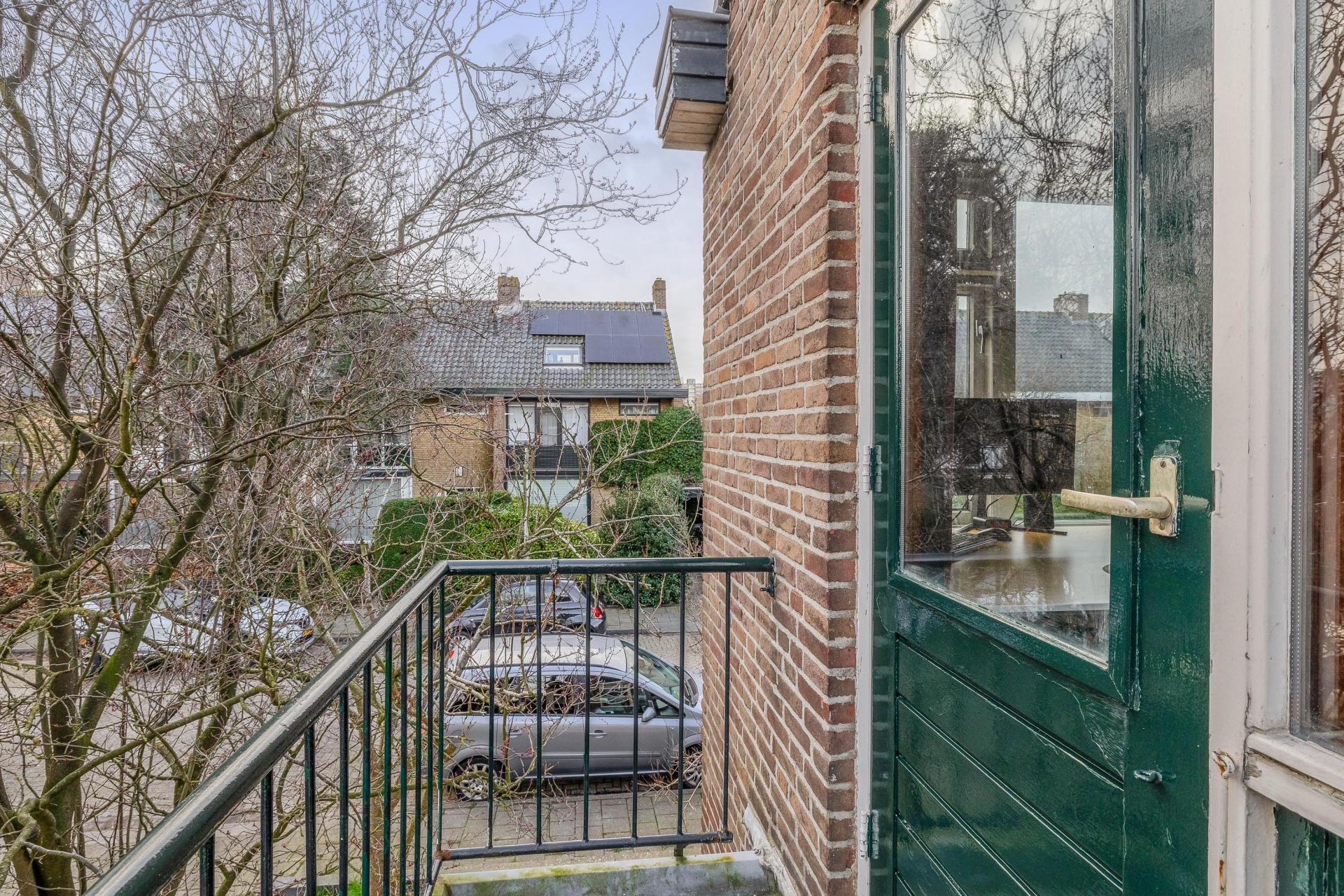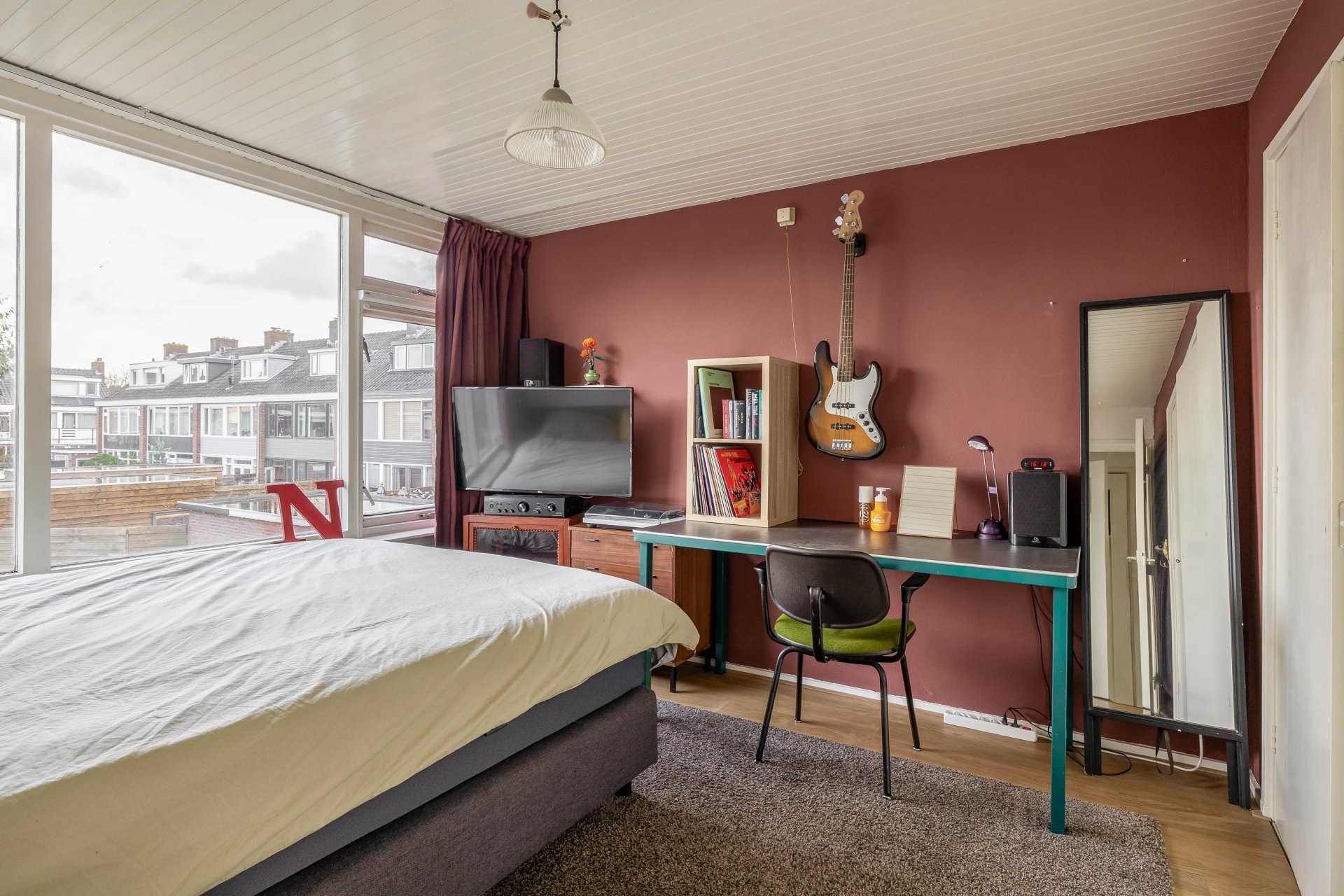 Aan de voorzijde van de woning bevindt zich de grote slaapkamer met een balkon aan de zijkant. De voormalige badkamer aan de voorzijde is thans in gebruik als kantoorruimte.