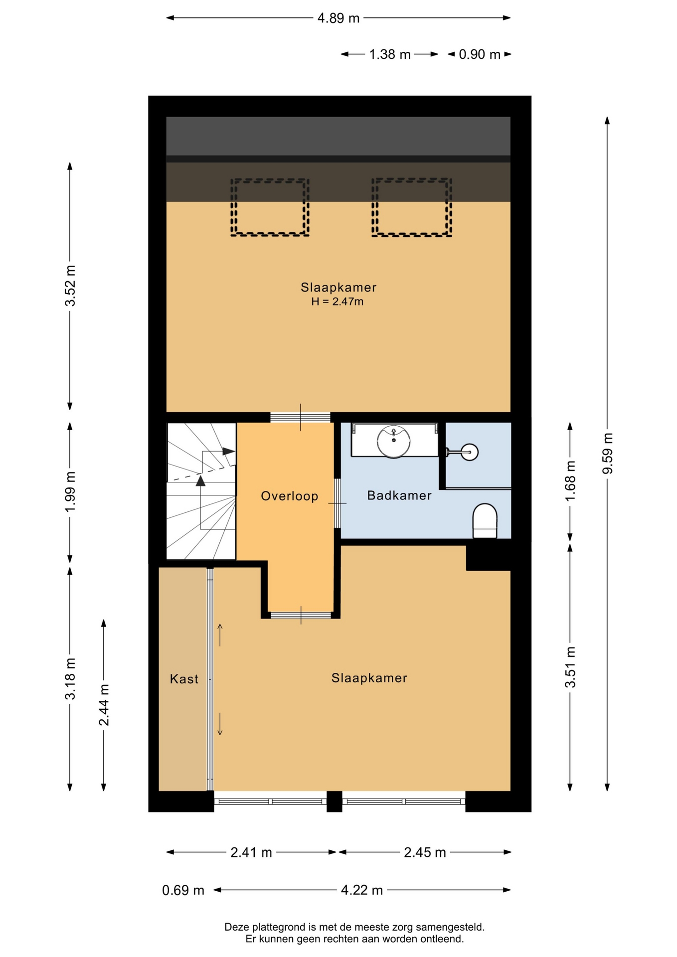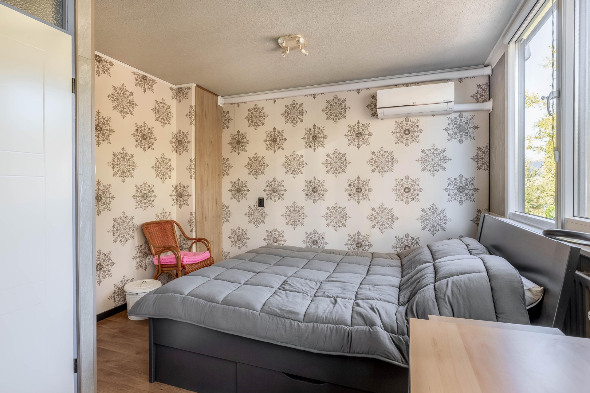 Via de trap bereik je de eerste verdieping. Aan de achterzijde van de woning bevindt zich de eerste slaapkamer, voorzien van twee dakramen en met een oppervlakte van circa 17 m². Aan de voorzijde ligt de tweede slaapkamer, die beschikt over een praktische vaste kast en een oppervlakte heeft van ongeveer 13 m². De inpandige badkamer is compleet uitgerust met een inloopdouche (incl. 2 delige vouwdeur), toilet en een modern wastafelmeubel.