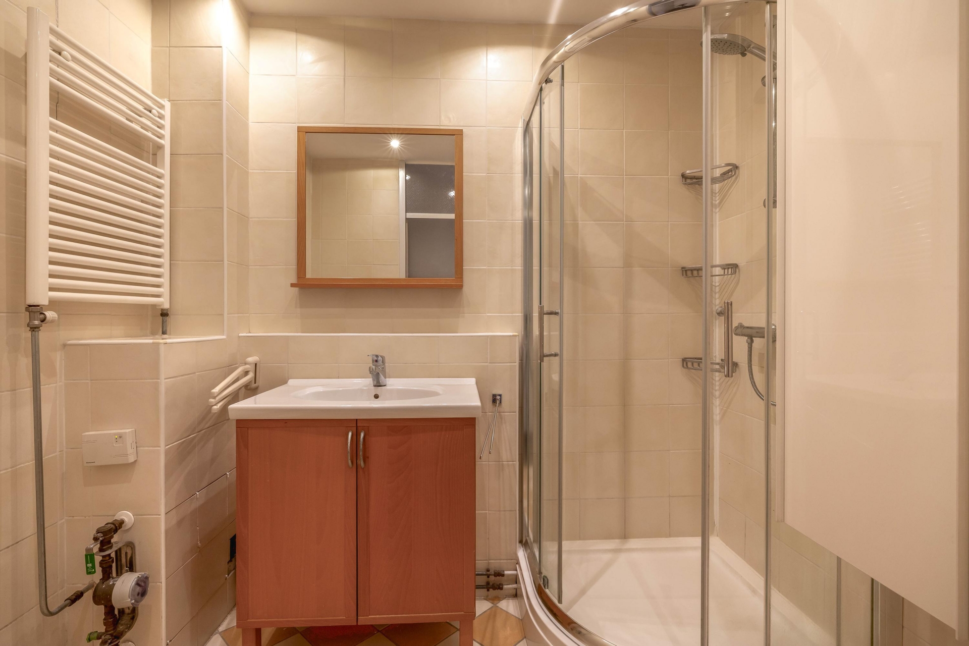 De (half)open keuken sluit mooi aan op de woonkamer en is voorzien van alle nodige inbouwapparatuur: keramische kookplaat, rvs afzuigkap, combi-oven, koelkast, vriezer en vaatwasser. Ook de badkamer is netjes afgewerkt, met een douchecabine, wastafelmeubel, designradiator en aansluiting voor de wasmachine. Verder is er een apart toilet, een ruime bergkast en een eigen berging op de eerste verdieping van het complex, ideaal voor fietsen of opslag.