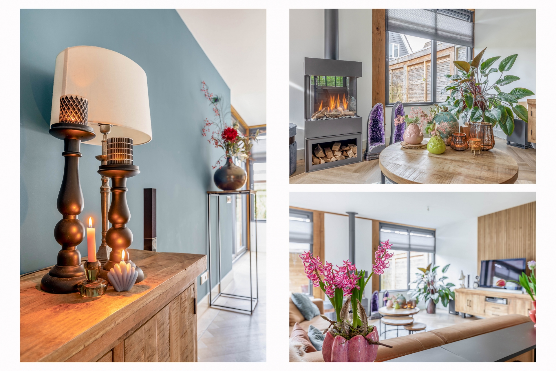 Zodra je binnenkomt valt direct op hoeveel ruimte en licht dit huis te bieden heeft. De woonkamer is aan de achterzijde uitgebouwd met een luxueuze uitbouw met aluminium kozijnen en prachtige, Franse eiken balken, wat zorgt voor een royale leefruimte met een prettige indeling. De grote raampartijen en de twee riante openslaande deuren naar de tuin laten het daglicht mooi naar binnen vallen en zorgen voor een fijne verbinding met buiten. De zithoek is ruim opgezet en sfeervol ingericht, met een moderne haard als centraal punt. Dit maakt het een heerlijke plek om te ontspannen, zowel overdag als in de avond. Aan de voorzijde van de woonkamer is voldoende ruimte voor een grote eettafel, waar je met gemak met familie of vrienden kunt zitten. De afwerking is verzorgd en warm, met een mooie vloer (met vloerverwarming) en rustige kleurstellingen die het geheel een eigentijdse uitstraling geven.