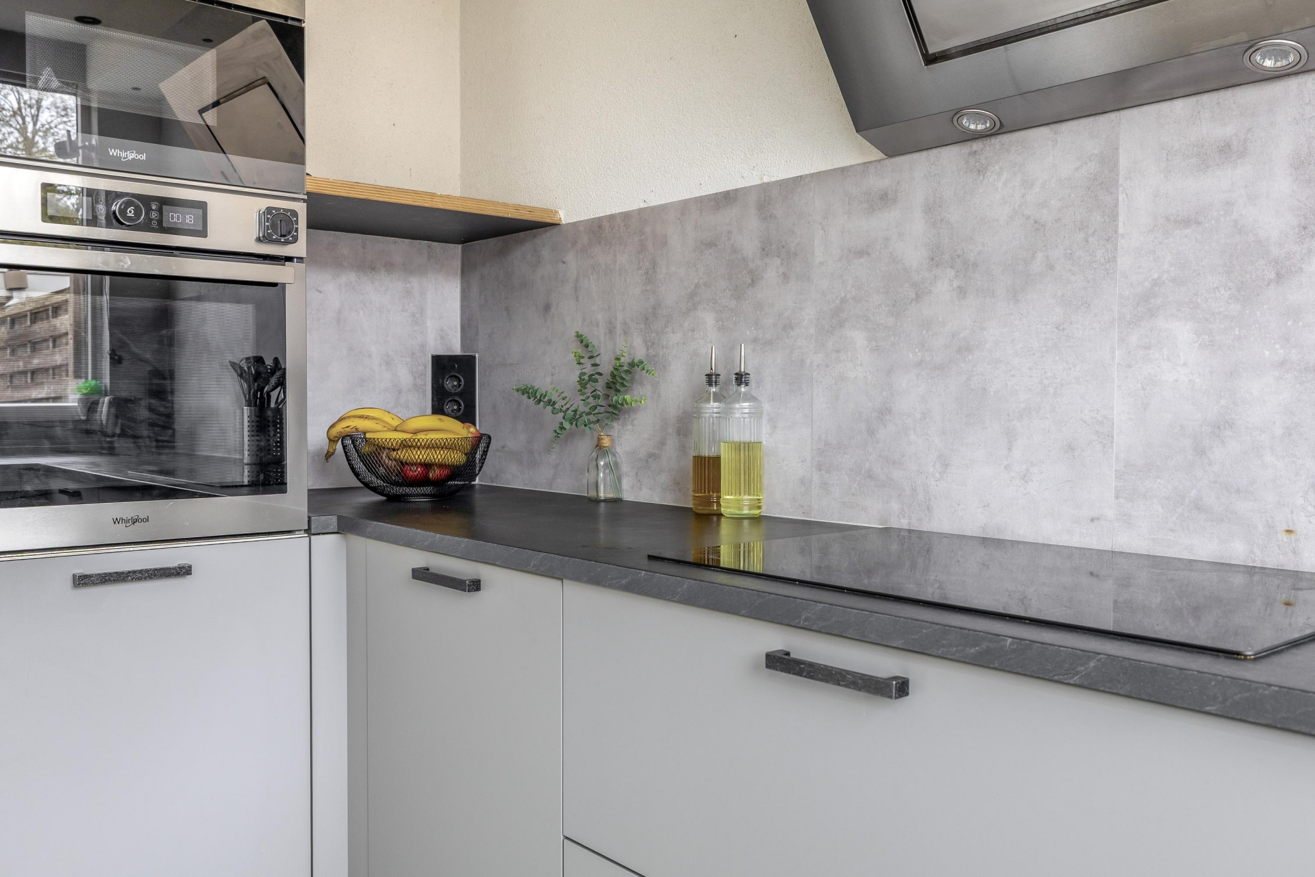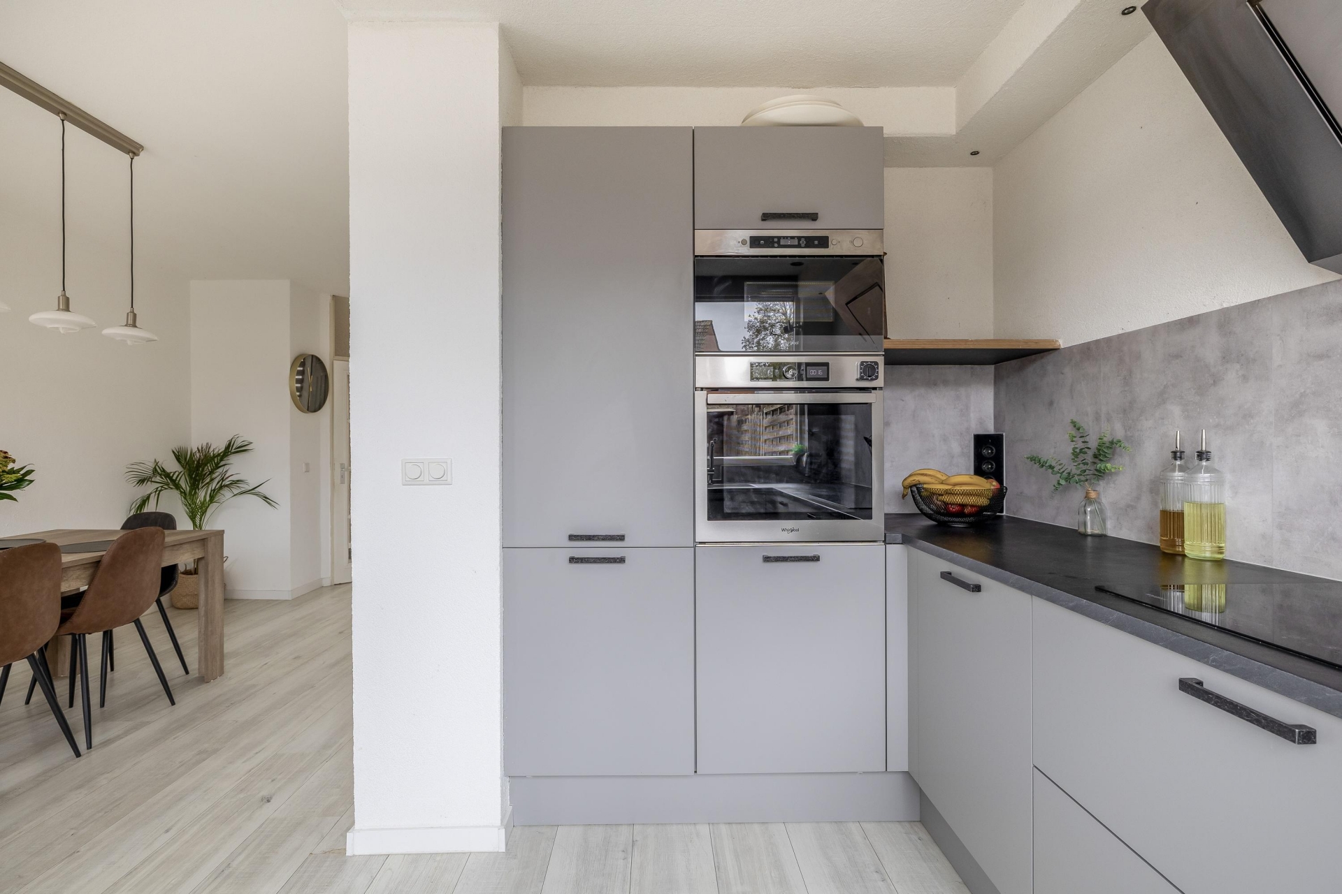 De woonkamer van circa 30 m² is praktisch en sfeervol ingericht met een mooie vloer, neutrale wandafwerking en openslaande deuren naar de tuin. Door de ligging aan de achterzijde geniet je hier van veel privacy én een fijne lichtinval. De half open keuken aan de achterzijde is in 2022 volledig vernieuwd en voorzien van diverse inbouwapparatuur. De strakke afwerking, slimme opstelling en het moderne kleurenpalet maken deze ruimte tot een echte eyecatcher én een praktische plek om te koken en samen te komen.