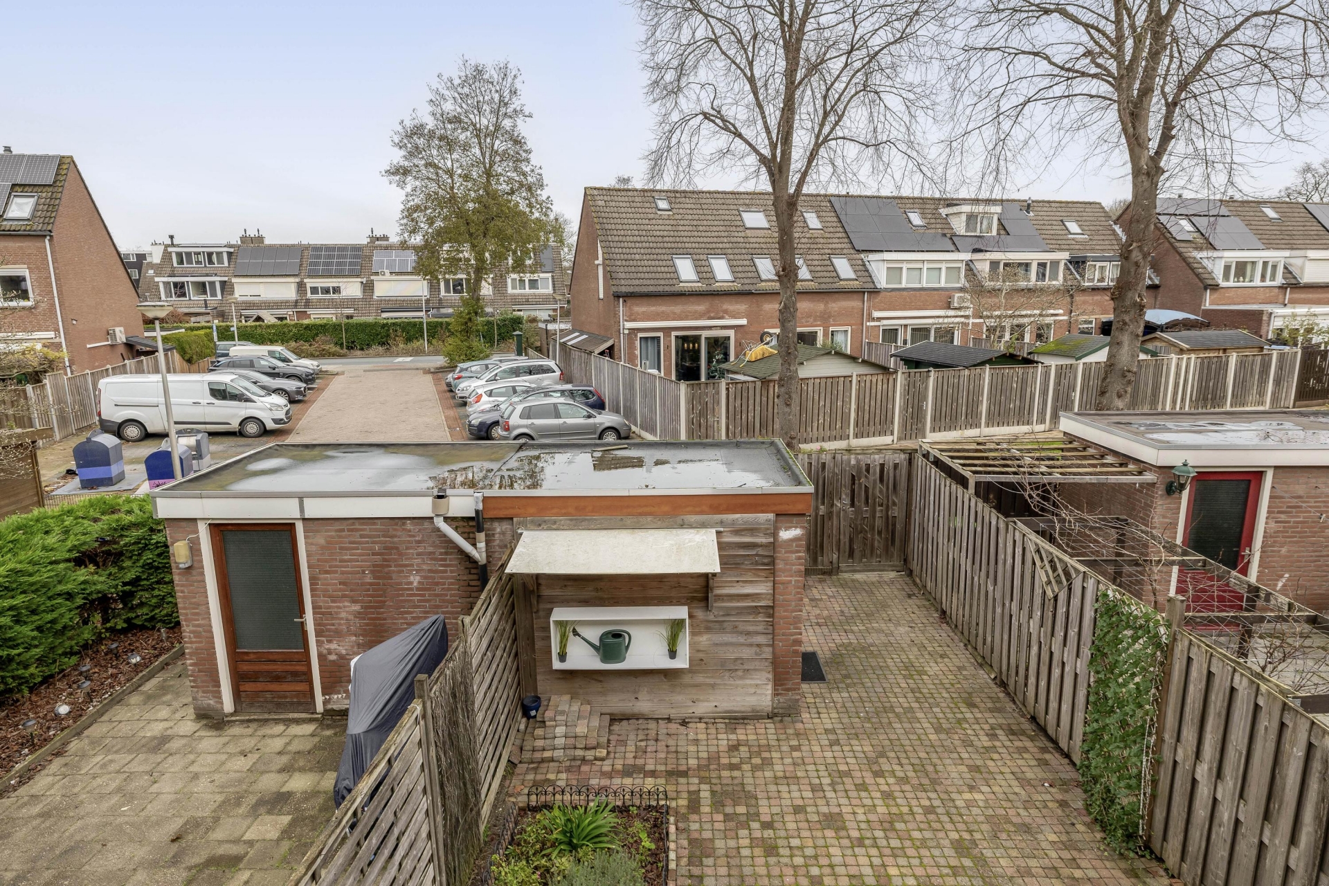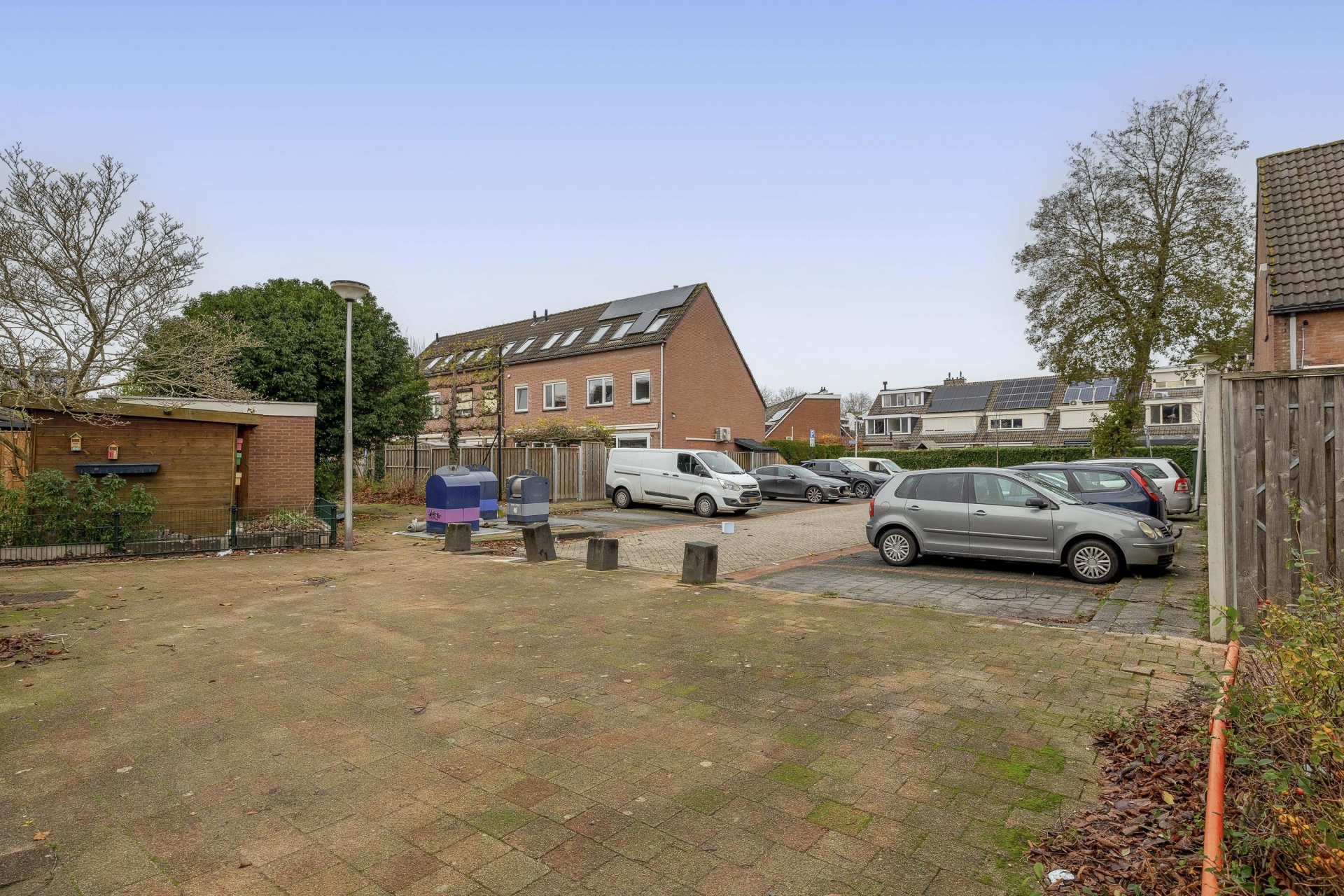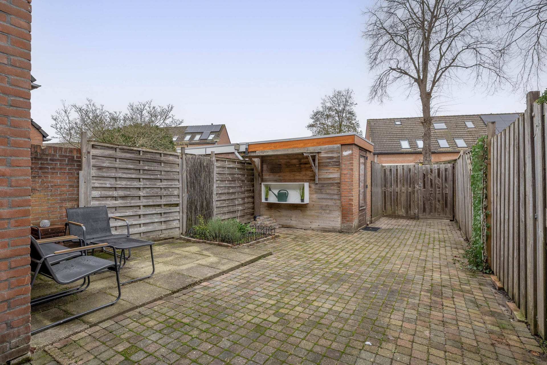 De achtertuin is ongeveer 50 m² groot, netjes aangelegd en voorzien van een achterom. Door de ligging op het noordoosten heb je hier in de ochtend en vroege middag zon – ideaal voor een ontbijtje in de buitenlucht. De tuin grenst aan een groenstrook, waardoor je extra veel privacy ervaart. In de vrijstaande stenen berging is plek voor fietsen en tuinspullen. Aan de voorzijde van het huis is er zicht op een speeltuintje en veel openbaar groen – een fijne plek voor kinderen en prettig voor het straatbeeld.