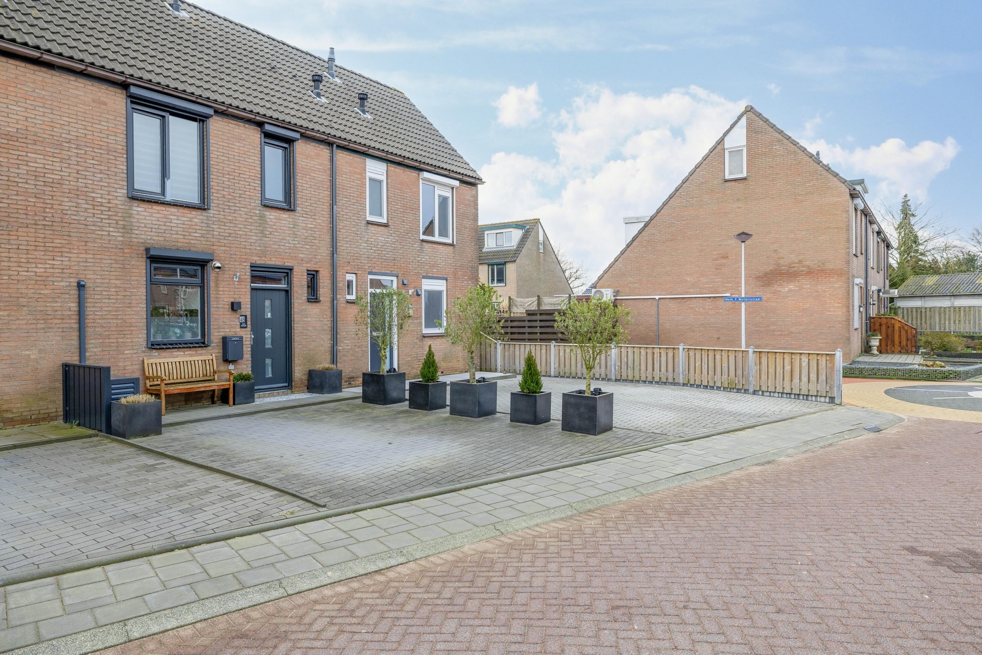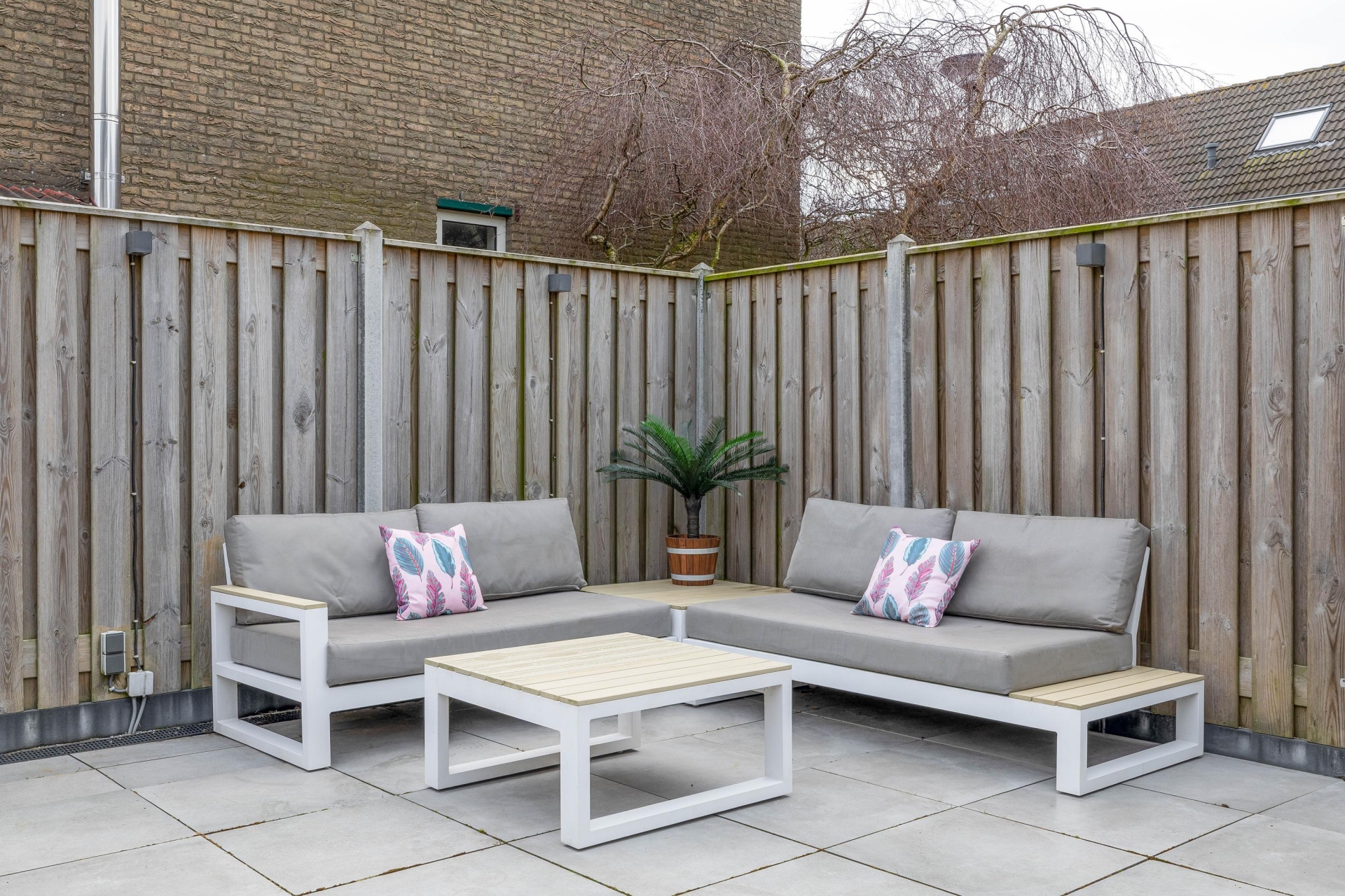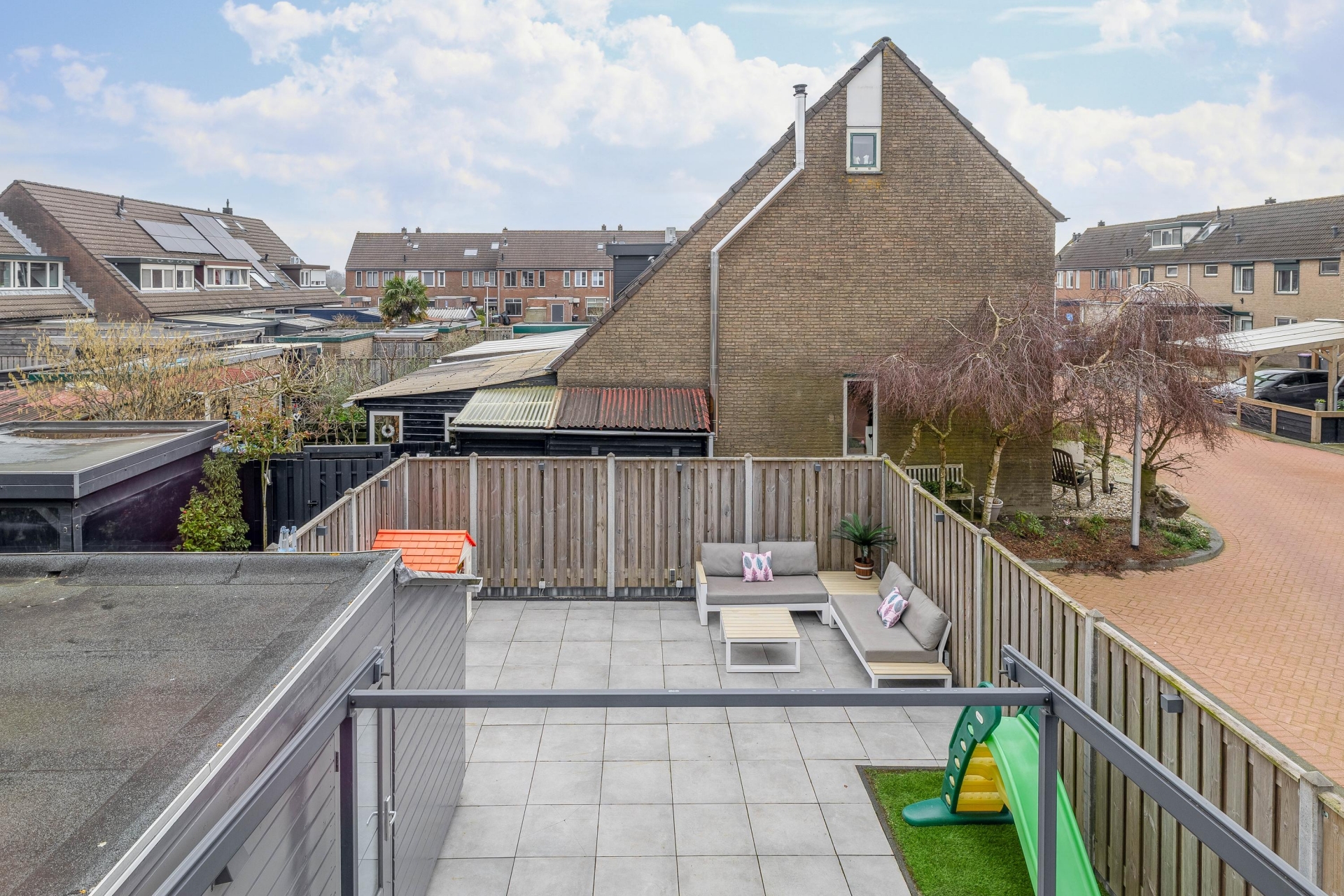 Een van de grote pluspunten van dit huis is de buitenruimte. Door de hoekligging beschik je over een voor-, zij- en achtertuin, waardoor je rondom het huis ruimte hebt. De achtertuin ligt op het zuidoosten en is verzorgd aangelegd met grote terrastegels. Hierdoor heb je meerdere plekken waar je van de zon kunt genieten.