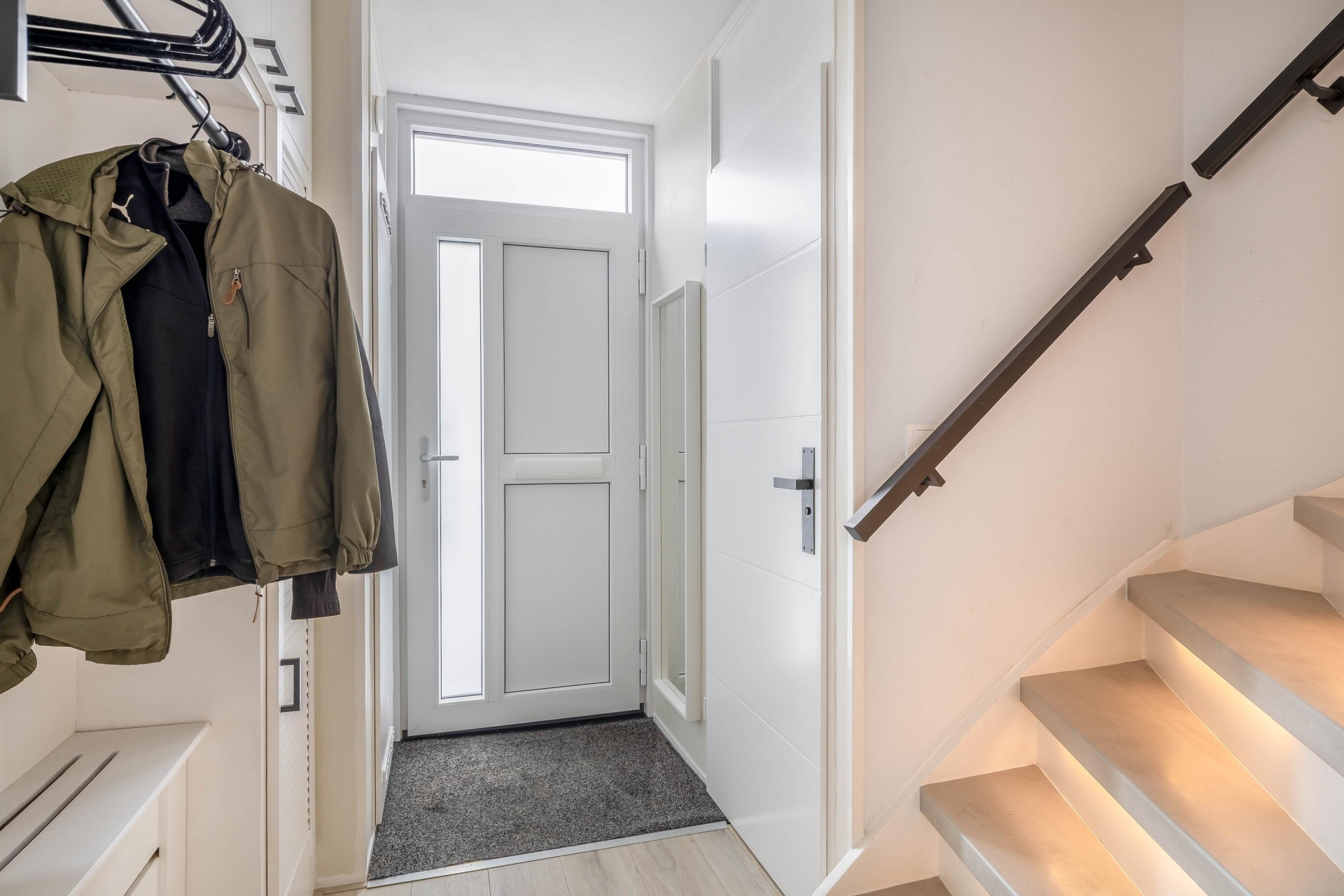 Achter de woonkamer bevindt zich nog een praktische bijkeuken met aansluitingen voor wasapparatuur en extra bergruimte. Vanuit hier heb je ook toegang tot de tuin en de berging.