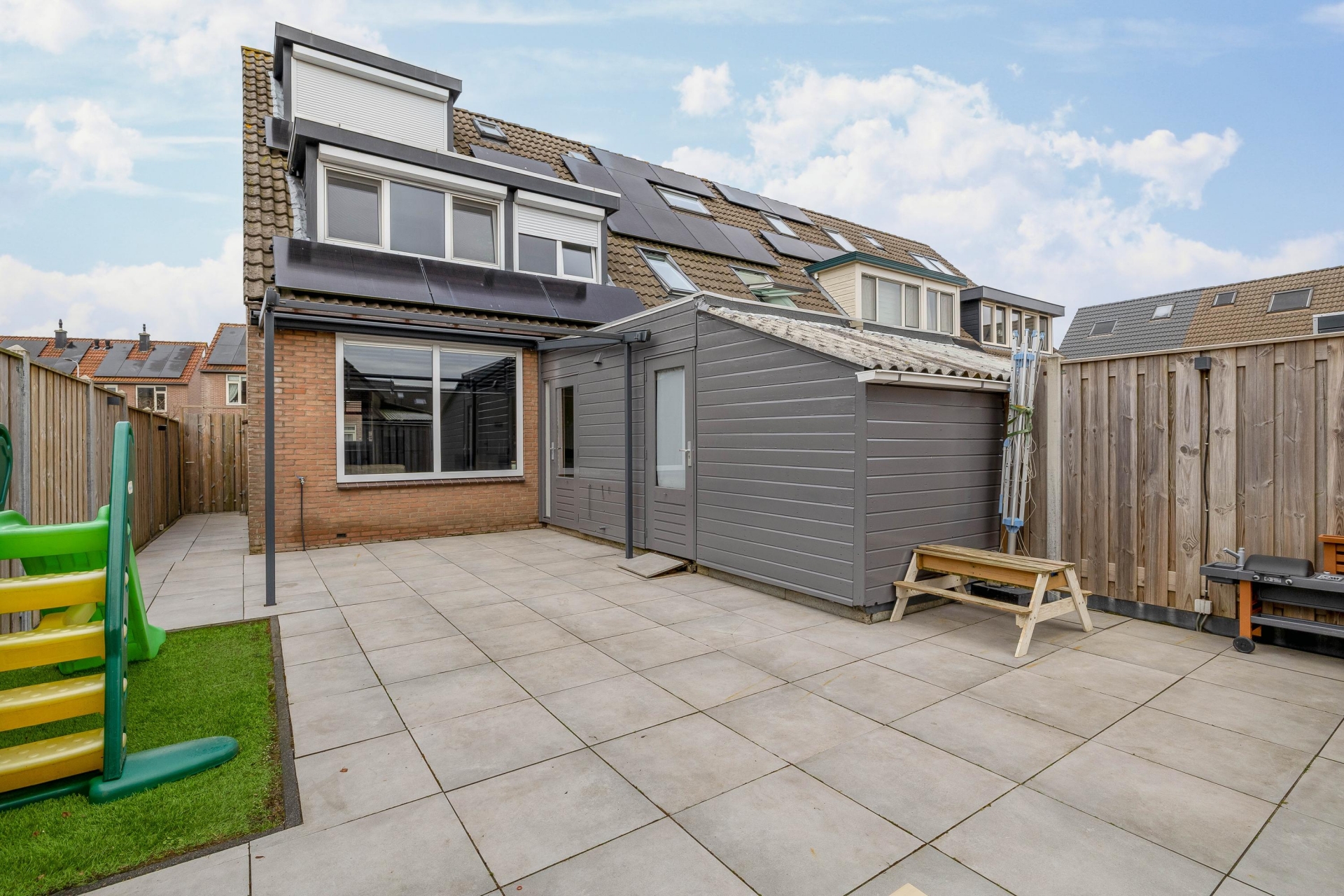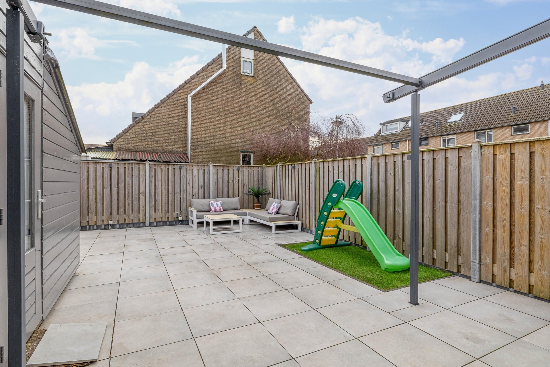 De tuin is ruim genoeg voor een gezellige loungehoek, een eettafel en speelruimte voor kinderen. Er is een praktische aangebouwde berging voor fietsen en tuinspullen.