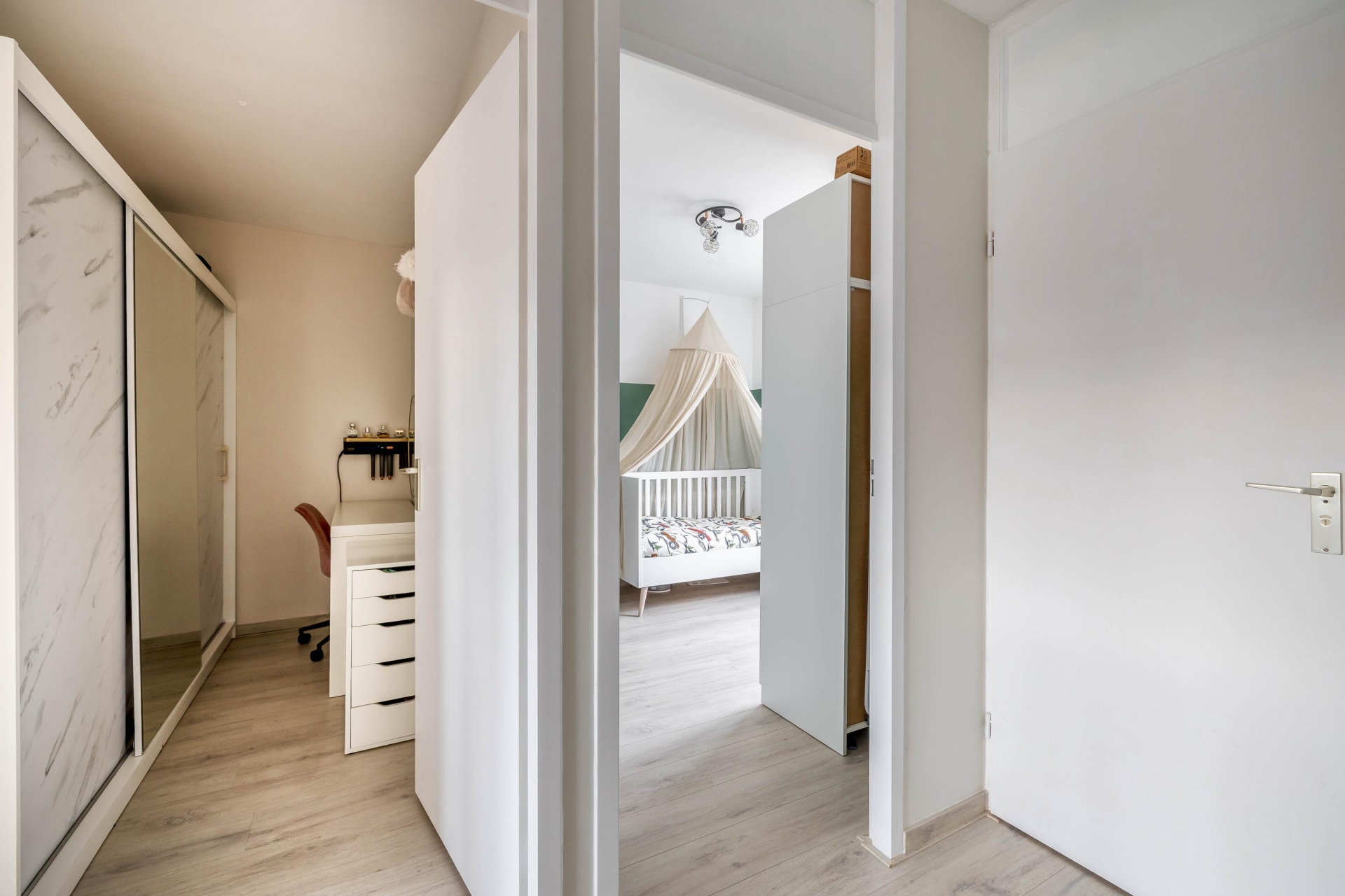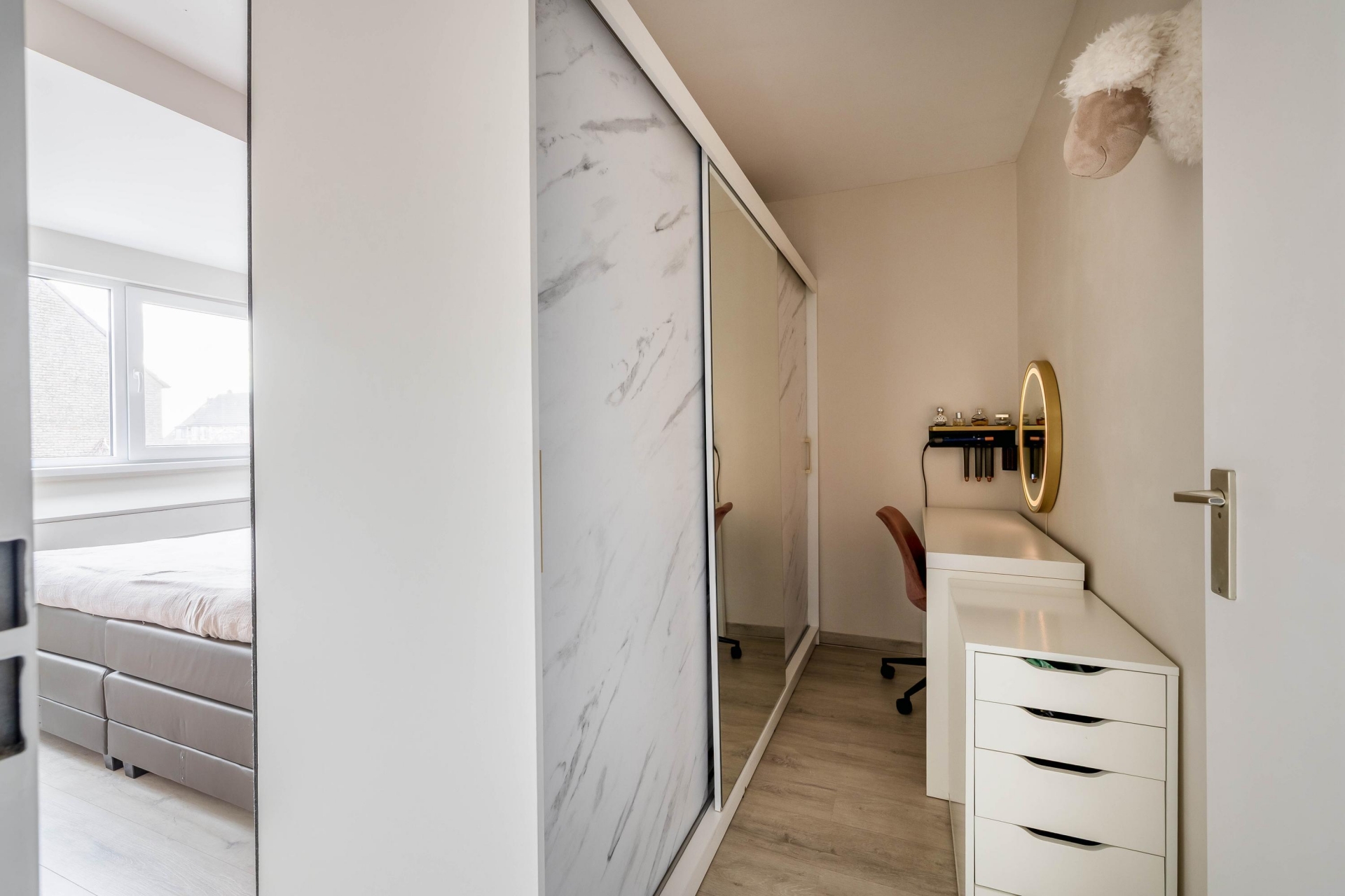 De badkamer is in 2019 vernieuwd en heeft een moderne uitstraling. Hier vind je een inloopdouche en een wastafelmeubel. Daarnaast is er op deze verdieping een separaat toilet, wat extra praktisch is voor een gezin.
