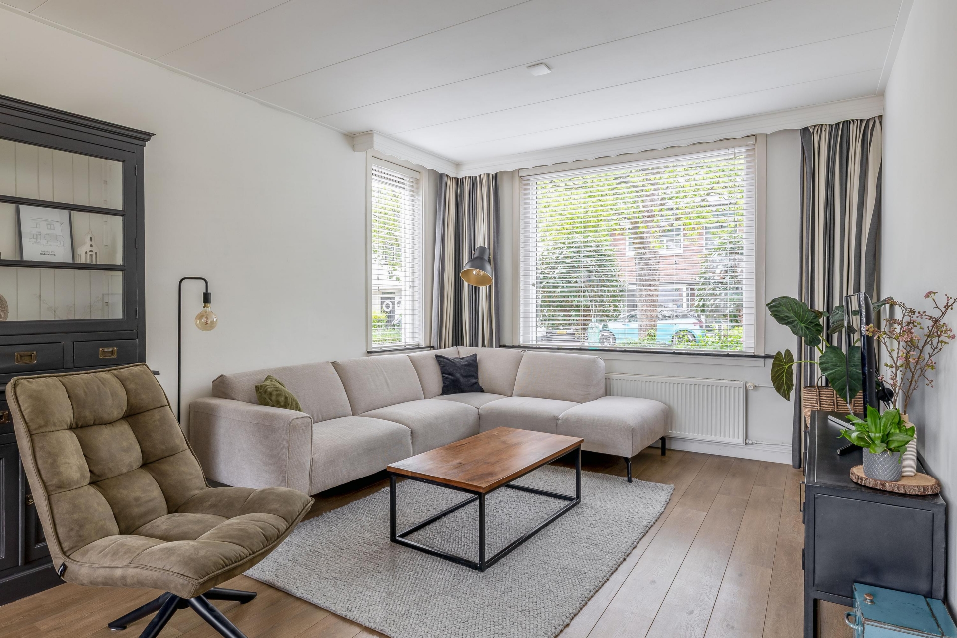 Zodra je de woonkamer binnenstapt, valt het warme en verzorgde karakter meteen op. Grote ramen aan voor- en zijkant zorgen voor veel daglicht, en het uitzicht op het groen in de straat maakt het plaatje compleet. De ruimte is praktisch ingedeeld, met een comfortabele zithoek en een gezellige eethoek bij het raam. De afwerking is keurig, met een strakke vloer, lichte wanden en een prettige, neutrale stijl: instap klaar dus.