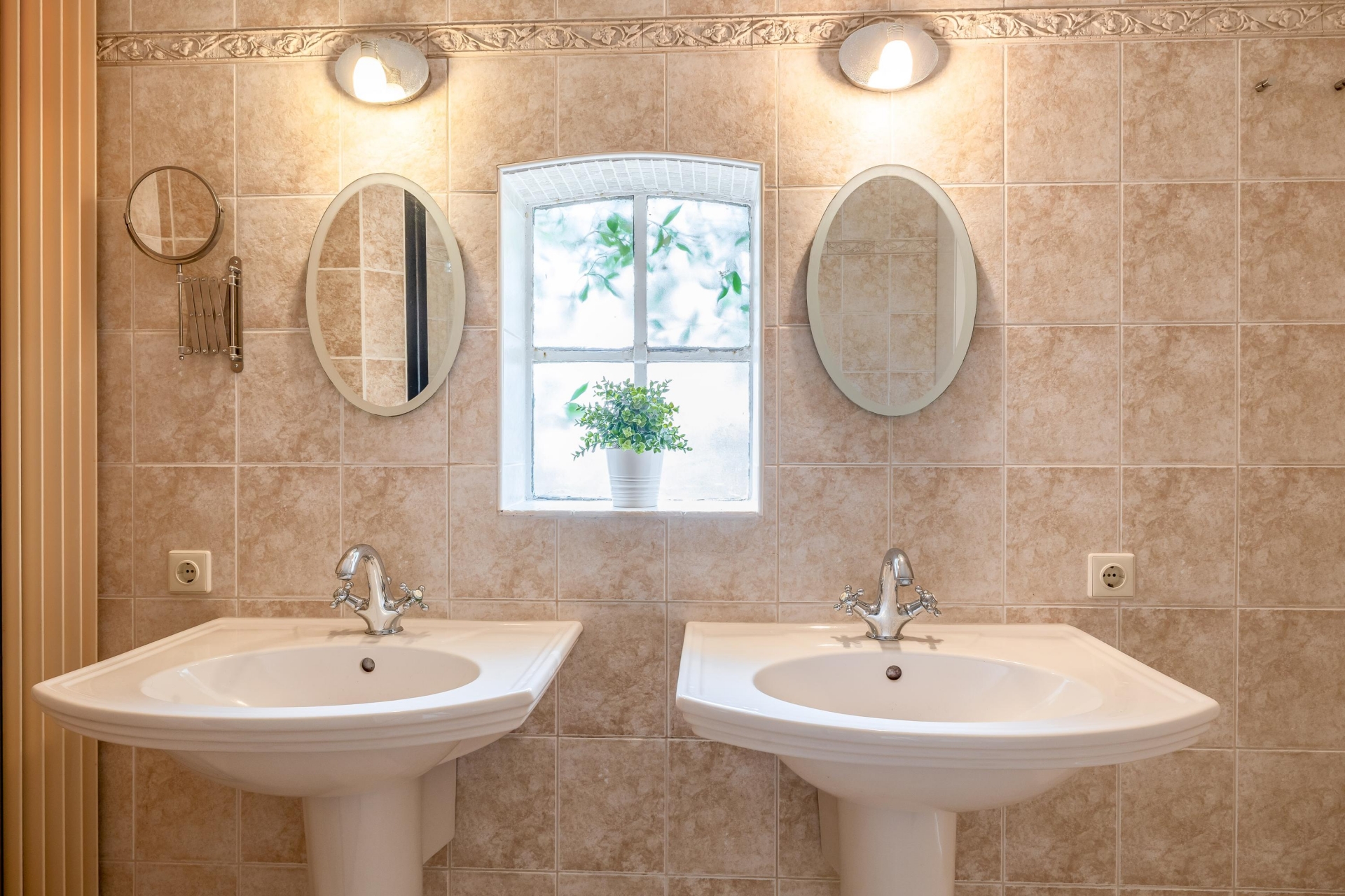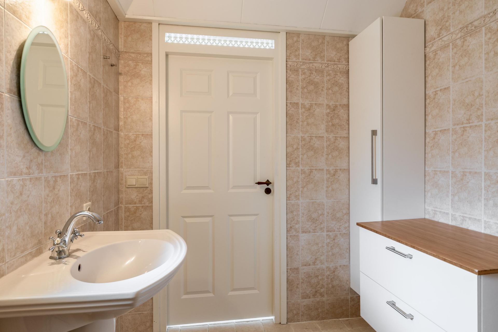 Ook de badkamer is netjes en compleet ingericht met een ruime inloopdouche en dubbele wastafel..