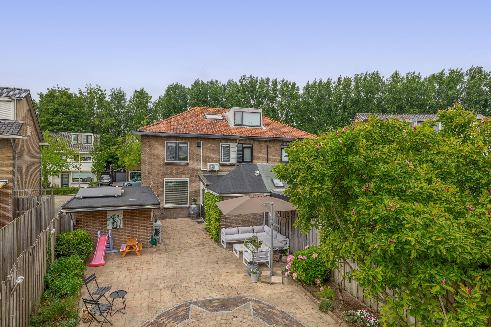 Achter het huis ligt een diepe tuin op het zuidoosten. Dankzij de lengte van het perceel geniet je hier vrijwel de hele dag van de zon. Er is meer dan genoeg ruimte voor een eettafel, loungehoek én speelplek voor kinderen.