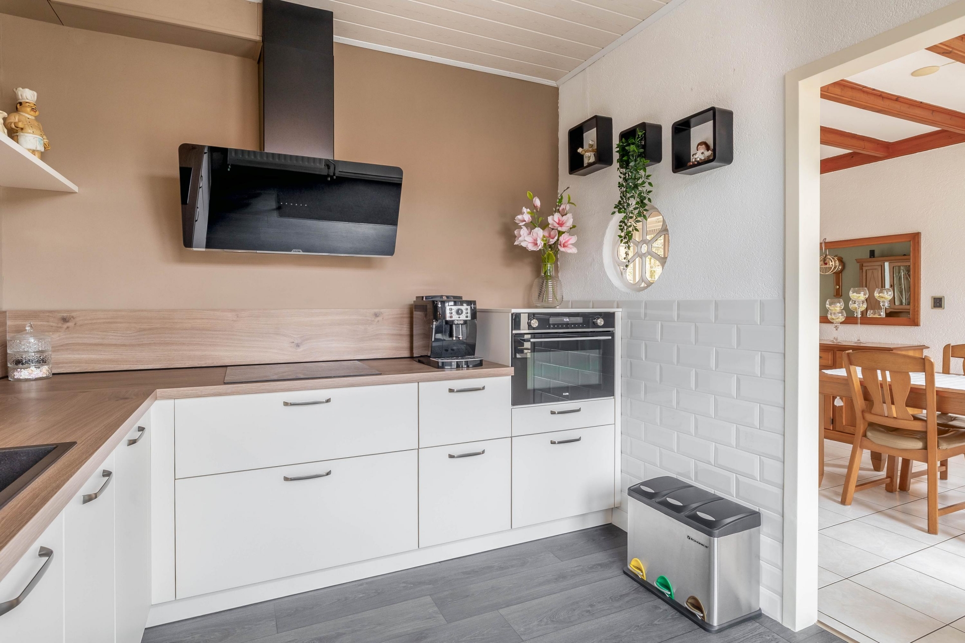 De woonkamer is groot genoeg voor zowel een gezellige zithoek als een ruime eethoek. Of je nu met het gezin aan tafel zit of vrienden over de vloer hebt, hier heb je alle ruimte. De indeling is praktisch en logisch, waardoor je de ruimte optimaal benut. Vanuit de woonkamer loop je zo door naar de keuken (vernieuwd in 2024), die in een hoekopstelling is geplaatst en voorzien is van diverse inbouwapparatuur. Een fijne plek waar je tijdens het koken altijd in contact blijft met de rest van het huis. In de hal bevindt zich bovendien een grote open ruimte (vide), die zorgt voor een extra ruimtelijk en licht gevoel bij binnenkomst.