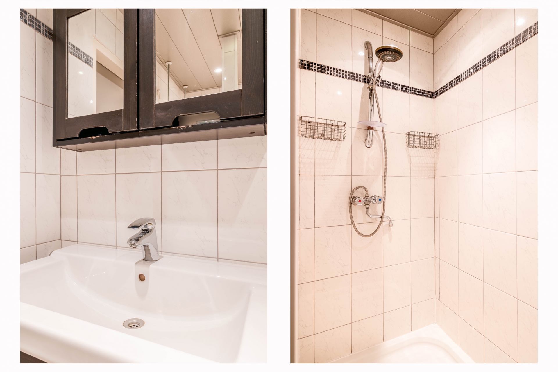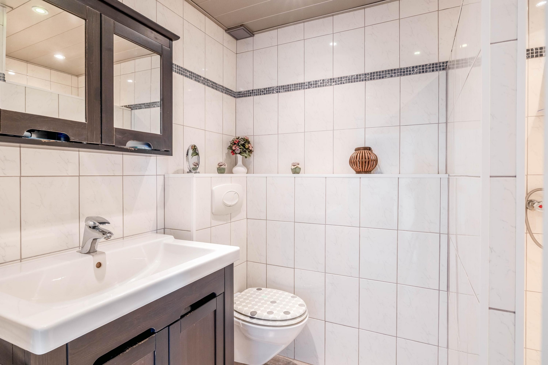 De badkamer is centraal gelegen en functioneel ingericht met een douche, wastafel en toilet. Alles wat je nodig hebt is aanwezig, met mogelijkheden om het naar eigen smaak aan te passen.