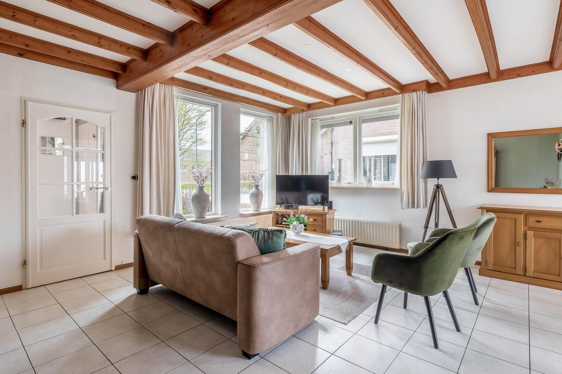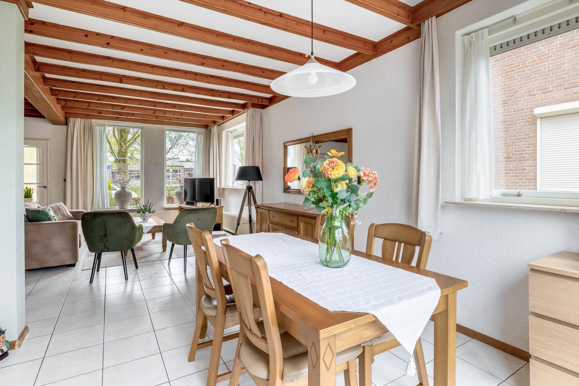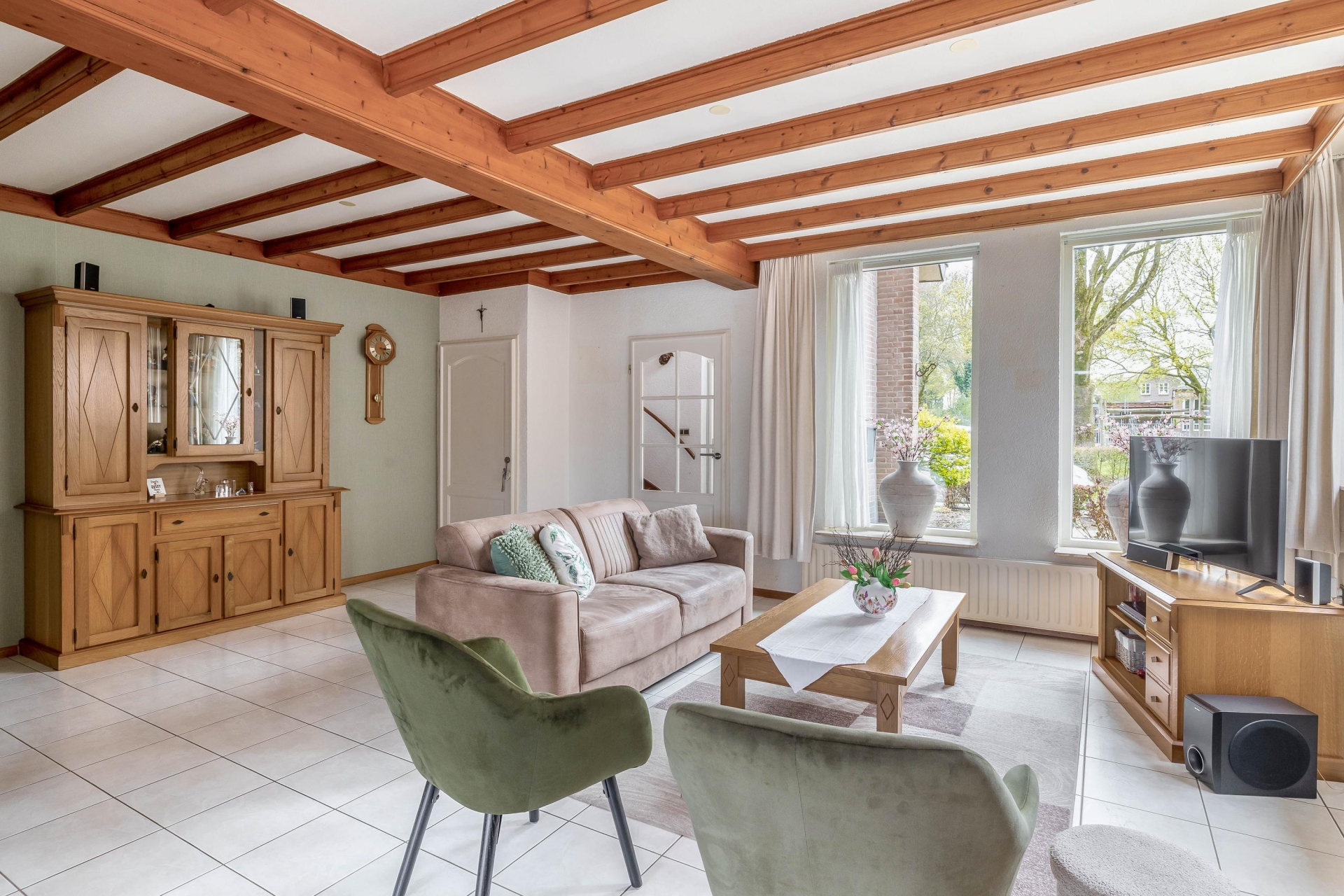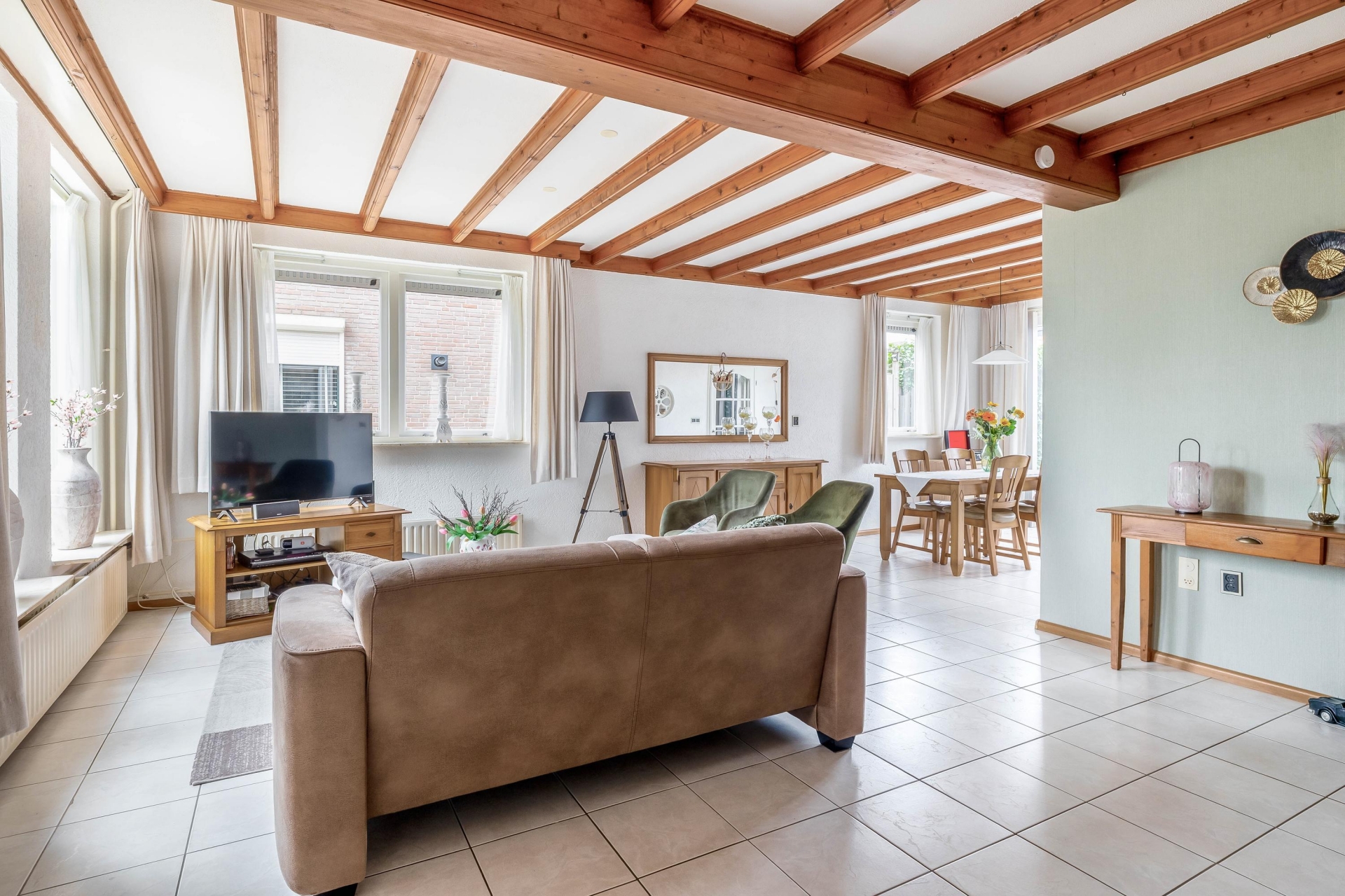 Deze verrassend ruime twee-onder-een-kapwoning aan de Kloosterlaan in Langeweg biedt precies wat je zoekt als doorstromer: ruimte, comfort en een fijne indeling. Zodra je binnenkomt valt direct de lichte en royale woonkamer op. Dankzij de grote raampartijen komt het daglicht hier volop naar binnen, wat zorgt voor een prettige en open sfeer. De karakteristieke houten balken geven de ruimte net dat beetje extra warmte en uitstraling.