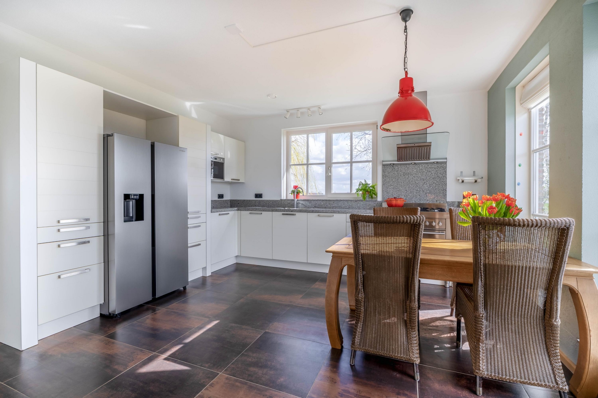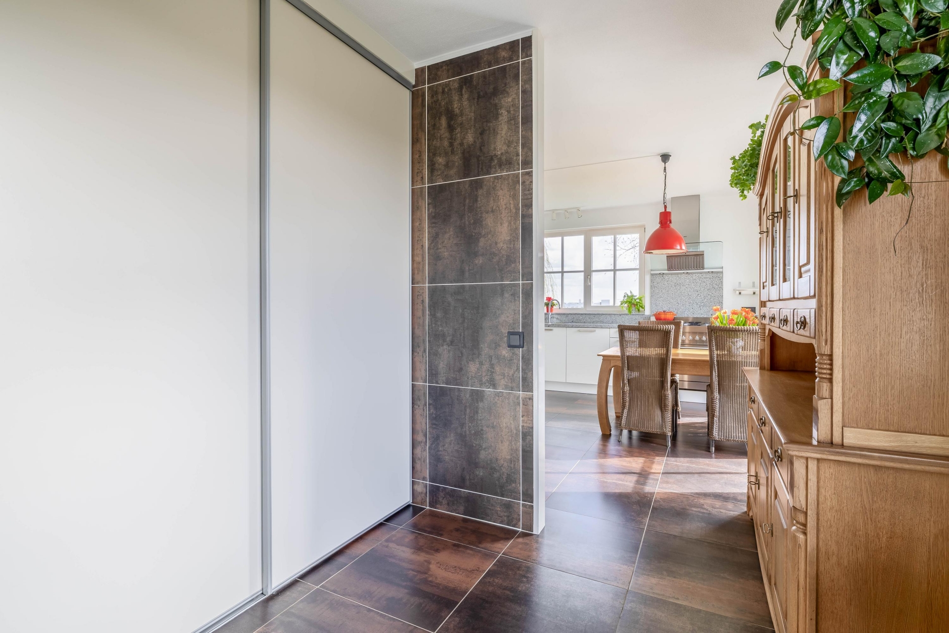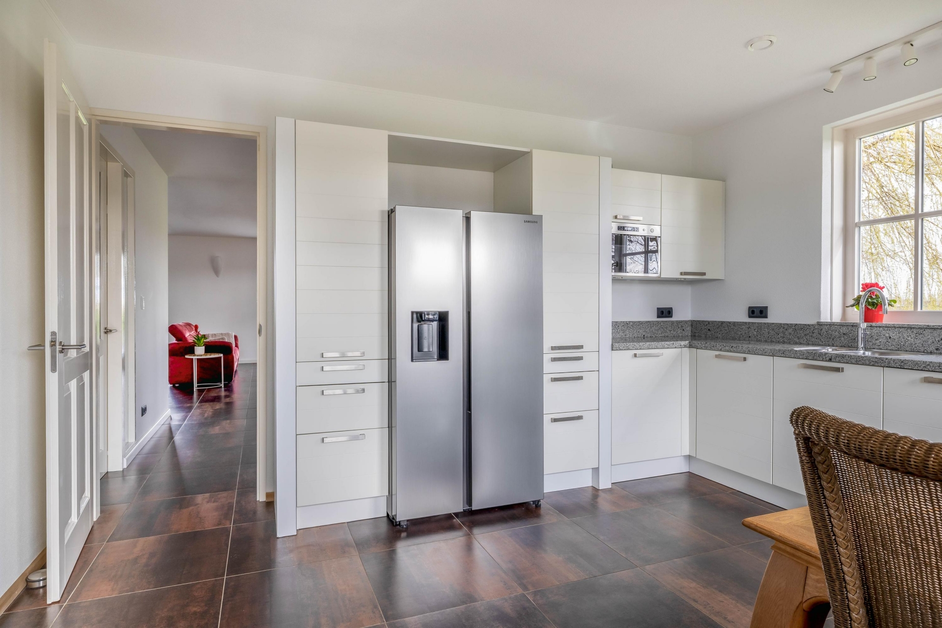 Aan de voorzijde vind je de woonkeuken, die praktisch is ingericht en voldoende ruimte biedt om uitgebreid te koken en samen te komen. Aansluitend is de praktische bijkeuken met vaste schuifkastenwand en aansluitingen voor wasmachine en droger.