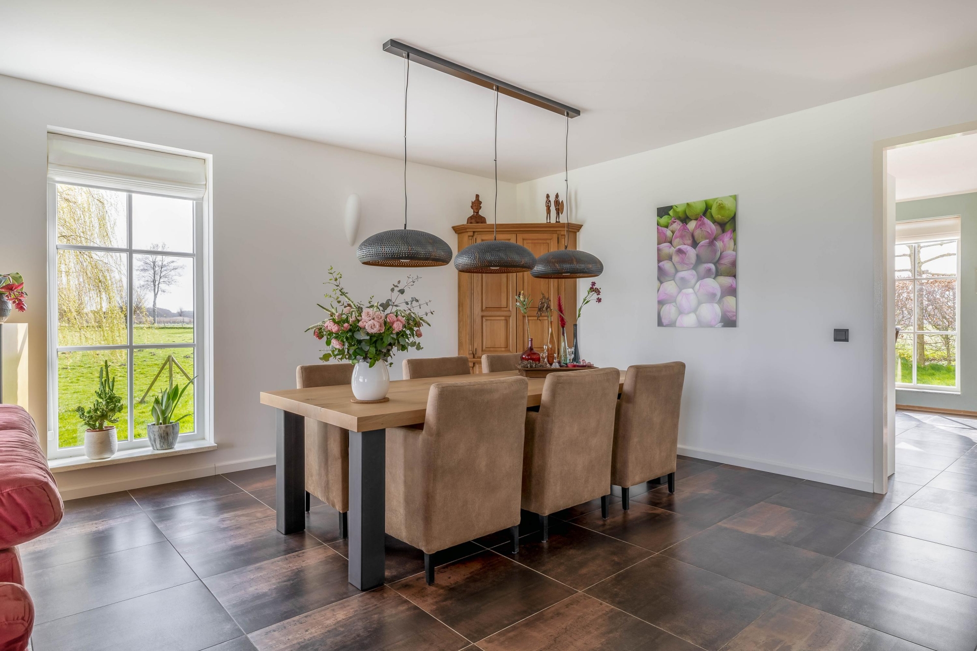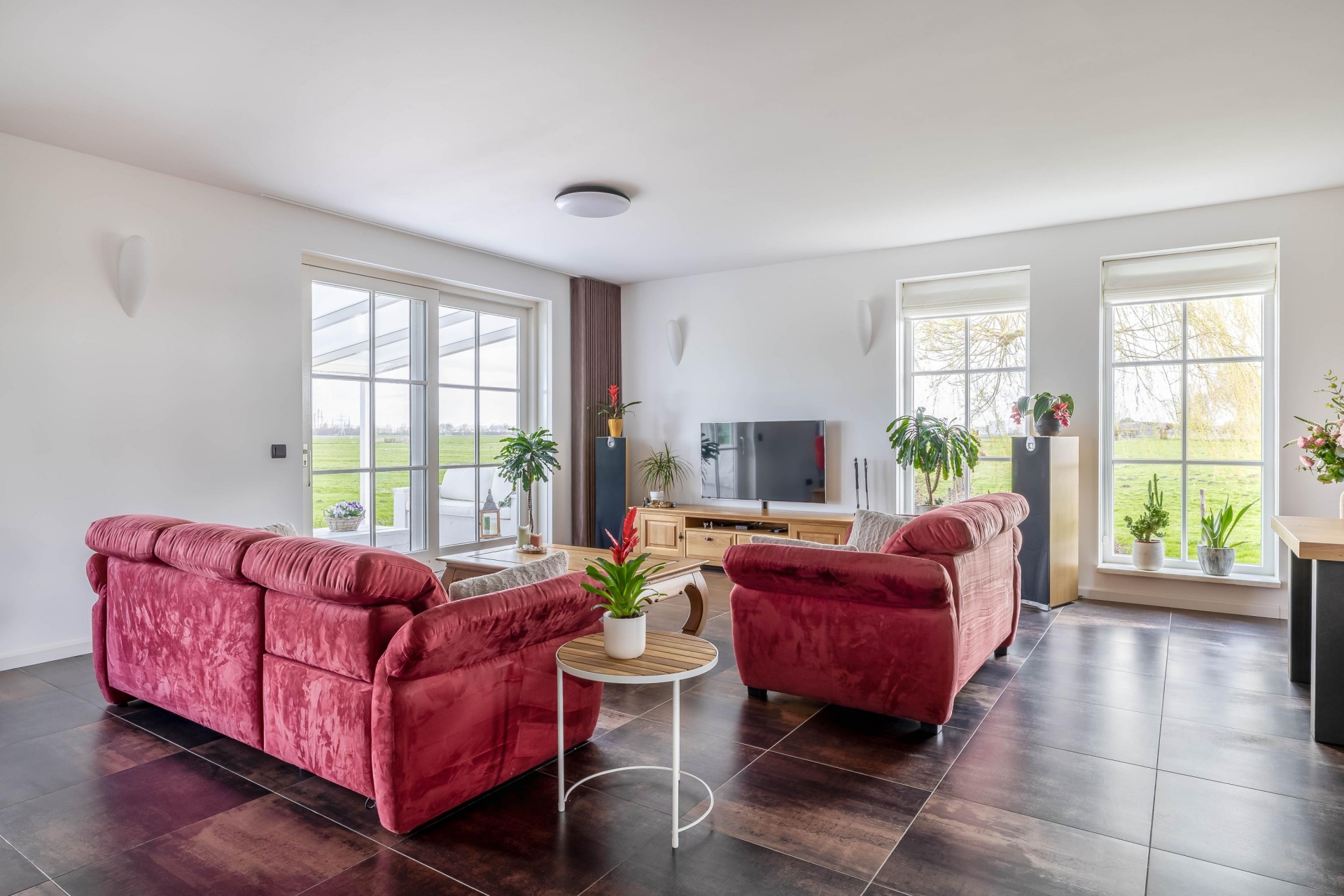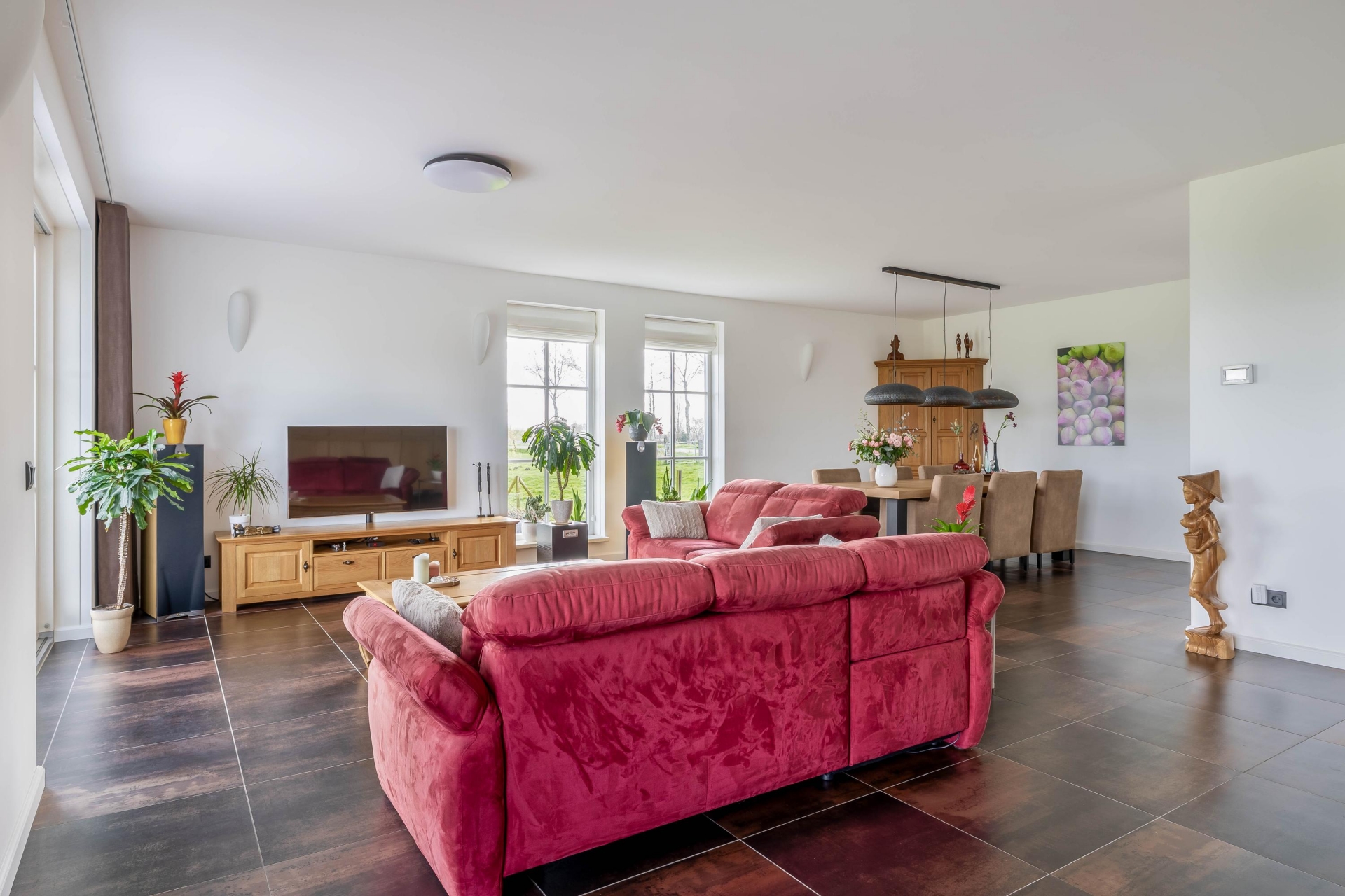De woonkamer is met circa 63 m² een echte eyecatcher en vormt het hart van het huis. Dankzij de grote raampartijen en de ligging rondom geniet je hier de hele dag van licht en een prachtig vrij uitzicht over de omliggende weilanden. De ruimte voelt open en comfortabel aan, met volop mogelijkheden voor een royale zithoek en een grote eettafel. Vanuit de leefruimte heb je direct toegang tot de aangebouwde overkapping, een plek waar binnen en buiten naadloos in elkaar overlopen. Hier zit je beschut en geniet je optimaal van het buitenleven, ongeacht het seizoen.
