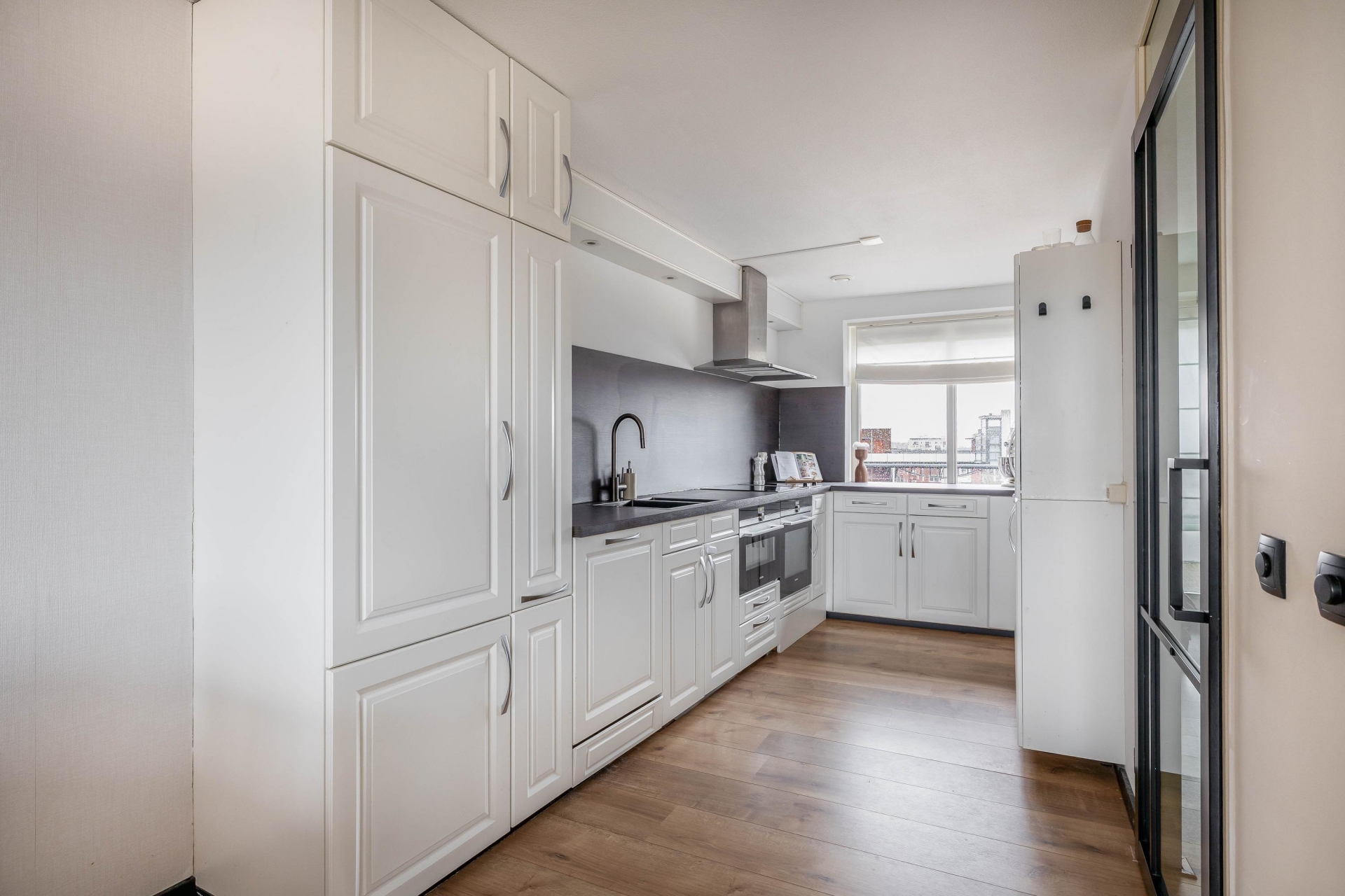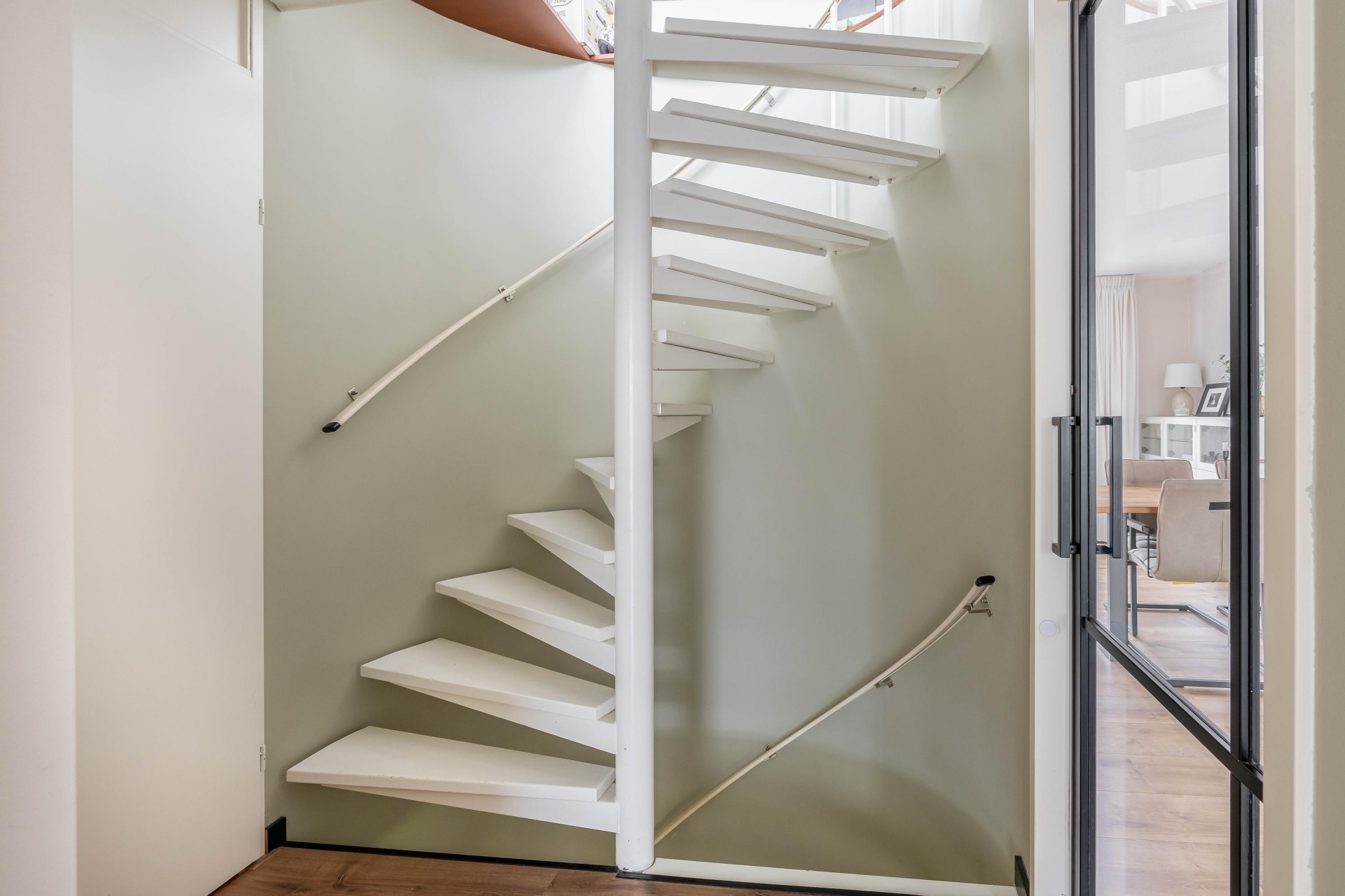 De keuken is uitgevoerd in een klassieke stijl met witte fronten en donker werkblad en is van alle gemakken voorzien. Dankzij het slimme ontwerp heb je hier veel werk- en opbergruimte. Vanuit de entree van de woning loop je via een trap door naar het ruime dakterras. Dit zonnige terras biedt de hele dag zon en is groot genoeg voor een loungeset – een heerlijke plek om buiten te eten of gewoon te genieten van de rust.