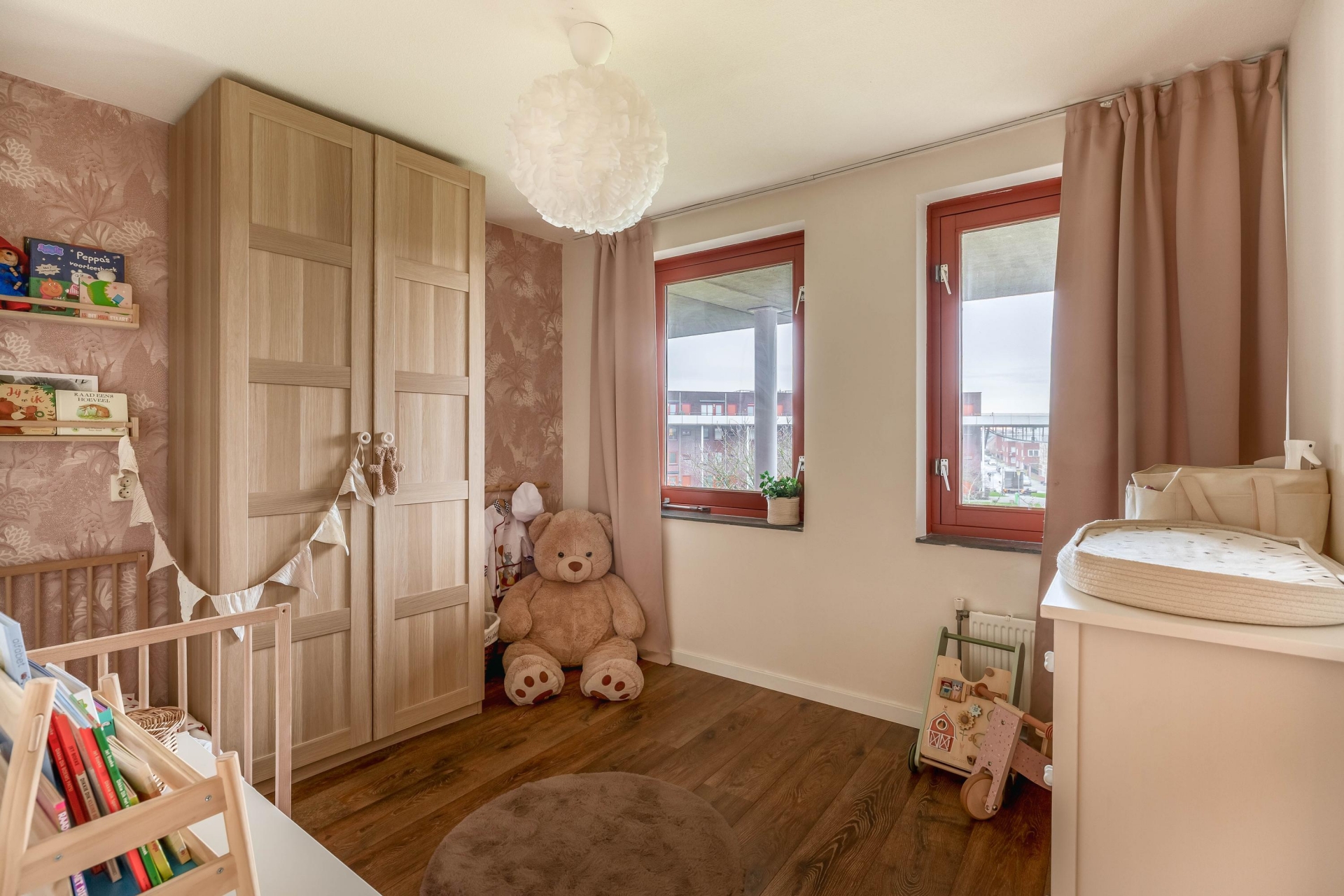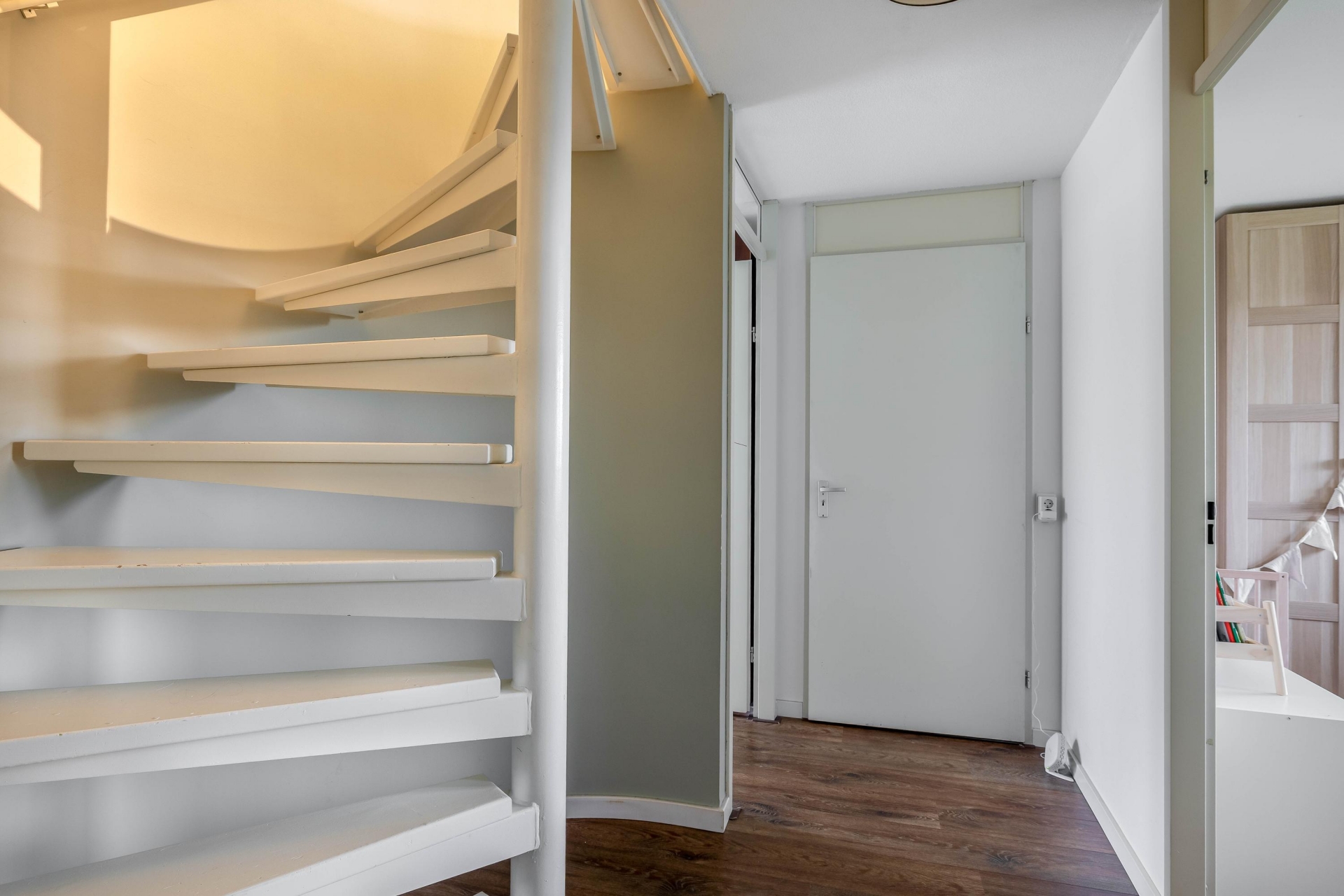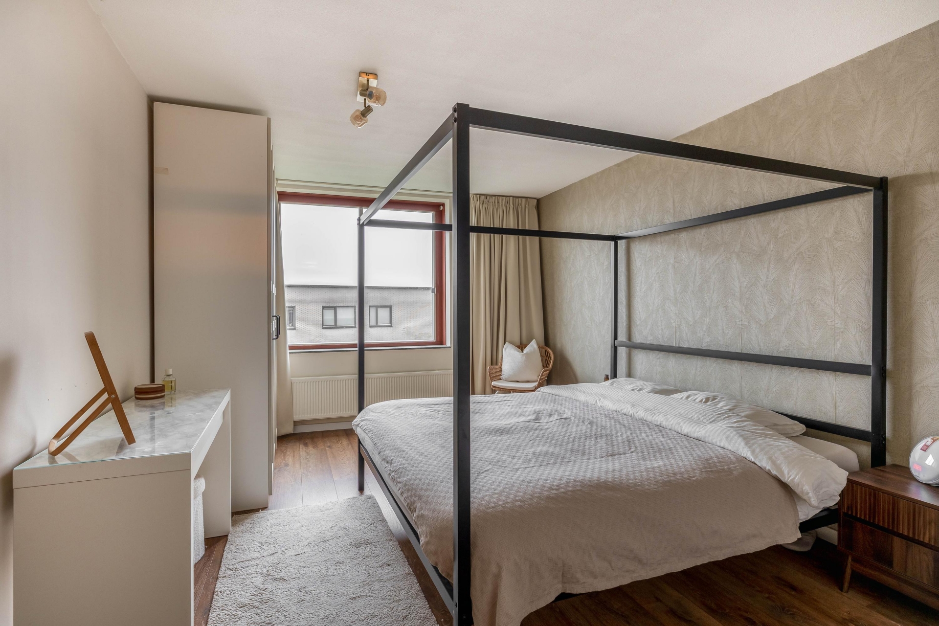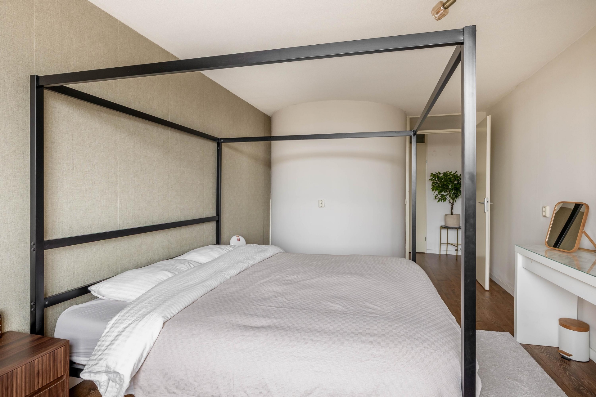 Op woonlaag onder de woonkamer bevinden zich drie slaapkamers, waarvan de grootste royaal is opgezet en ruimte biedt voor een tweepersoonsbed en een grote kast. De andere twee kamers zijn ideaal als kinderkamer, werkkamer of logeerruimte. De speelse indeling zorgt ervoor dat alle kamers goed tot hun recht komen en functioneel ingedeeld zijn.