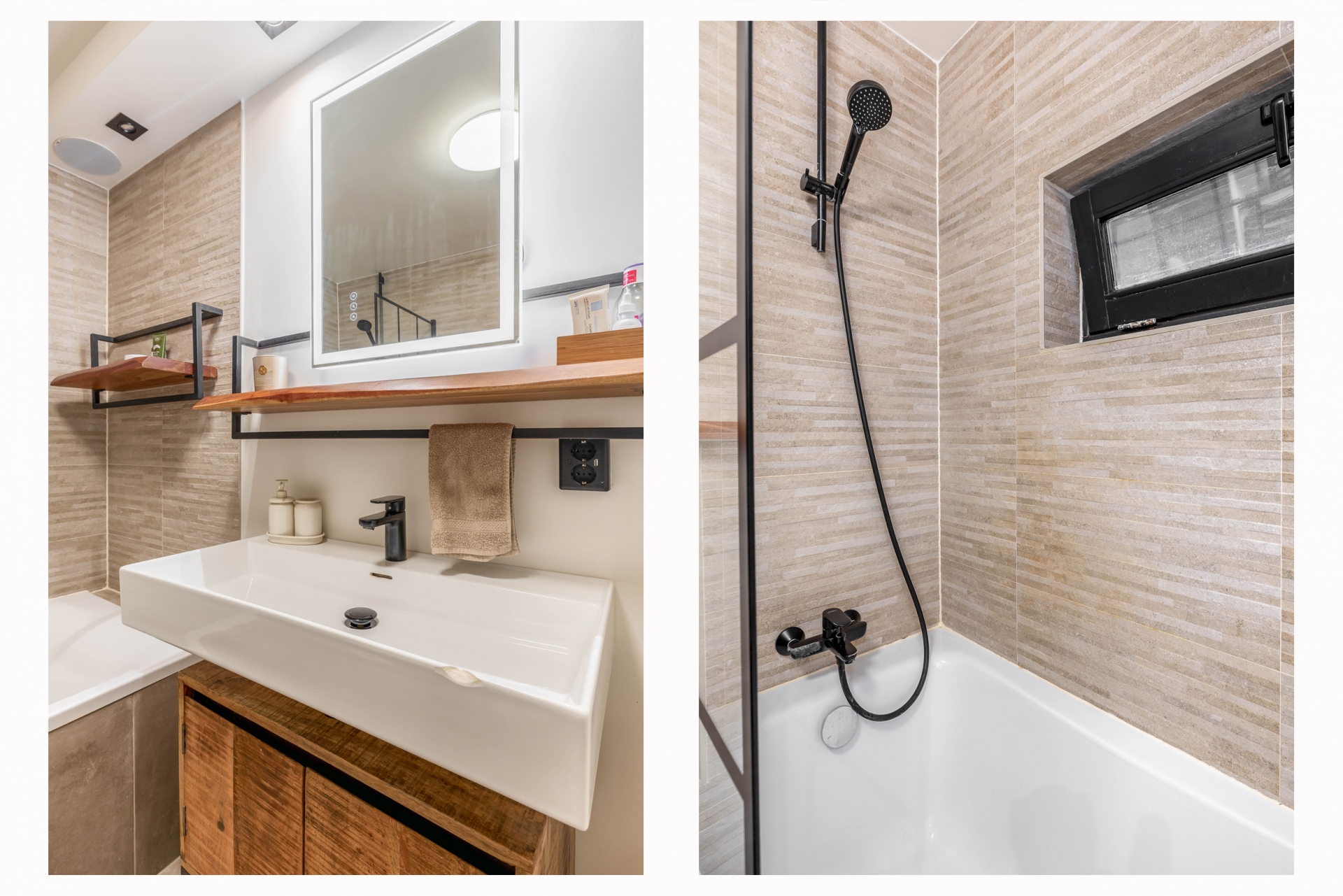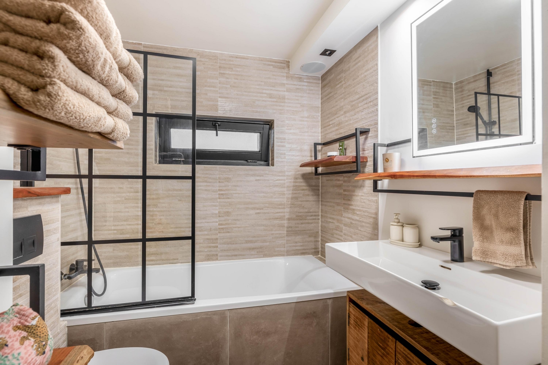 De badkamer is neutraal en fris afgewerkt en beschikt over een bad met douche, wastafel, toilet en wasmachine en droger opstelling.